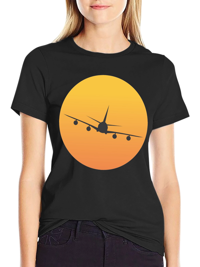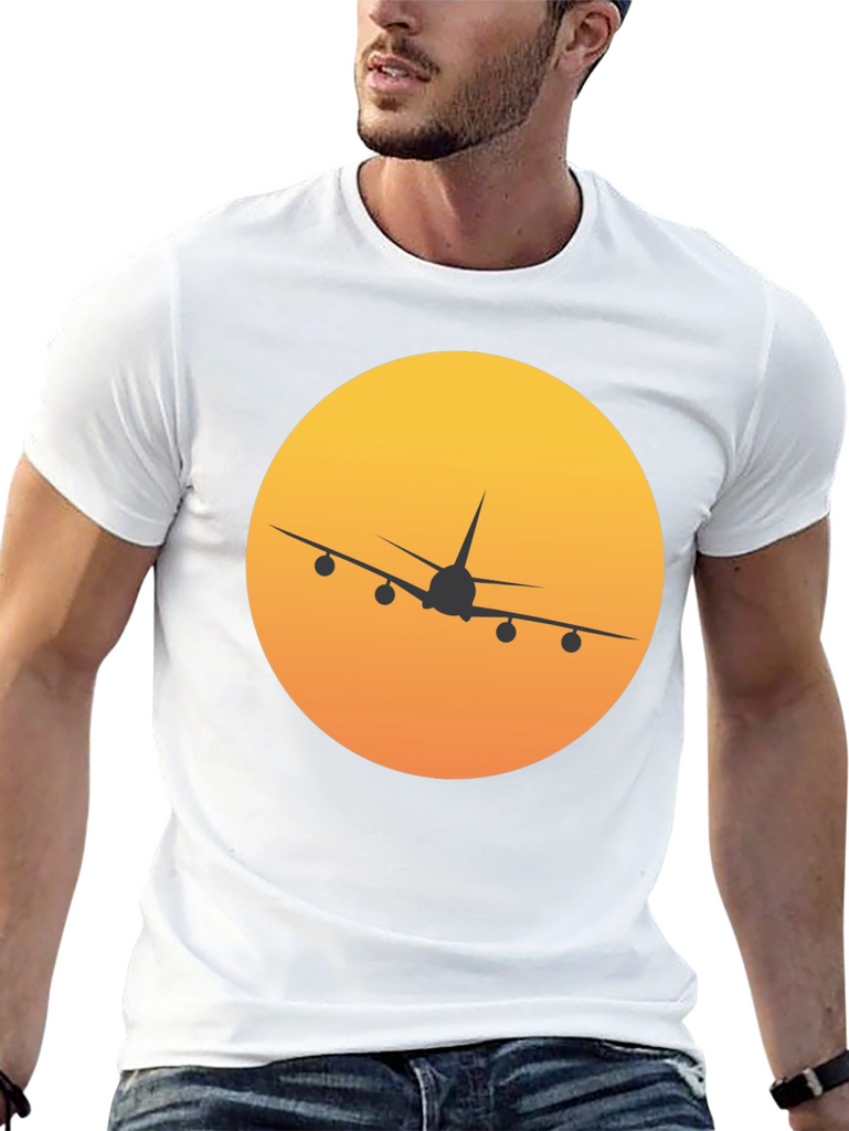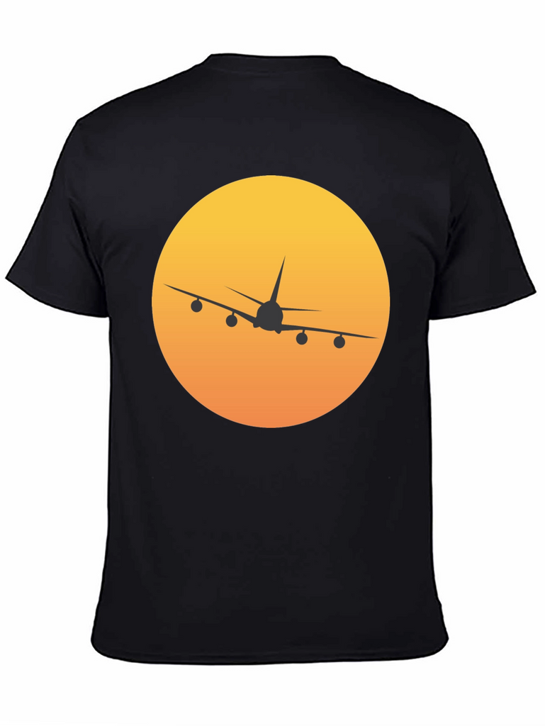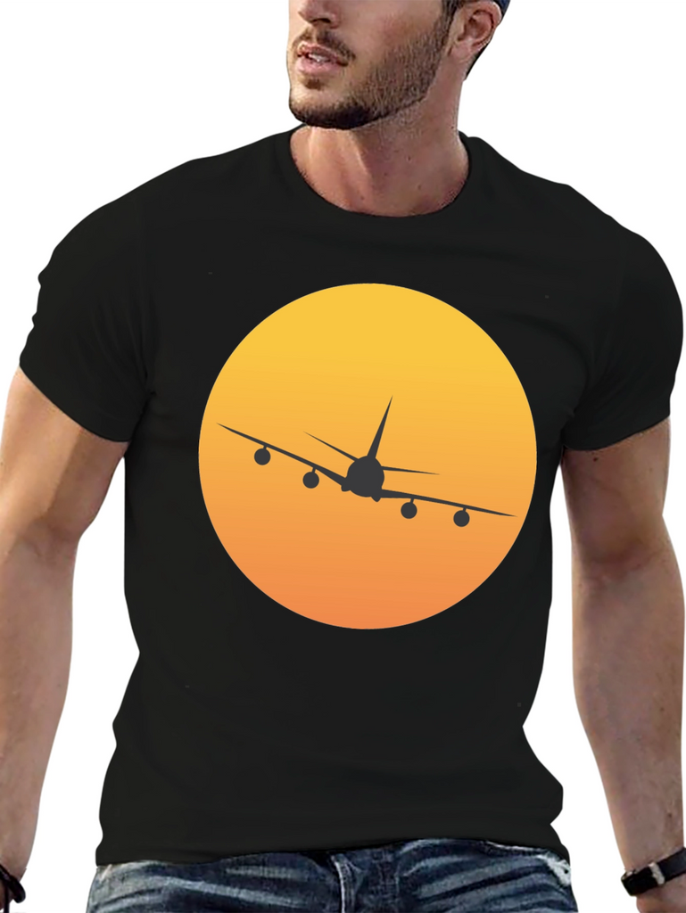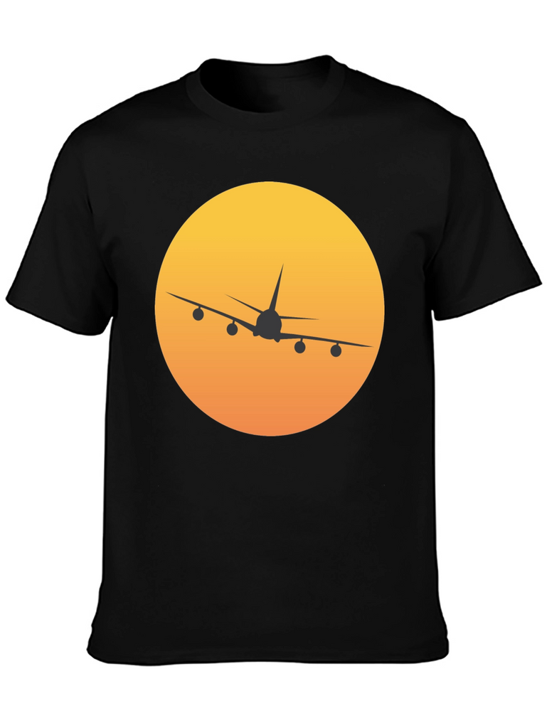 Soar into style with this eye-catching black graphic tee! The design features a sleek airplane silhouette set against a vibrant, gradient yellow and orange circle, reminiscent of a setting sun. Crafted from what appears to be soft, breathable cotton, this tee offers both comfort and style. The classic crew neck and short sleeves make it a versatile addition to any wardrobe. Perfect for aviation enthusiasts, travelers, or anyone who appreciates unique graphic designs. Wear it casually with jeans or dress it up with a jacket for a night out. Make a statement with this must-have tee!