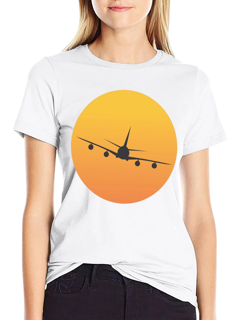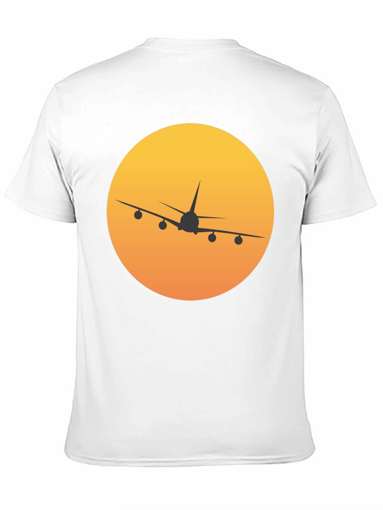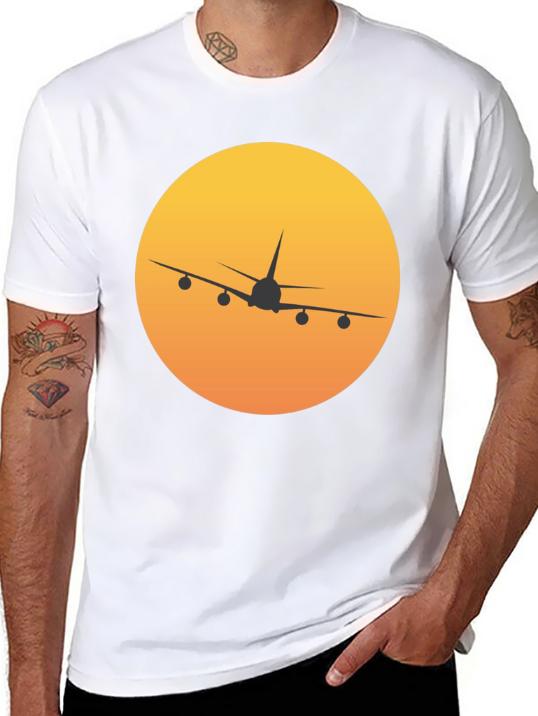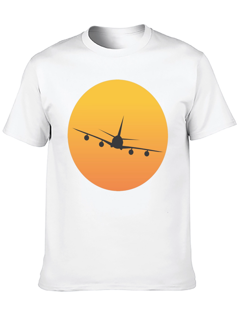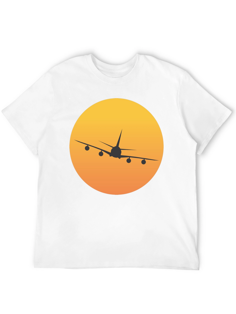 Soar into style with this eye-catching black graphic tee! The design features a sleek airplane silhouette set against a vibrant, gradient yellow and orange circle, reminiscent of a setting sun. Crafted from what appears to be soft, breathable cotton, this tee offers both comfort and style. The classic crew neck and short sleeves make it a versatile addition to any wardrobe. Perfect for aviation enthusiasts, travelers, or anyone who appreciates unique graphic designs. Wear it casually with jeans or dress it up with a jacket for a night out. Make a statement with this must-have tee!