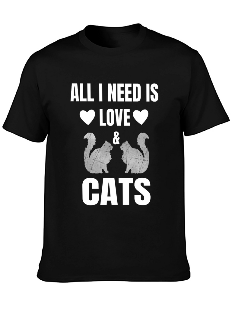 Show your love for cats with this stylish black t-shirt! Featuring a bold, white graphic that reads "All I Need is Love & Cats" accompanied by cute cat silhouettes. This shirt is made from a comfortable material perfect for everyday wear. Whether you're lounging at home, running errands, or meeting friends, this t-shirt lets you express your passion for feline friends in a fashionable way. A great gift for any cat lover!