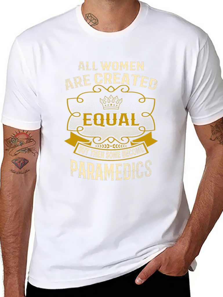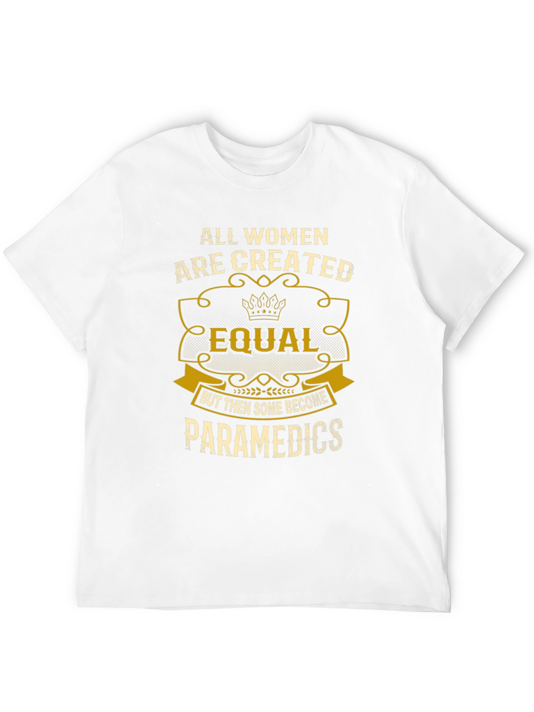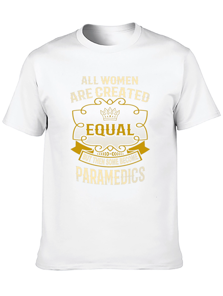 This black t-shirt features a humorous and empowering message. The design states, "All women are created equal, but then some become paramedics." The graphic has an ornate frame with a crown element. Made from a comfortable-looking fabric, this tee is perfect for female paramedics who want to show off their pride and sense of humor. It can be worn casually or as part of a relaxed work ensemble. It’s a fun and thoughtful gift idea for the everyday hero in your life.