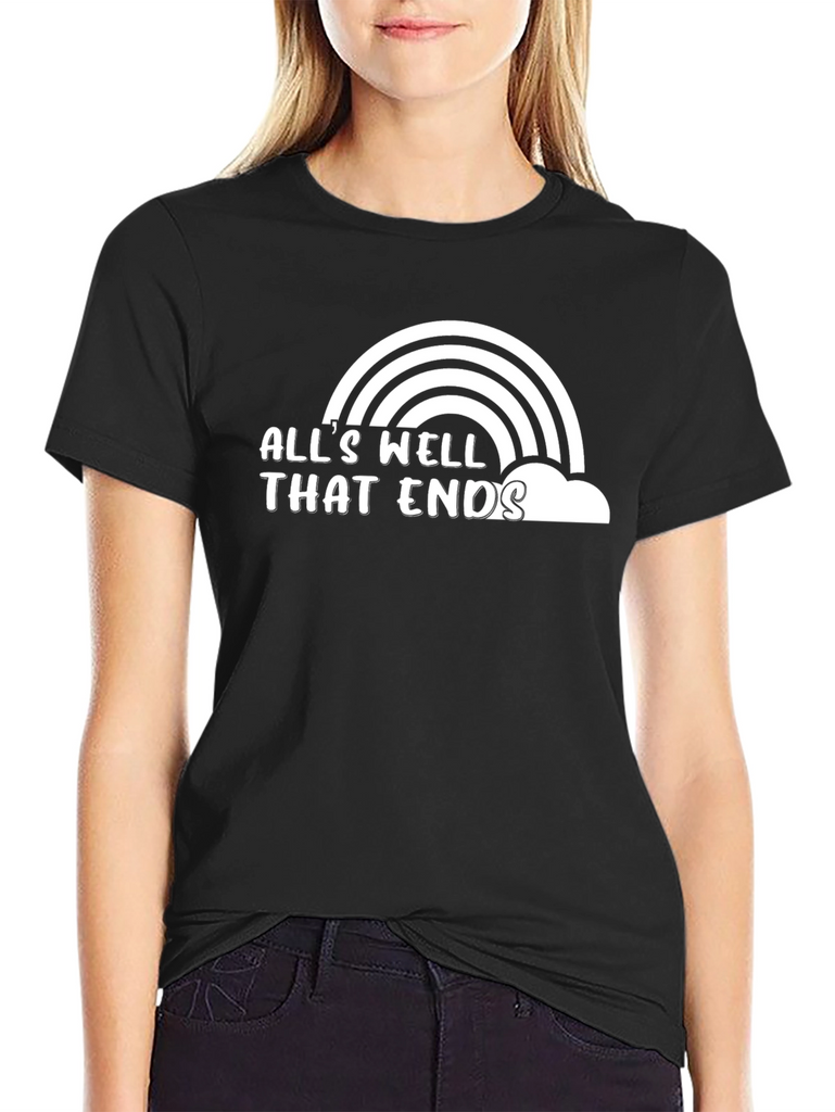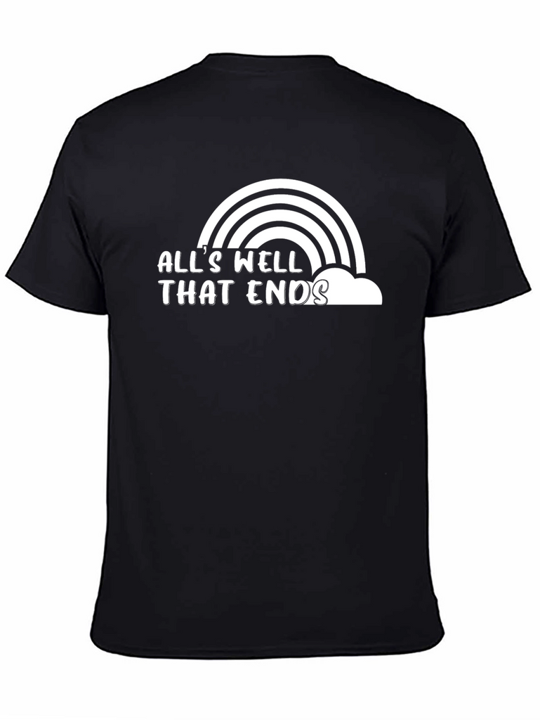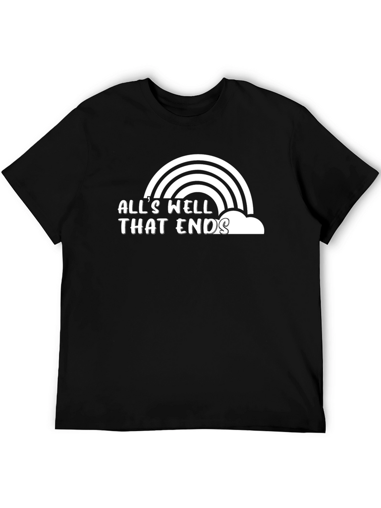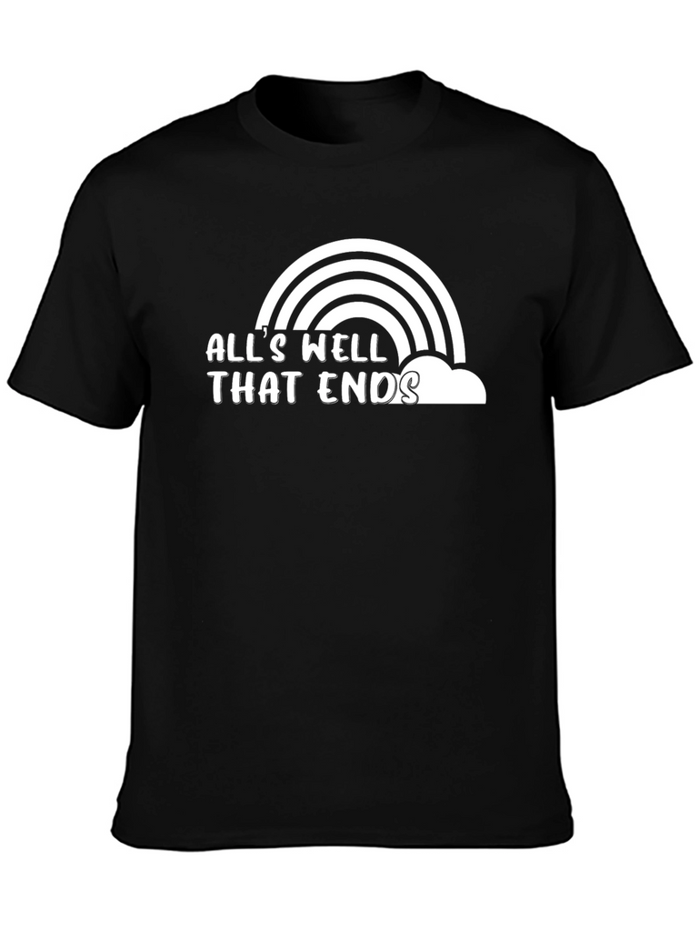 This classic black t-shirt features a unique and eye-catching design. The graphic showcases a stylized white rainbow paired with the phrase "All's Well That Ends". The print is clean and crisp. Made from what appears to be a comfortable cotton blend, this t-shirt offers both style and comfort. The short sleeves and classic crew neck make it a versatile addition to any wardrobe. Ideal for casual wear, this tee is perfect for expressing your positive outlook or literary appreciation. Wear it with jeans, shorts, or layer it under a jacket for a stylish everyday look. A great conversation starter and a comfortable choice for any occasion!