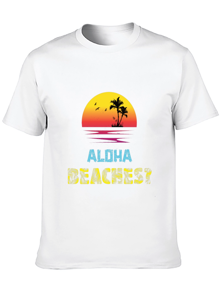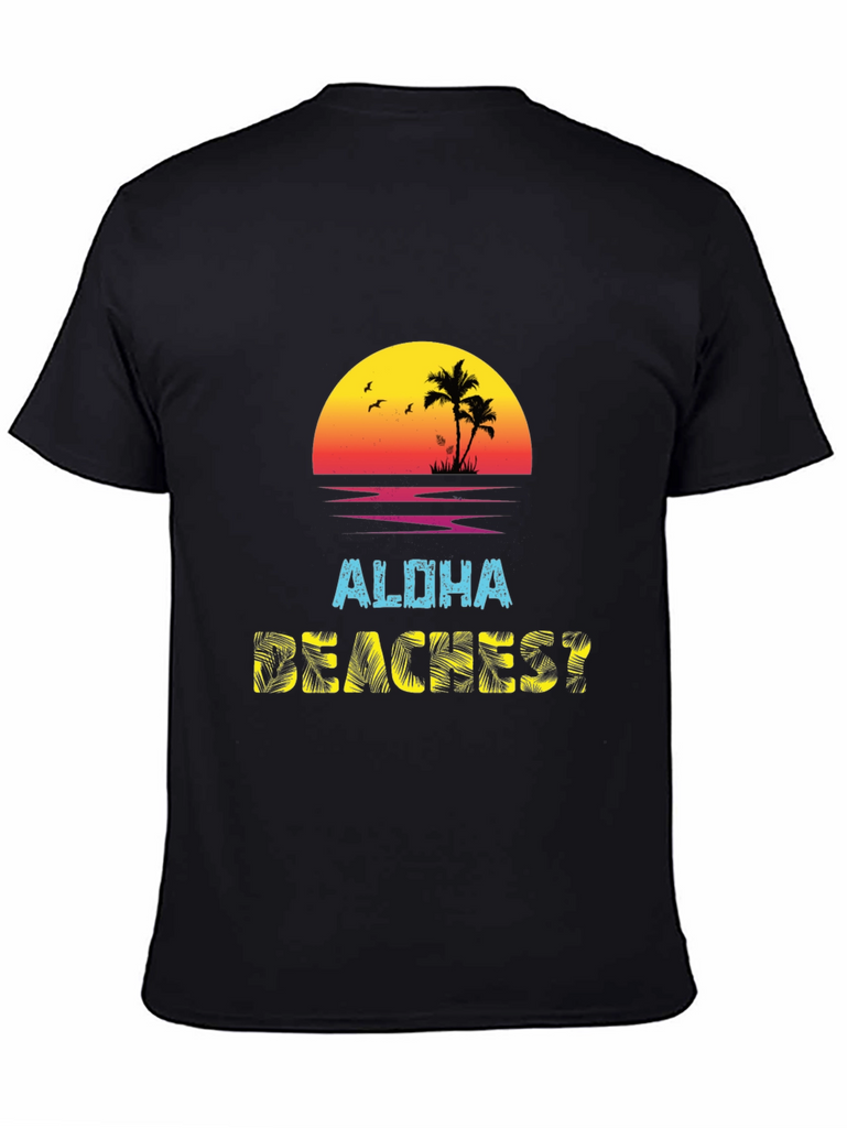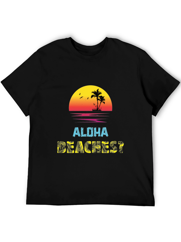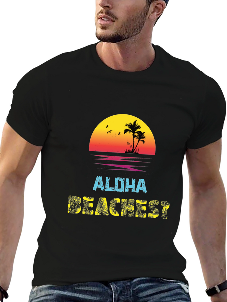Embrace the island spirit with this stylish black t-shirt. The vibrant graphic features a tropical sunset, palm trees, and the words "ALOHA BEACHEST" in eye-catching blue and yellow text. The relaxed fit and soft fabric make it perfect for casual wear, beach outings, or vacation. This tee is a great way to show off your love for summer and good vibes. Stand out from the crowd with this trendy and comfortable graphic tee. It's a must-have for anyone who wants to add a touch of paradise to their wardrobe.