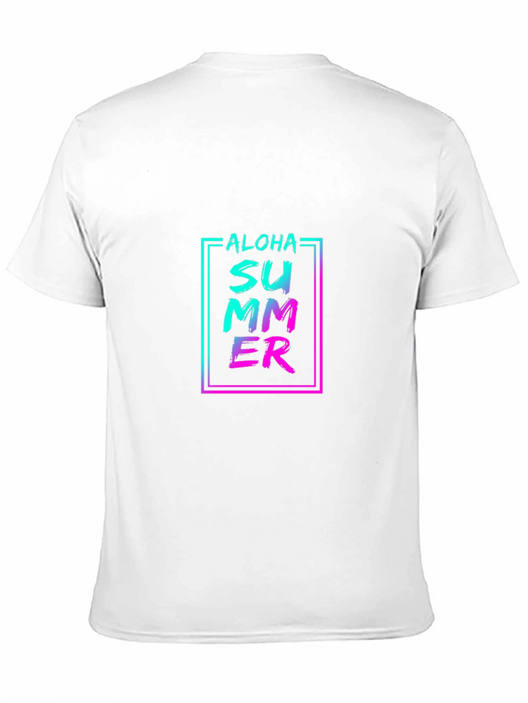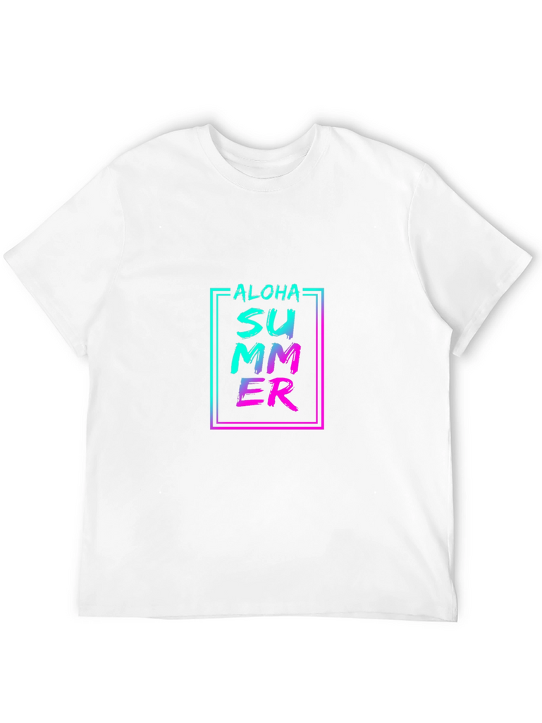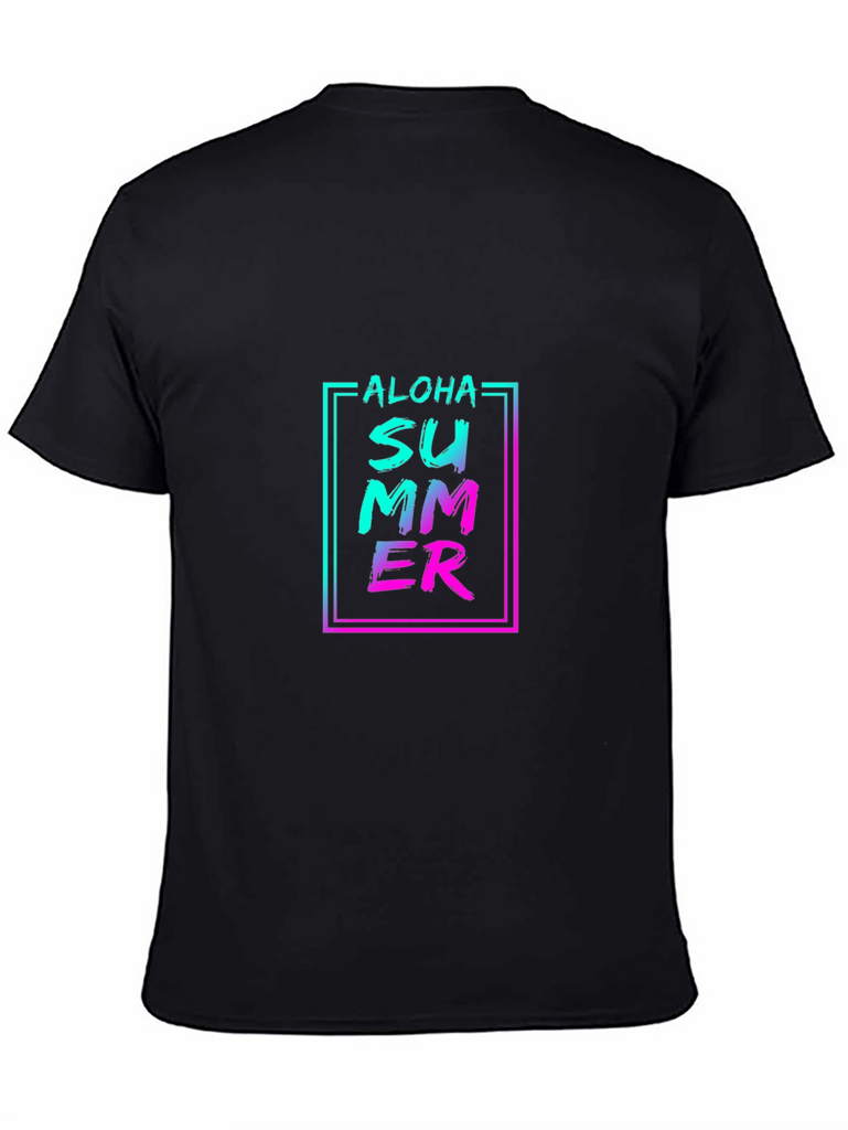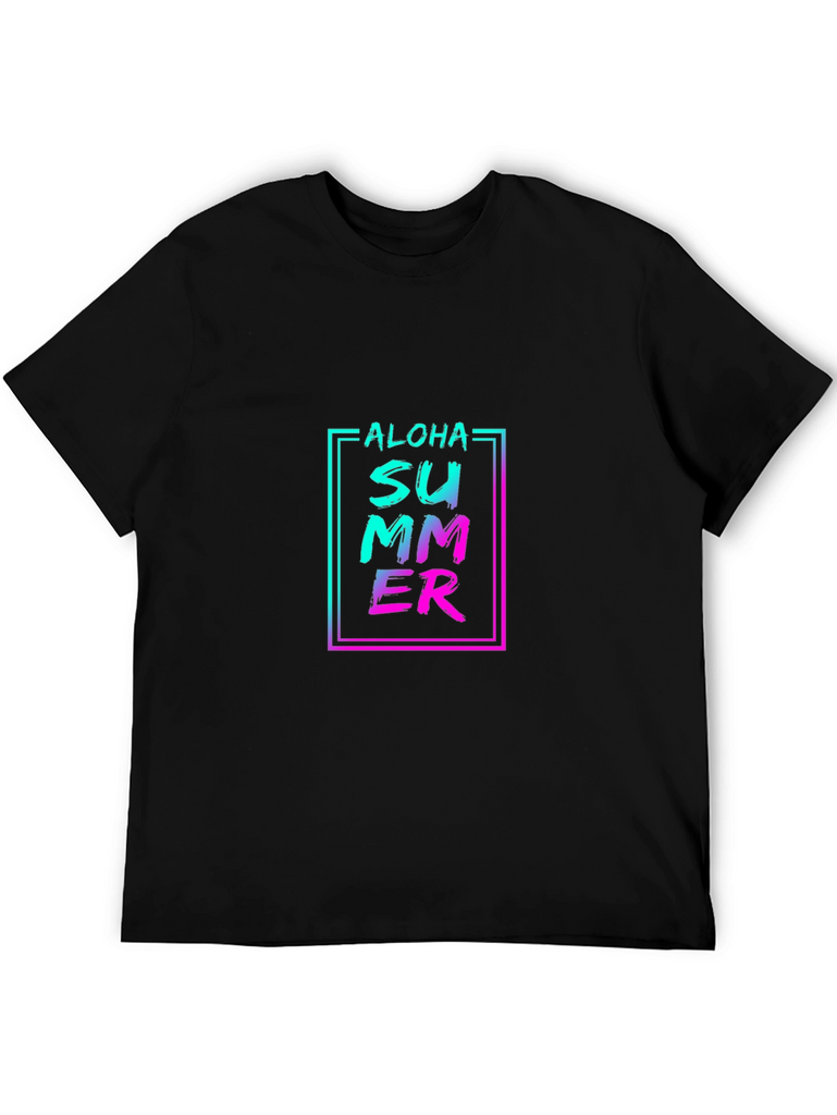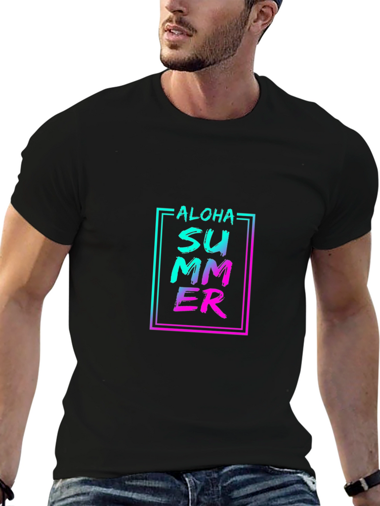 Embrace the summer vibes with this stylish black t-shirt featuring a vibrant "Aloha Summer" graphic print. The design incorporates a trendy gradient effect with turquoise blending into pink, all enclosed in a modern rectangular frame. Made from a comfortable-looking fabric, this tee offers a relaxed fit that’s perfect for casual wear. Ideal for beach outings, summer parties, or just adding a pop of color to your everyday look. Show off your love for summer in style!