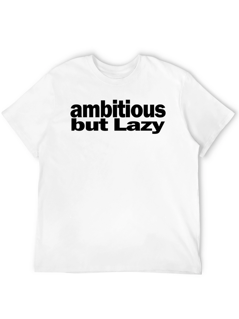 This black t-shirt features the phrase 'ambitious but Lazy' in a bold, contrasting font. The shirt appears to be made from a soft, comfortable fabric, likely cotton or a cotton blend, ideal for everyday wear. The classic crew neck and short sleeve design ensure a relaxed and versatile fit. Perfect for casual outings, lounging at home, or expressing your unique sense of humor. This tee makes a statement without sacrificing comfort. Pair it with jeans, shorts, or your favorite bottoms for an effortlessly cool look. This tee is sure to be a conversation starter.