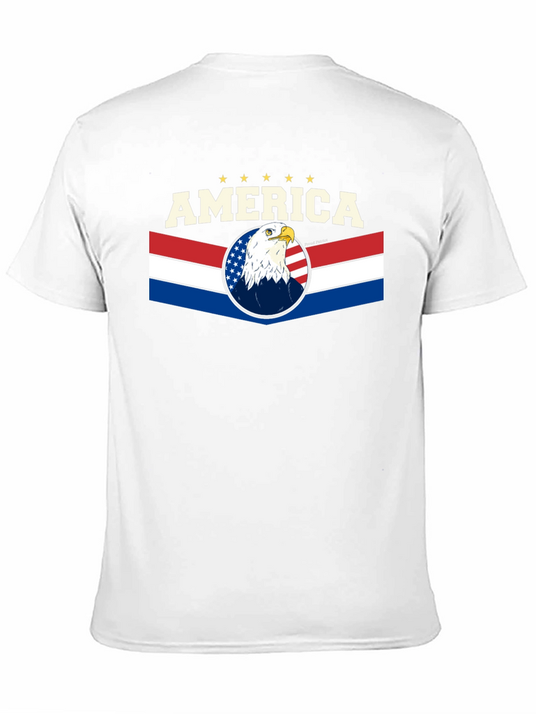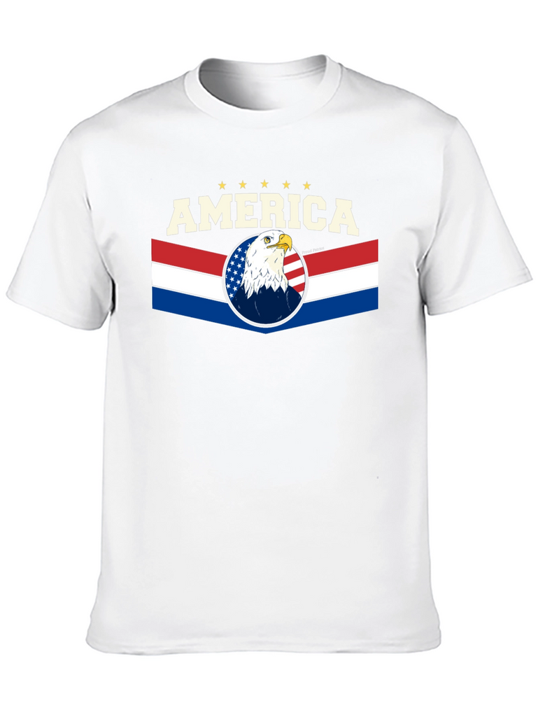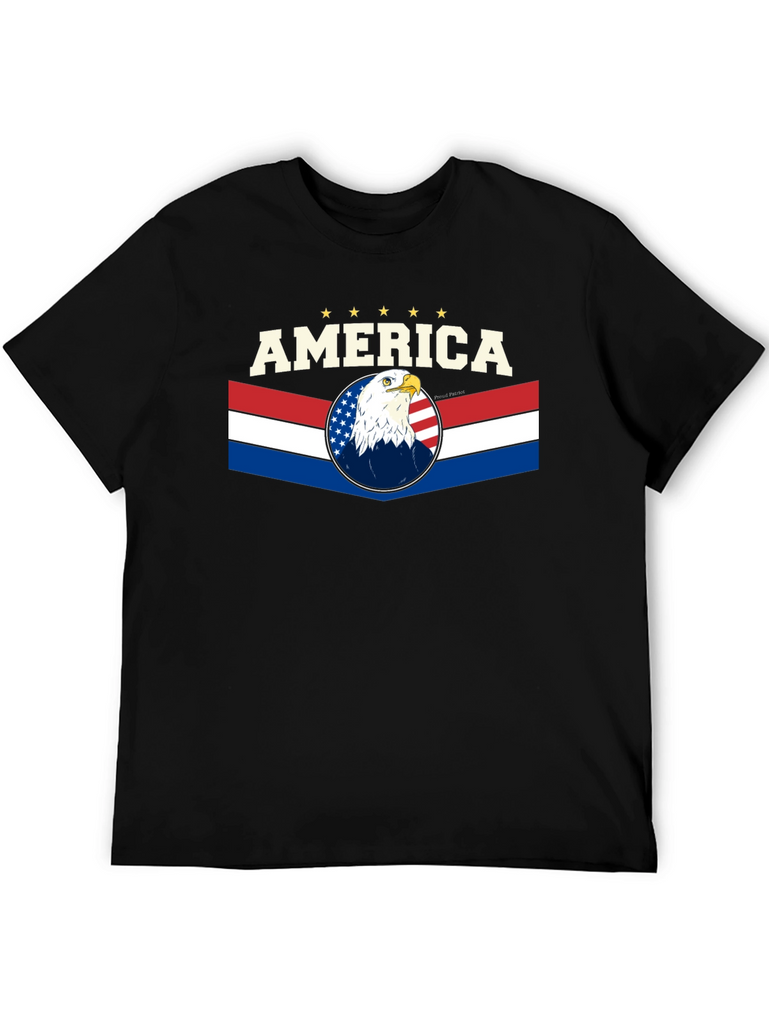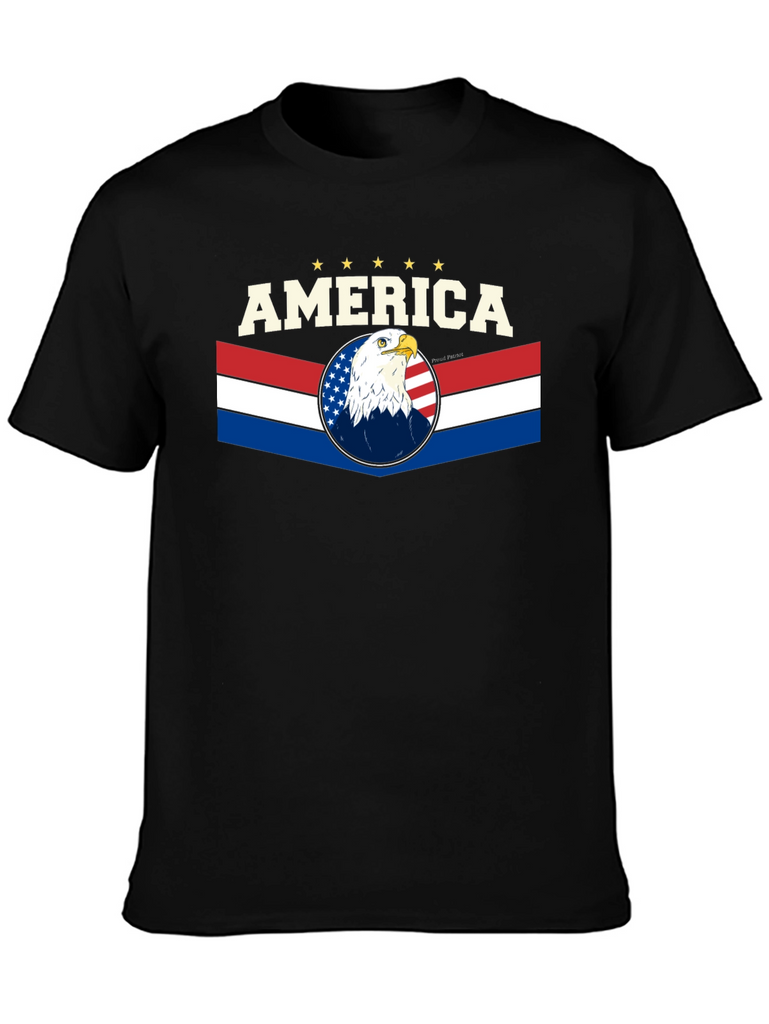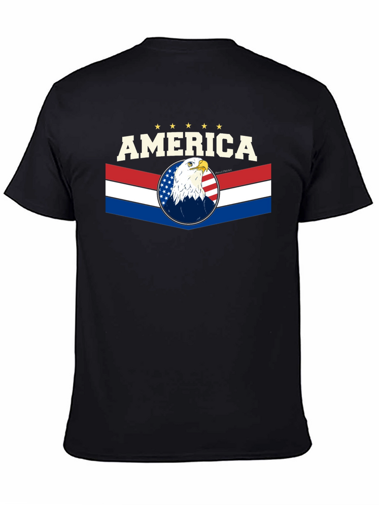 Show off your American pride with this stylish graphic t-shirt! Featuring a bold design with the word 'AMERICA' and four stars above a classic American eagle emblem, this tee makes a statement. The eagle is encircled by a field of stars against a red, white, and blue backdrop. Made from a comfortable, dark-colored fabric, this shirt offers a relaxed fit and a smooth feel. Perfect for casual outings, patriotic holidays, or everyday wear, this unique tee combines style and patriotism effortlessly. A must-have addition to any wardrobe!