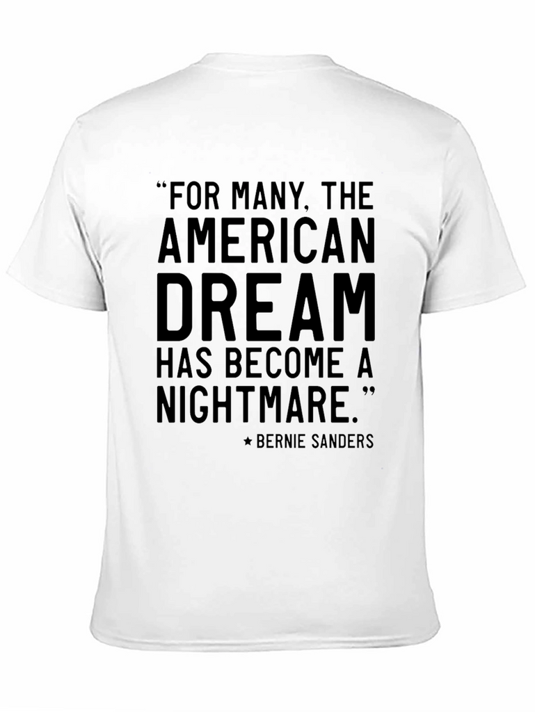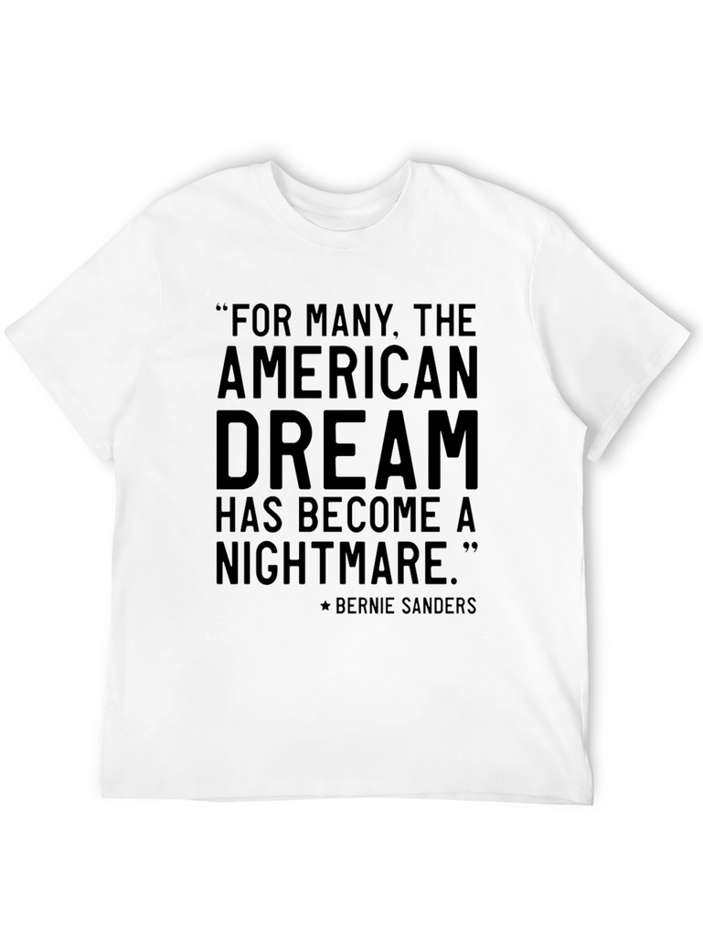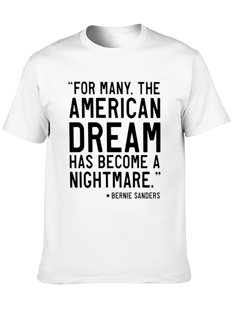 Make a bold statement with this black graphic tee. Featuring the quote "For Many, The American Dream Has Become A Nightmare" attributed to Bernie Sanders, this t-shirt is a conversation starter. The design is printed in a dark color for a monochromatic look. Made from a soft, comfortable fabric, this tee is perfect for everyday wear. Show your political views, wear it to rallies, casual hangouts, or simply when you want to express your thoughts. A unique addition to any wardrobe!