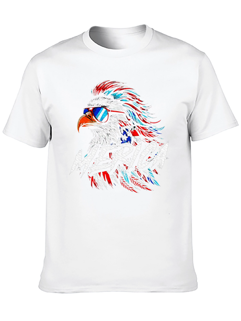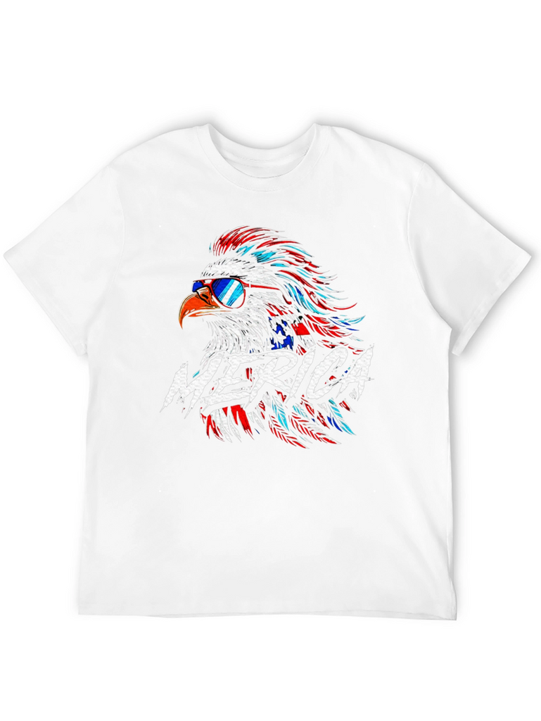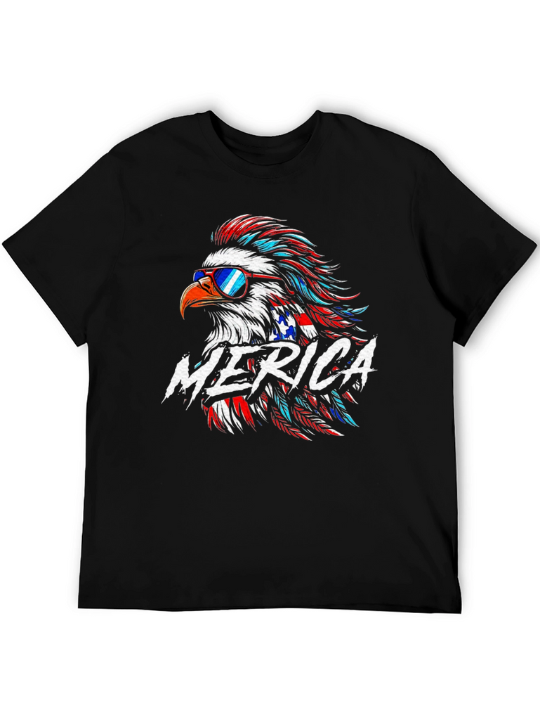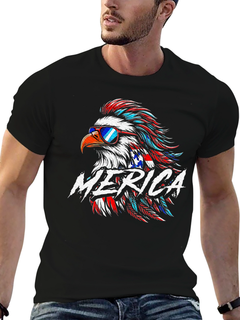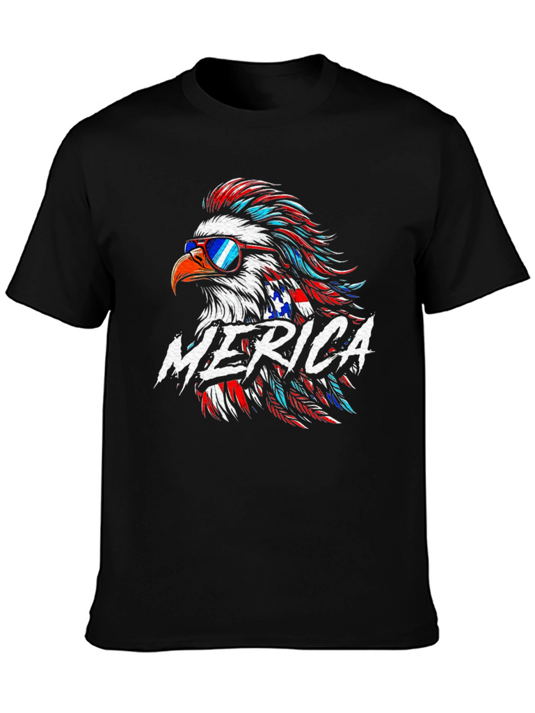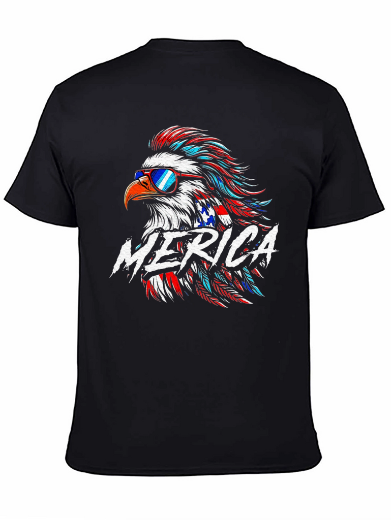 Show off your patriotic spirit with this striking black t-shirt featuring a vibrant American eagle graphic! The eagle is styled with red, white, and blue feathers, complete with sunglasses for a cool, modern twist. The word "MERICA" is boldly displayed across the chest. Crafted from a comfortable-looking fabric, this tee is perfect for casual wear, 4th of July celebrations, or any occasion where you want to express your love for the USA. Make a statement with this eye-catching and comfortable graphic tee!