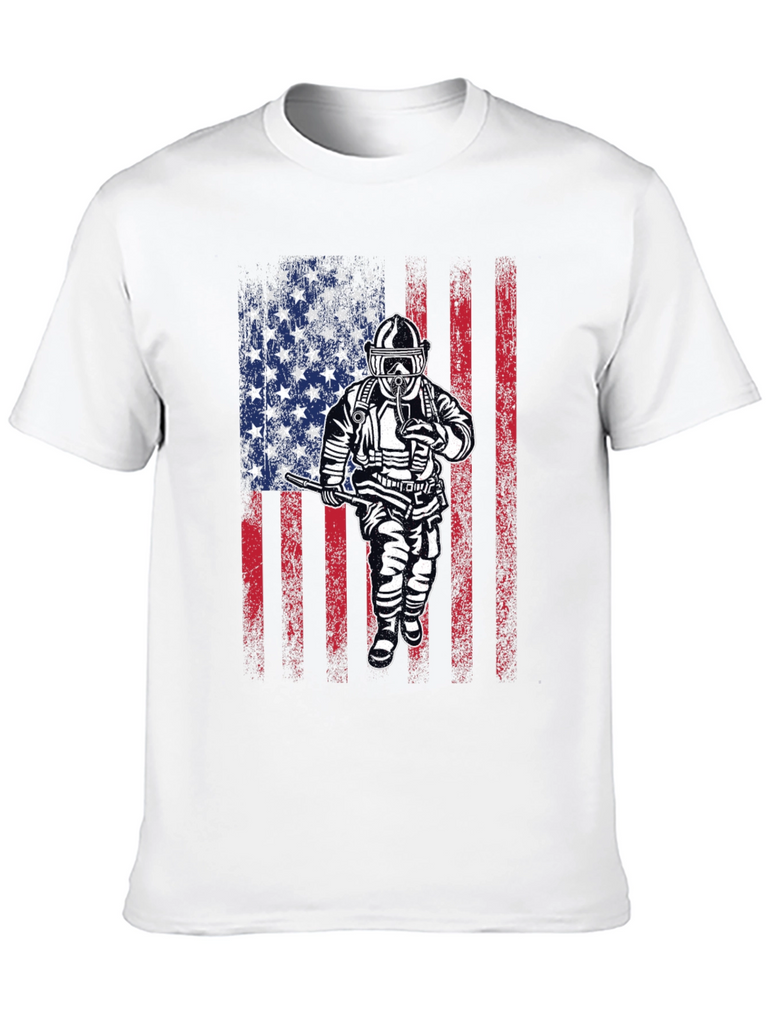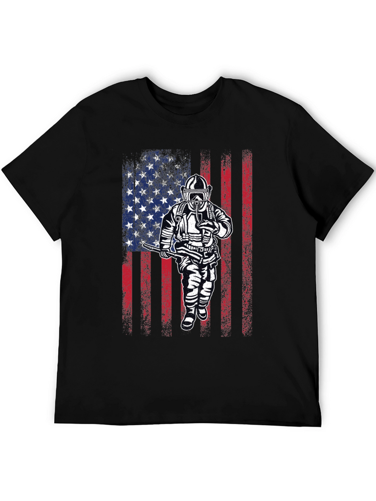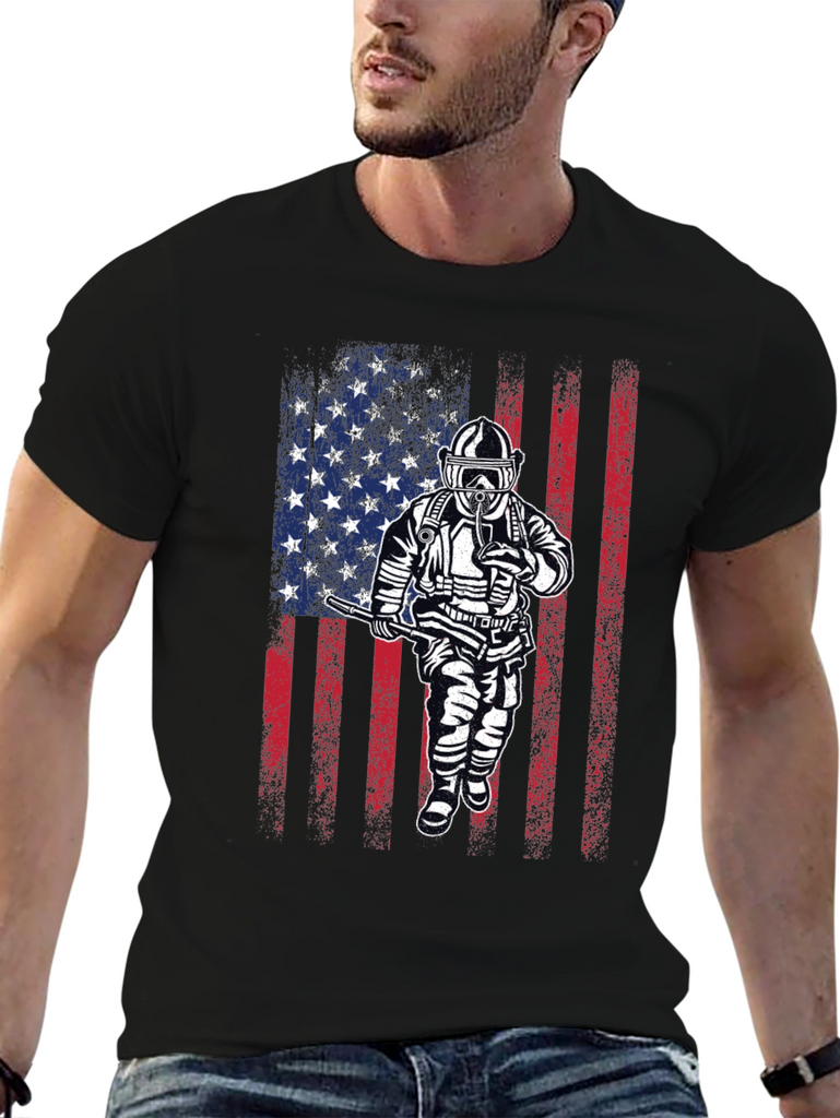 Show your support for our brave firefighters with this striking black t-shirt. Featuring a bold graphic of a firefighter in full gear superimposed over a distressed American flag, this shirt is a patriotic and powerful statement. The design is eye-catching, and perfect for everyday wear or special occasions like Independence Day or Memorial Day. Made from comfortable fabric, this t-shirt will keep you cool and stylish while honoring the heroes who protect our communities. Wear it with pride and show your gratitude for the sacrifices made by firefighters across the nation. A great gift for current and former firefighters!