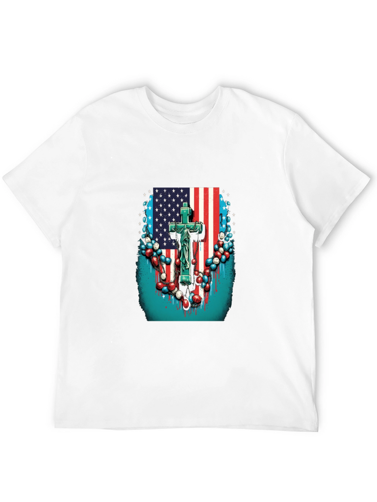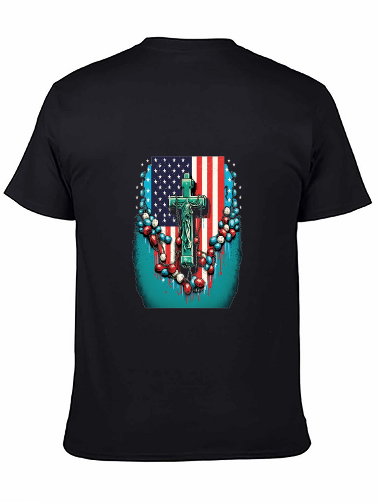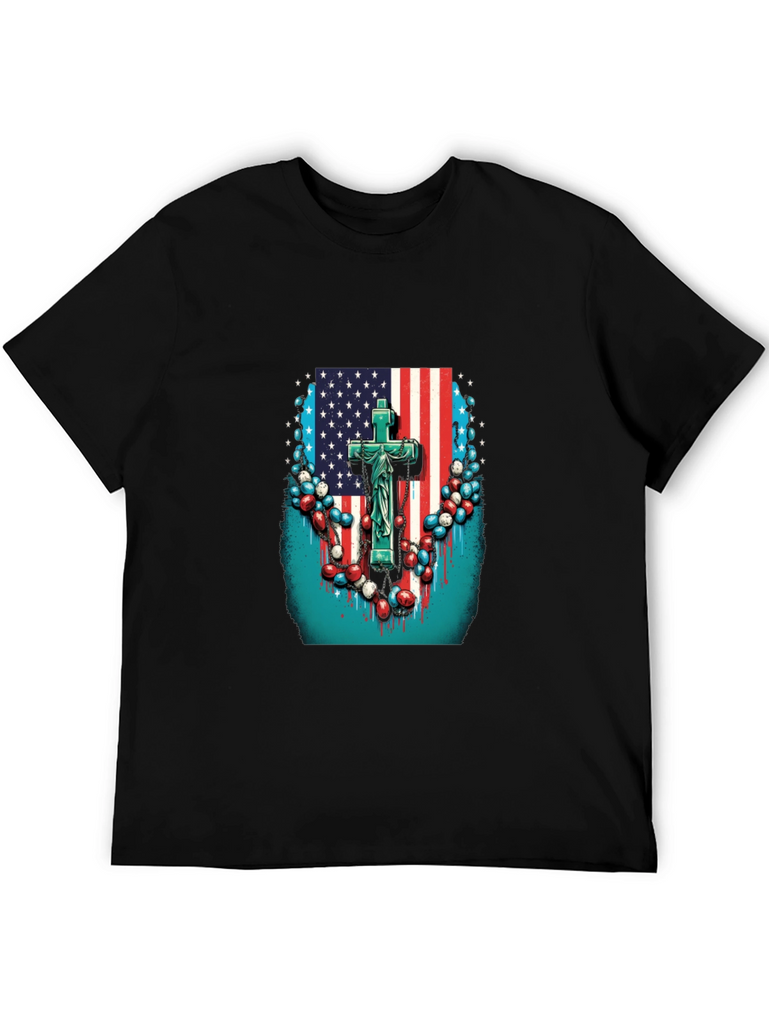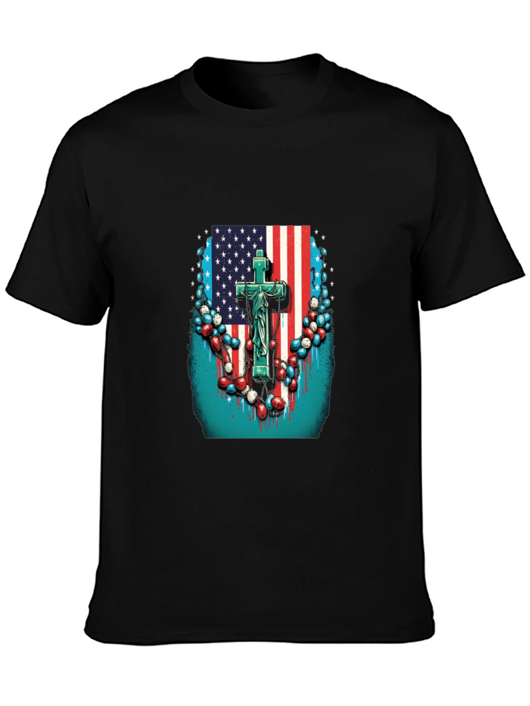 Show your faith and patriotism with this unique graphic tee. This black t-shirt features a bold design with an American flag backdrop. A vibrant green cross takes center stage, draped with rosary beads in patriotic red, white, and blue. The colorful dripping paint effect adds an edgy, artistic touch. Perfect for casual wear, religious gatherings, or celebrating national holidays. Made from comfortable, breathable material, this shirt is a stylish way to express your beliefs and love for your country. Makes a great gift for anyone who loves America and their faith.