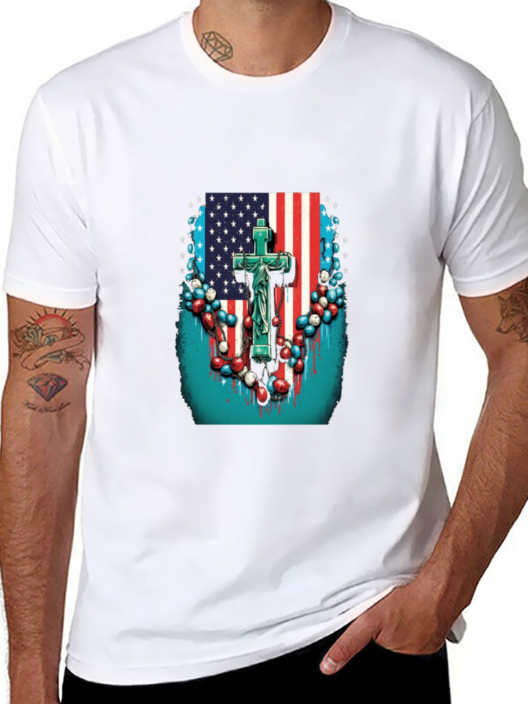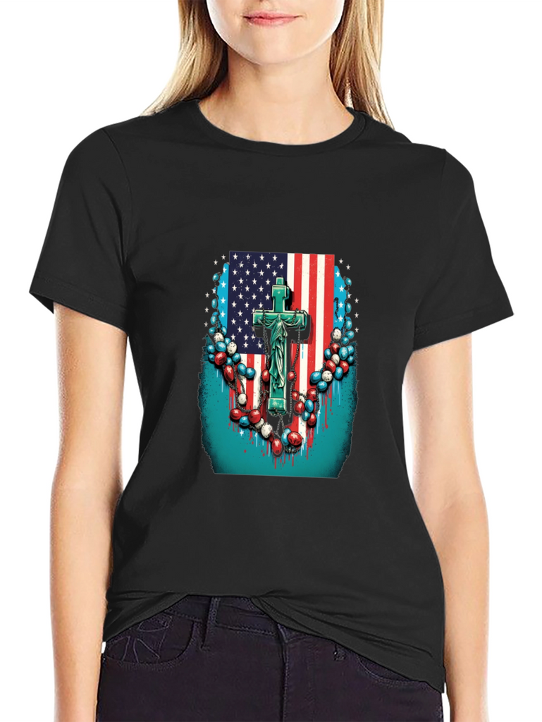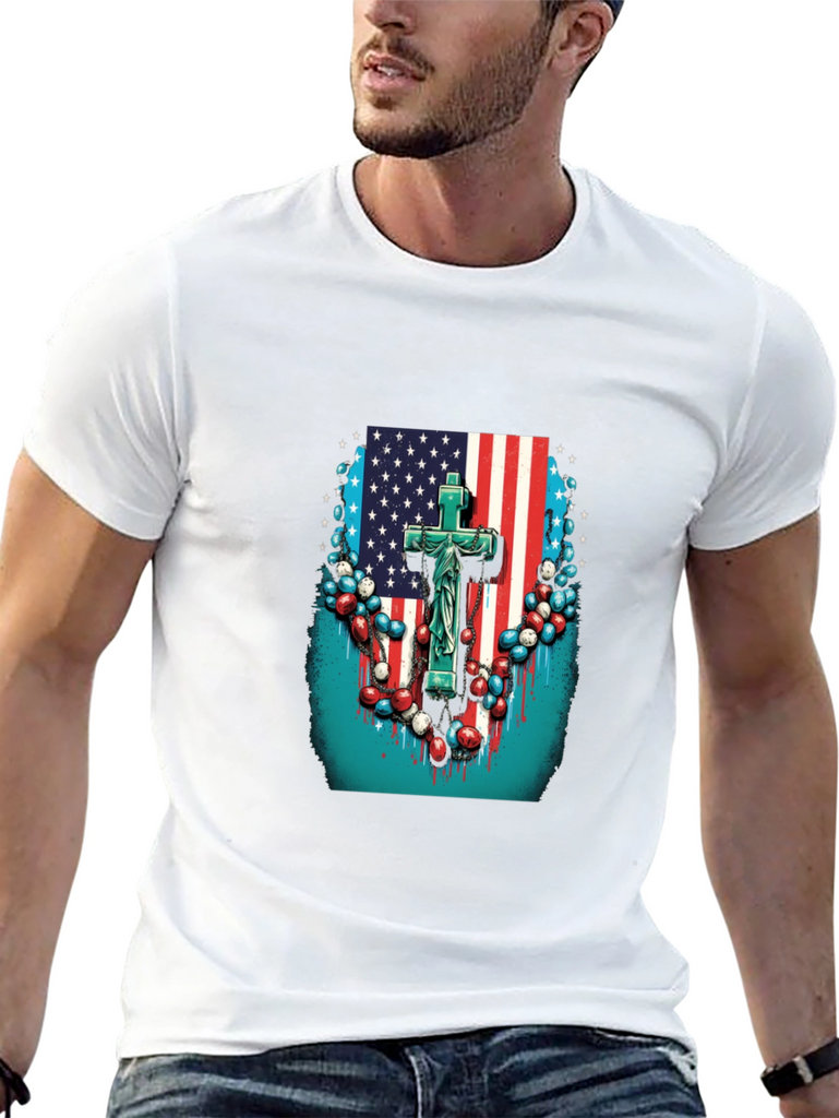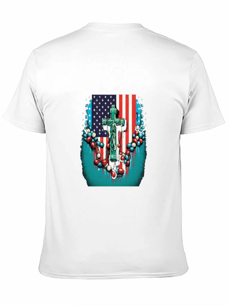 Show your faith and patriotism with this unique graphic tee. This black t-shirt features a bold design with an American flag backdrop. A vibrant green cross takes center stage, draped with rosary beads in patriotic red, white, and blue. The colorful dripping paint effect adds an edgy, artistic touch. Perfect for casual wear, religious gatherings, or celebrating national holidays. Made from comfortable, breathable material, this shirt is a stylish way to express your beliefs and love for your country. Makes a great gift for anyone who loves America and their faith.