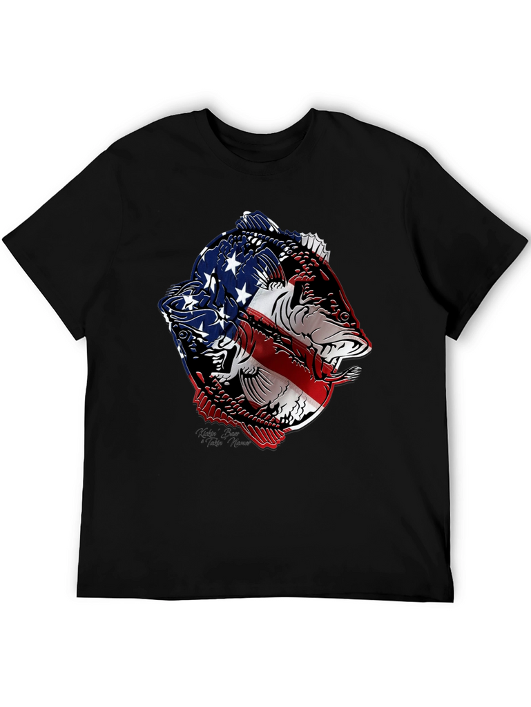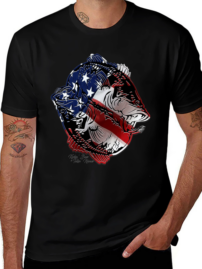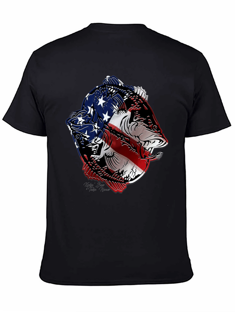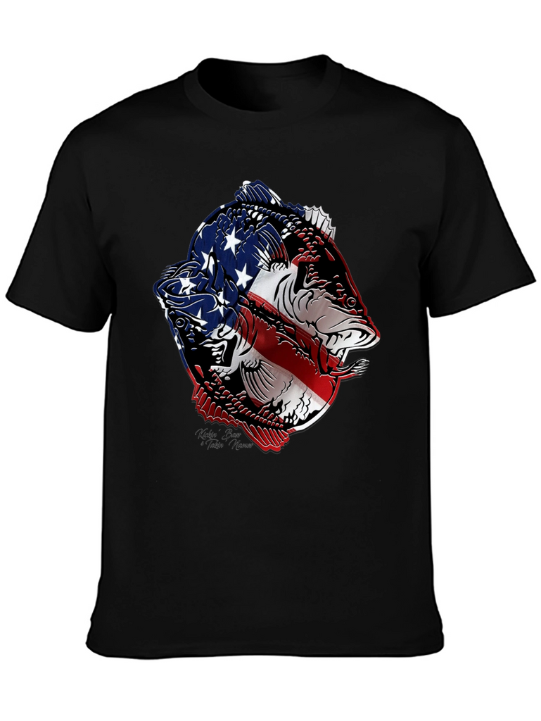 Show your patriotic side with this striking black t-shirt featuring a bold graphic of two fish stylized with the American flag. The vivid red, white, and blue design contrasts sharply against the black background, making it a standout piece. Made from a comfortable, breathable fabric, this tee is perfect for casual wear, fishing trips, or showing off your love for the USA. The intricate design combines a passion for fishing with national pride, making it an ideal gift for anglers and patriots alike. Wear it to your next outdoor event, BBQ, or simply as a stylish way to express your unique personality.