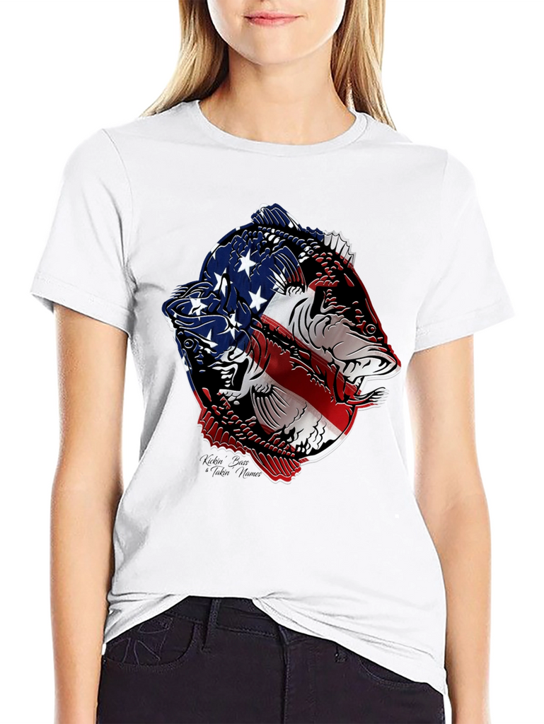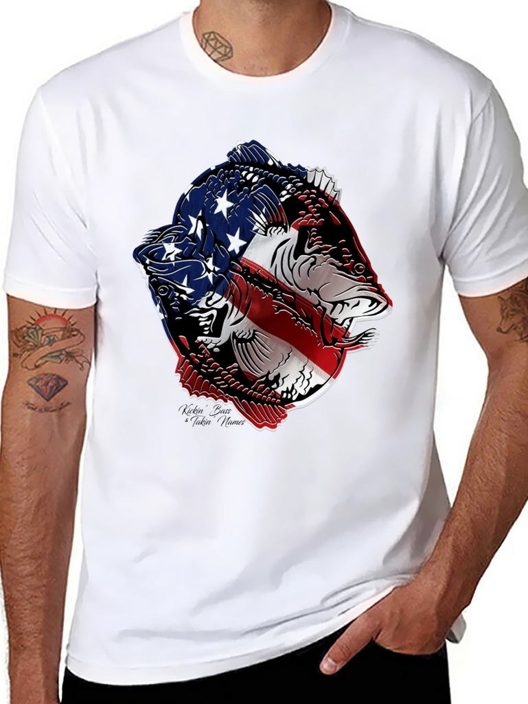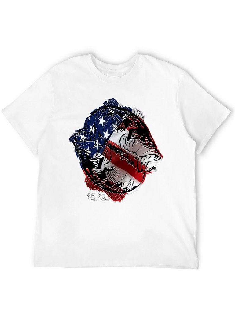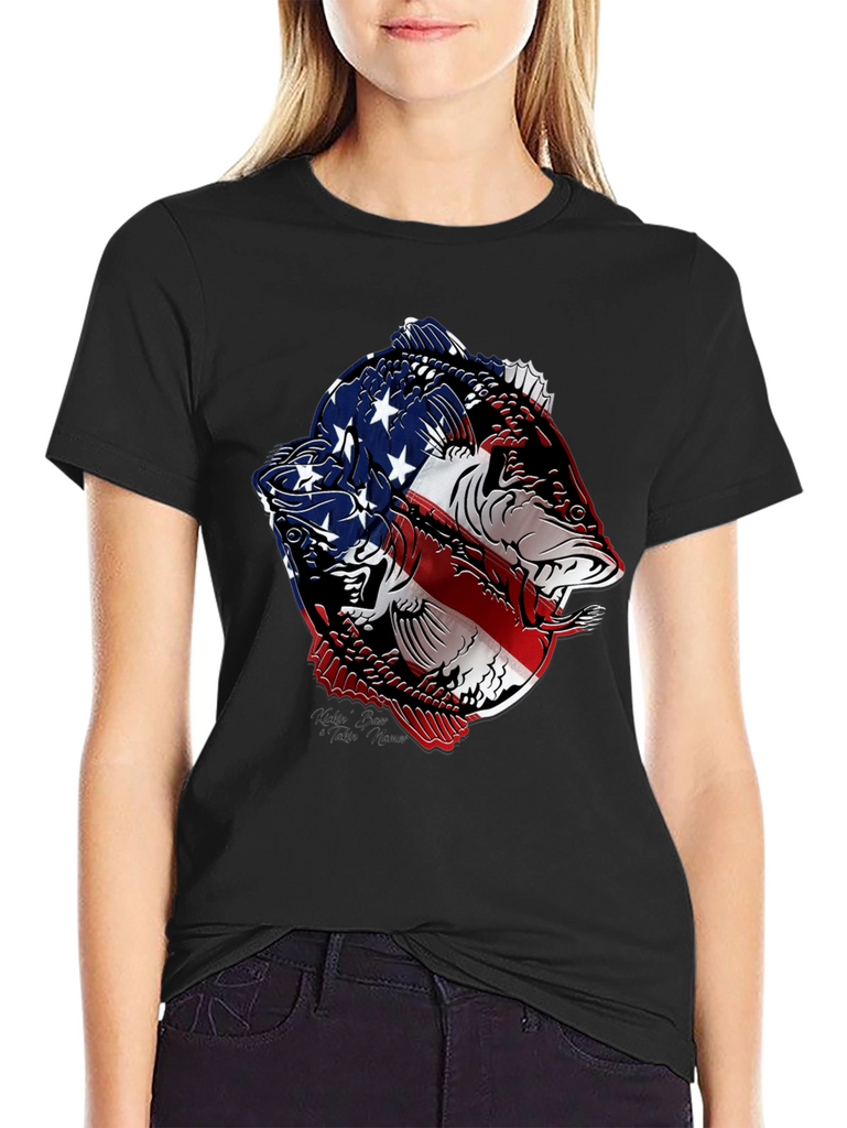 Show your patriotic side with this striking black t-shirt featuring a bold graphic of two fish stylized with the American flag. The vivid red, white, and blue design contrasts sharply against the black background, making it a standout piece. Made from a comfortable, breathable fabric, this tee is perfect for casual wear, fishing trips, or showing off your love for the USA. The intricate design combines a passion for fishing with national pride, making it an ideal gift for anglers and patriots alike. Wear it to your next outdoor event, BBQ, or simply as a stylish way to express your unique personality.