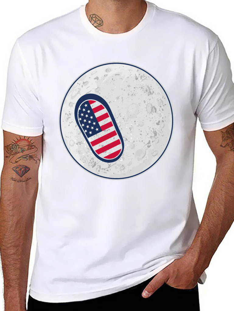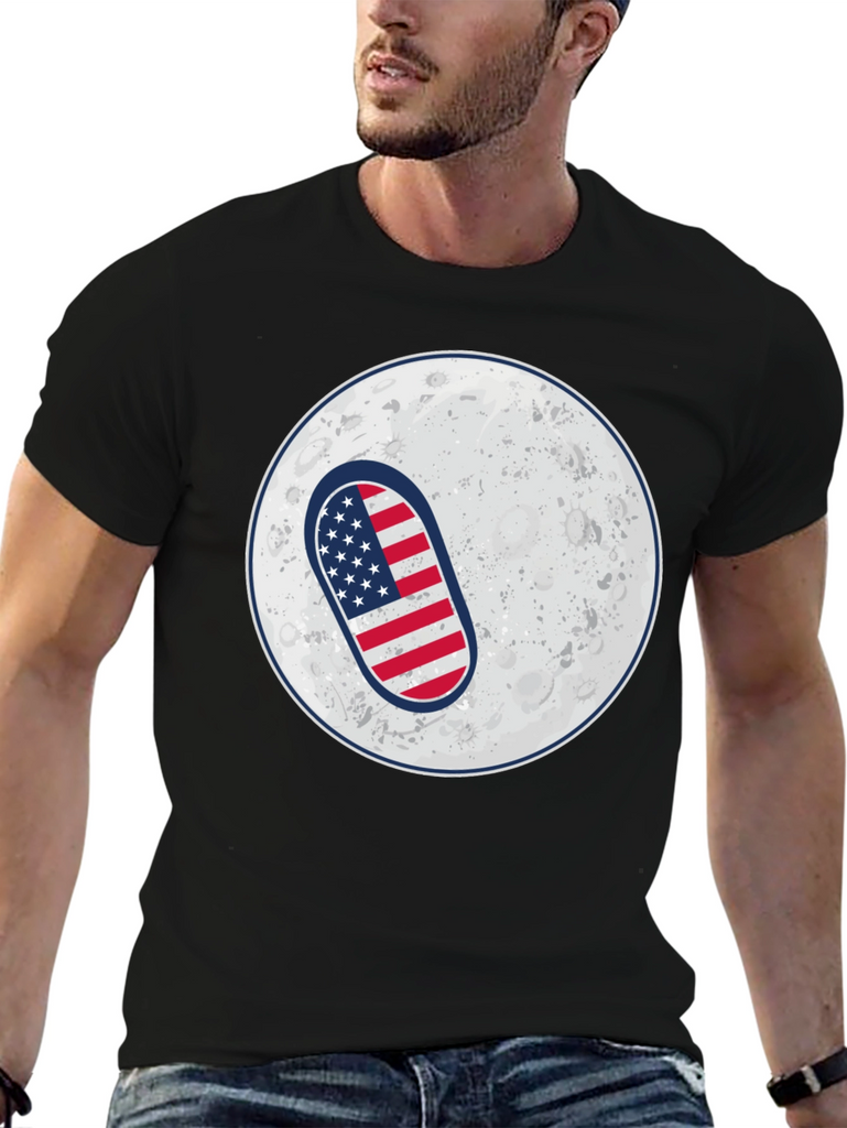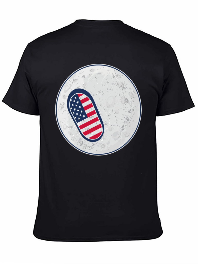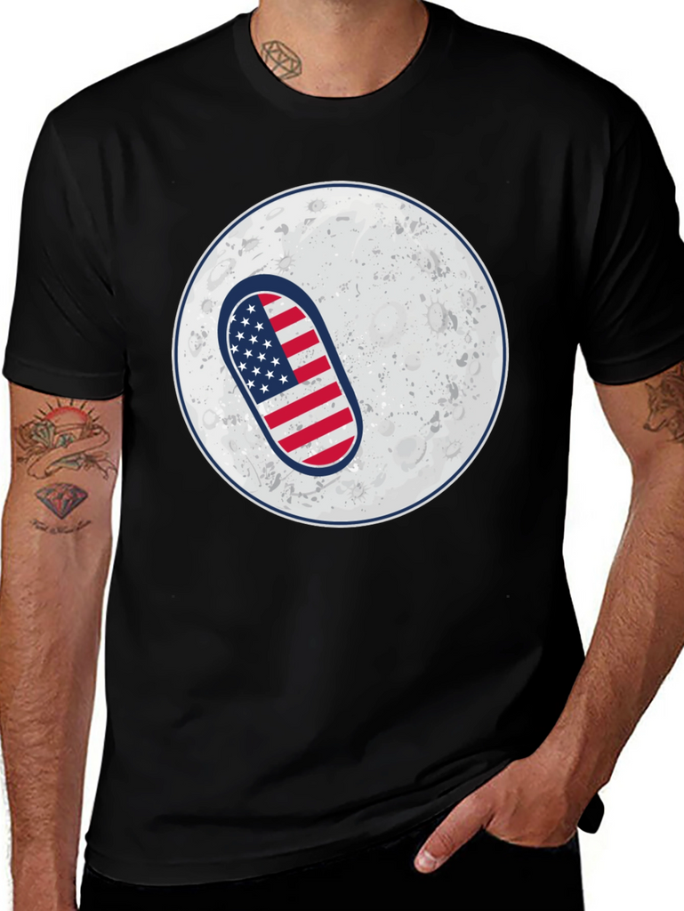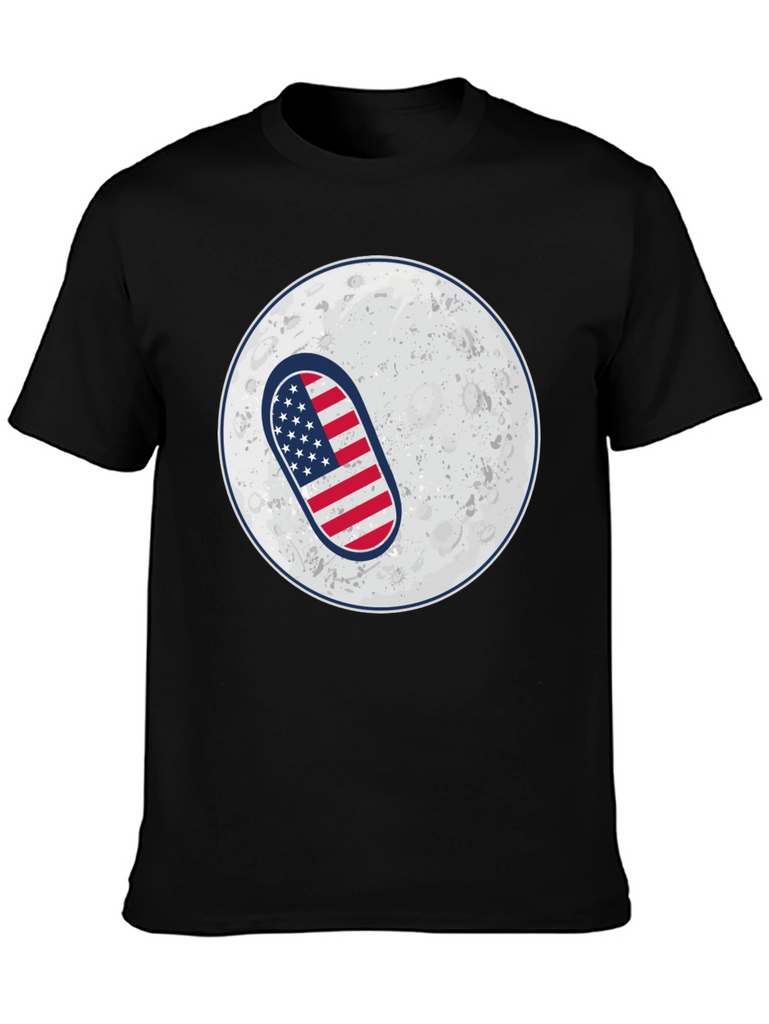 This striking black t-shirt features a unique and eye-catching design. At the center, a stylized image showcases a moon-like sphere. Superimposed on the moon is a distinctive pill-shaped graphic adorned with the American flag. The contrast of the flag's vibrant red, white, and blue against the monochromatic moon creates a bold and patriotic statement. Crafted from a comfortable material, this t-shirt offers both style and wearability. Perfect for casual outings, patriotic events, or as a conversation starter, this tee is sure to turn heads and showcase your unique sense of style. The unique design is a great way to express yourself.
