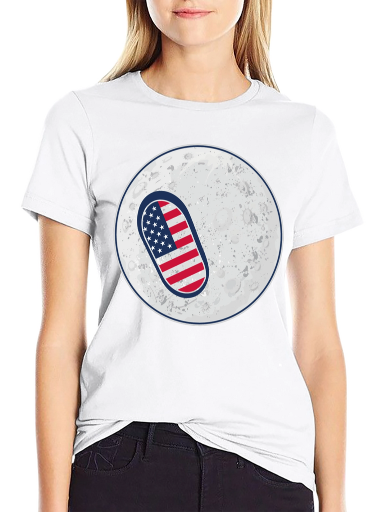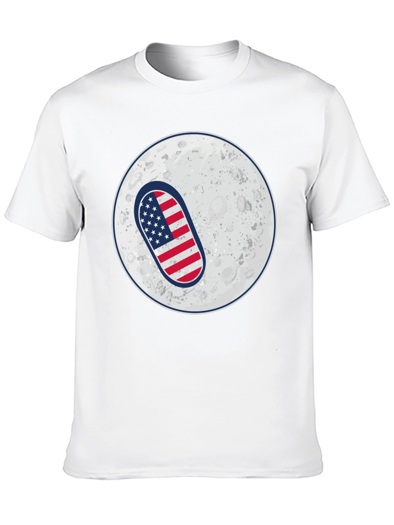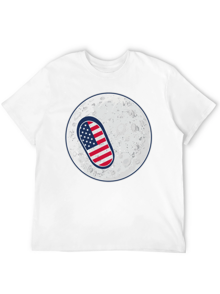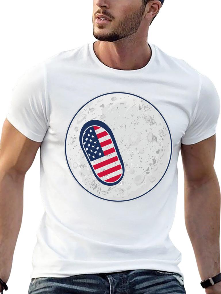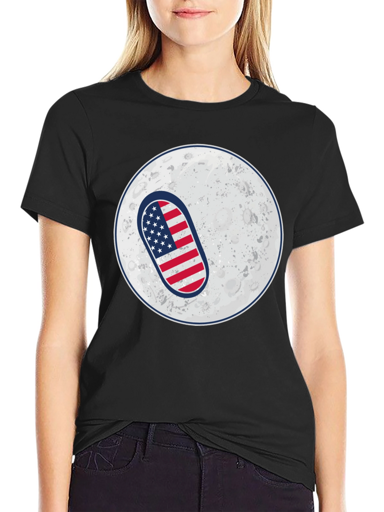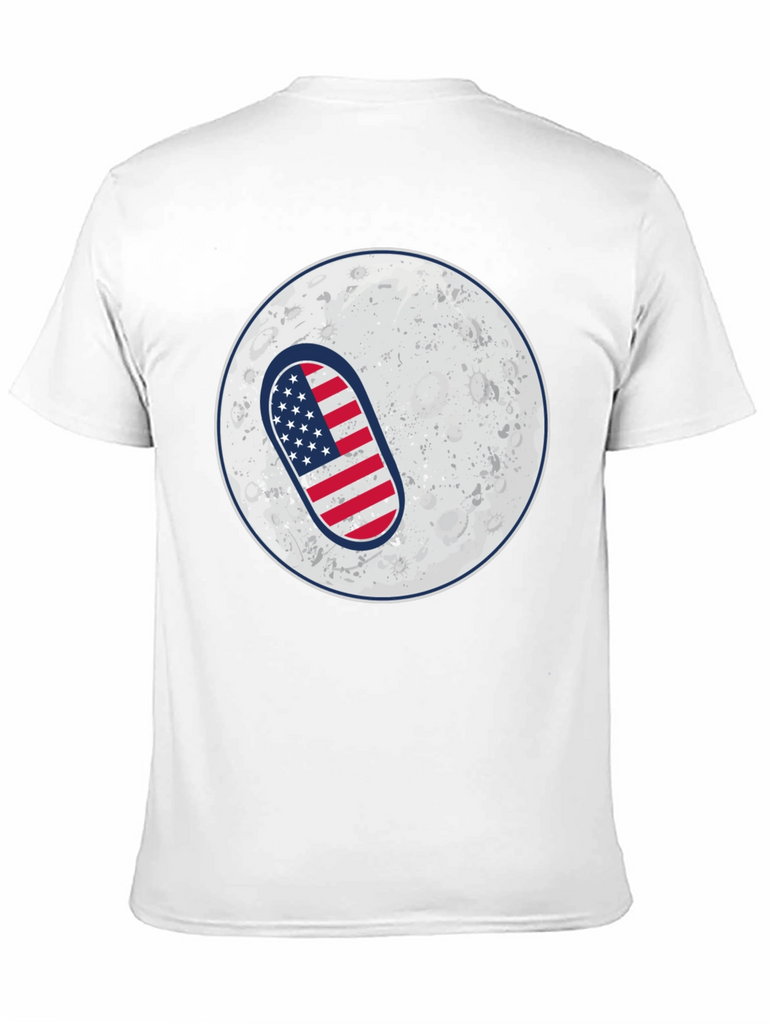This striking black t-shirt features a unique and eye-catching design. At the center, a stylized image showcases a moon-like sphere. Superimposed on the moon is a distinctive pill-shaped graphic adorned with the American flag. The contrast of the flag's vibrant red, white, and blue against the monochromatic moon creates a bold and patriotic statement. Crafted from a comfortable material, this t-shirt offers both style and wearability. Perfect for casual outings, patriotic events, or as a conversation starter, this tee is sure to turn heads and showcase your unique sense of style. The unique design is a great way to express yourself.