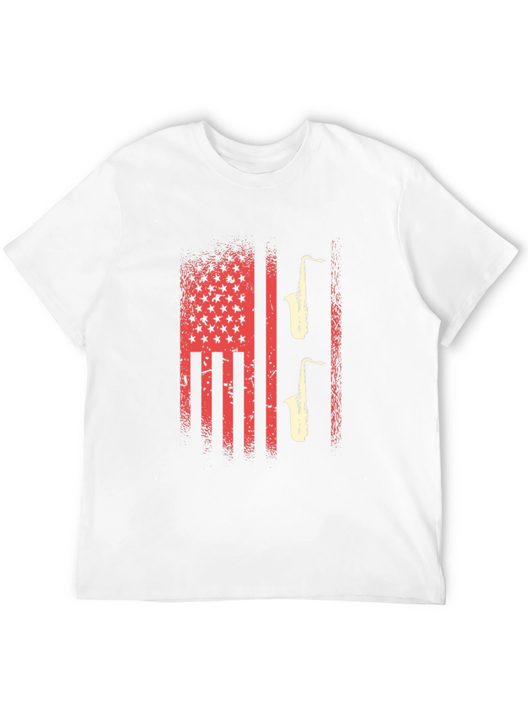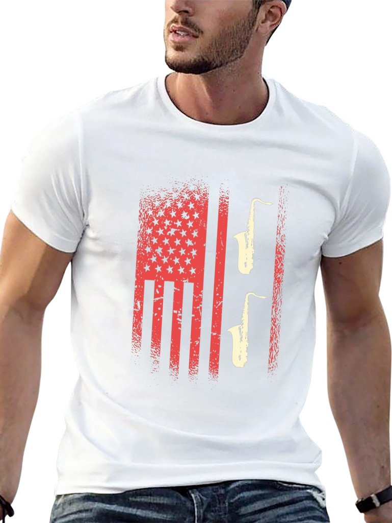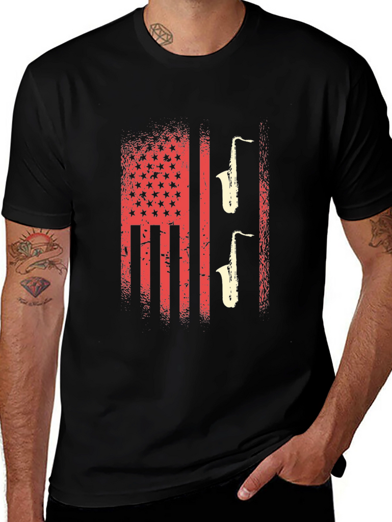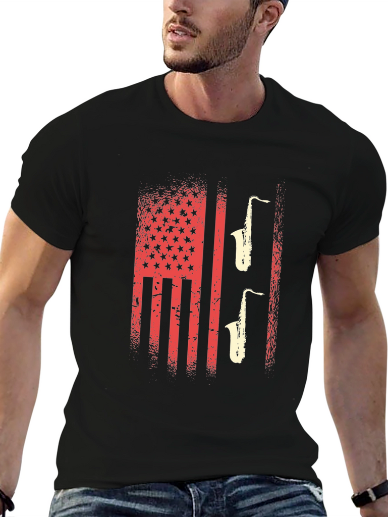 Show your love for music and country with this unique graphic tee! The design features a distressed American flag with saxophone silhouettes, creating a cool vintage vibe. Made from a comfortable fabric, this t-shirt is perfect for everyday wear. Whether you're a musician, a patriot, or just love a stylish tee, this shirt is a great way to express yourself. Wear it to concerts, casual outings, or any occasion where you want to stand out with a touch of musical flair and American pride.