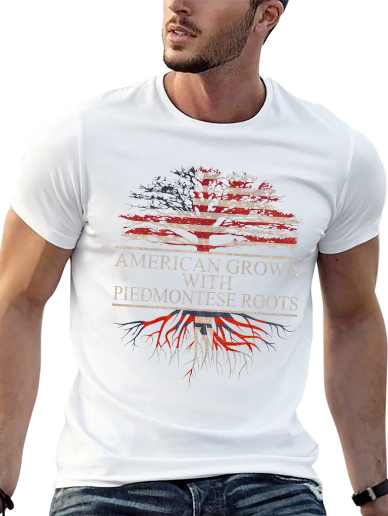 Showcase your heritage with this striking black graphic tee. This t-shirt features a unique design, blending American pride with Piedmontese roots. The graphic displays a stylized tree, where the foliage is rendered in the iconic stars and stripes of the American flag, while the roots bear the colors and design of the Piedmontese flag. Above the graphic are the words “AMERICAN GROWN WITH PIEDMONTESE ROOTS”. The t-shirt is made from comfortable materials and offers a relaxed fit, perfect for everyday wear or casual outings. It’s a great conversation starter and a way to express your dual identity with style. Celebrate your roots with this unique tee!