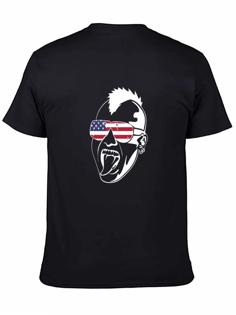 Unleash your inner rebel with this edgy black t-shirt. The design features a striking graphic of a punk rocker, complete with a mohawk and stylish sunglasses sporting the American flag. The detailed illustration contrasts sharply against the shirt's black backdrop, ensuring it stands out. Made from a soft-looking fabric, this tee promises both comfort and style. Wear it to concerts, casual hangouts, or anytime you want to make a bold statement. This t-shirt is perfect for those who appreciate unique art and a touch of rebellious flair.