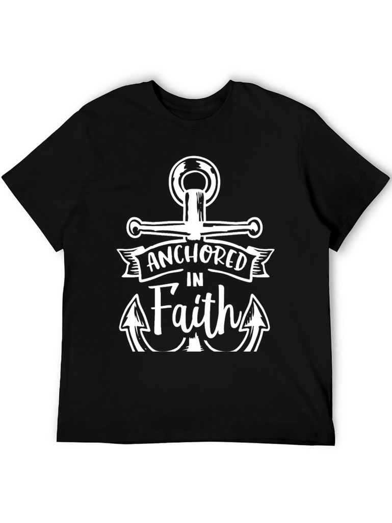 This striking black t-shirt features a bold, white graphic design. At the center is a classic anchor, symbolizing steadfastness. Above the anchor, the words "ANCHORED IN" are displayed on a banner, while the word "Faith" is written below the banner with arrow details flanking the word. The shirt has a classic crew neck and short sleeves, made from comfortable cotton. This t-shirt is perfect for casual wear. It is ideal for expressing your beliefs with style and comfort.