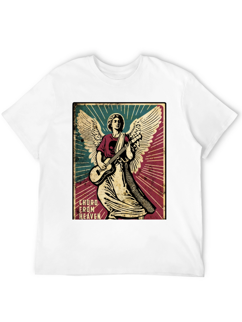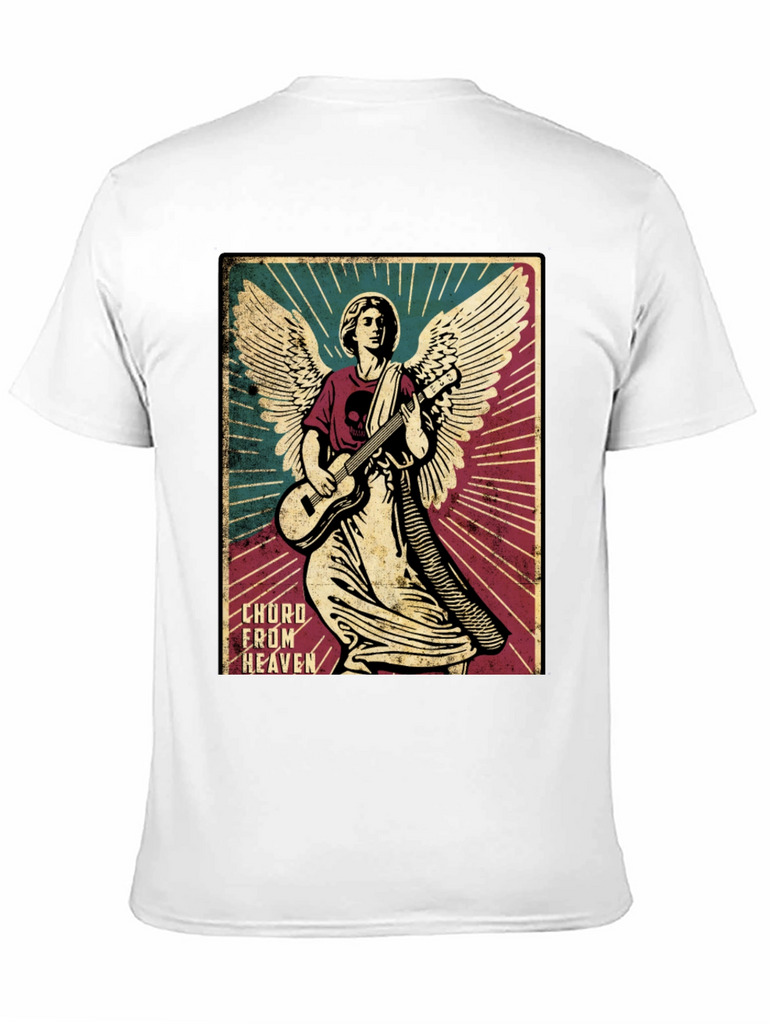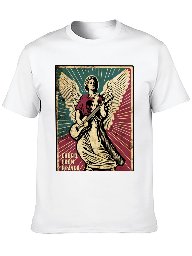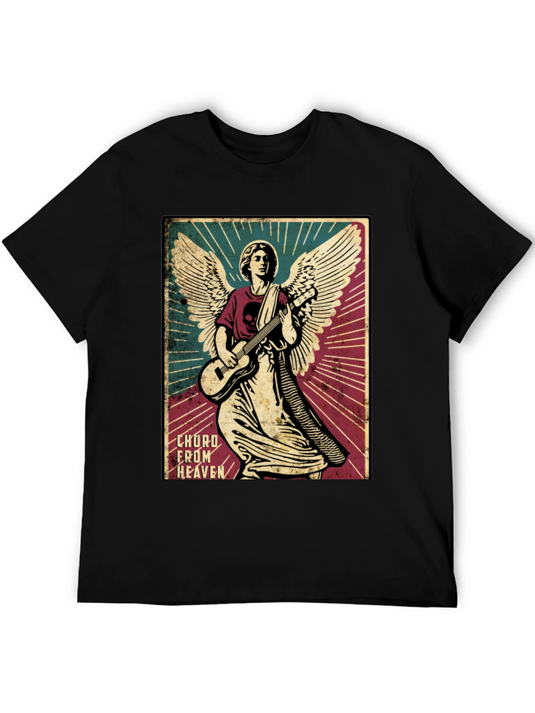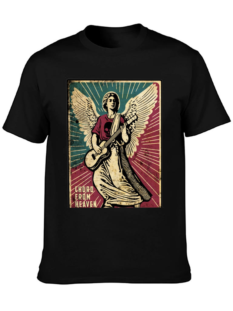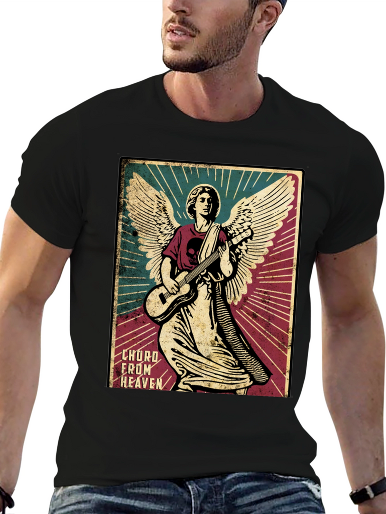 Rock out in style with this unique graphic tee. The shirt features a striking image of an angel shredding on a guitar, complete with detailed wings and a halo. The design is printed on a soft, black cotton t-shirt, offering both comfort and durability. The graphic has a vintage poster design, adding a touch of retro flair to your wardrobe. Perfect for music lovers, art enthusiasts, or anyone who wants to stand out from the crowd. Wear it to concerts, casual outings, or just lounging around the house. This tee is sure to be a conversation starter wherever you go.
