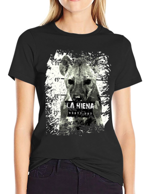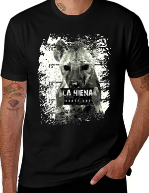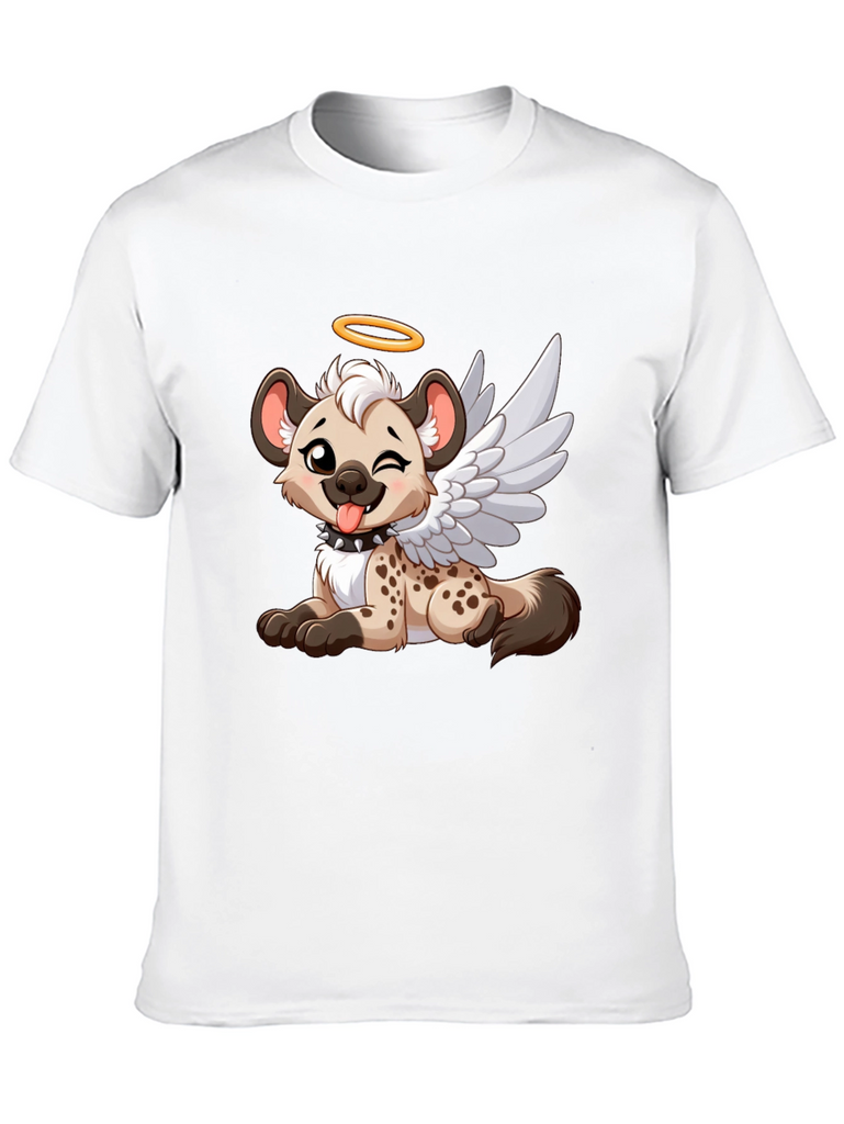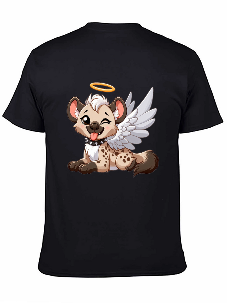 Show off your fun side with this unique black t-shirt featuring a charming cartoon hyena angel! The design showcases a winking hyena with a halo, angel wings, and a studded collar. The print has a warm color palette to make it standout. This comfortable tee is perfect for casual wear, adding a playful touch to any outfit. Wear it to express your quirky sense of humor or as a conversation starter. A must-have for hyena lovers and those who appreciate whimsical graphic tees.
