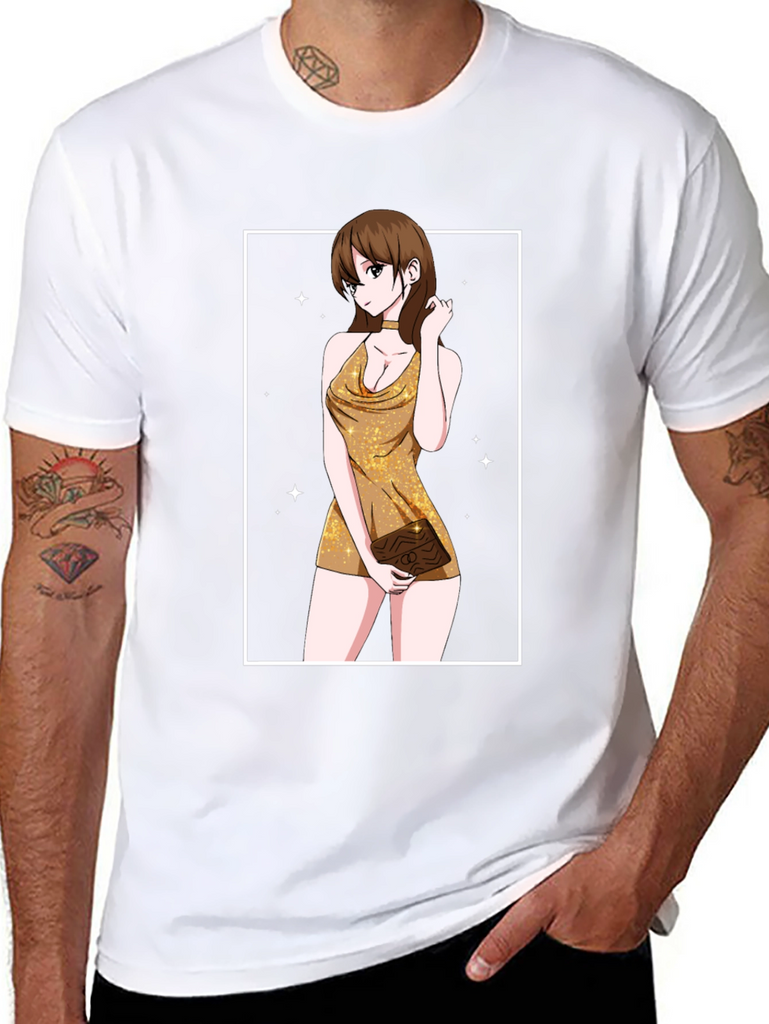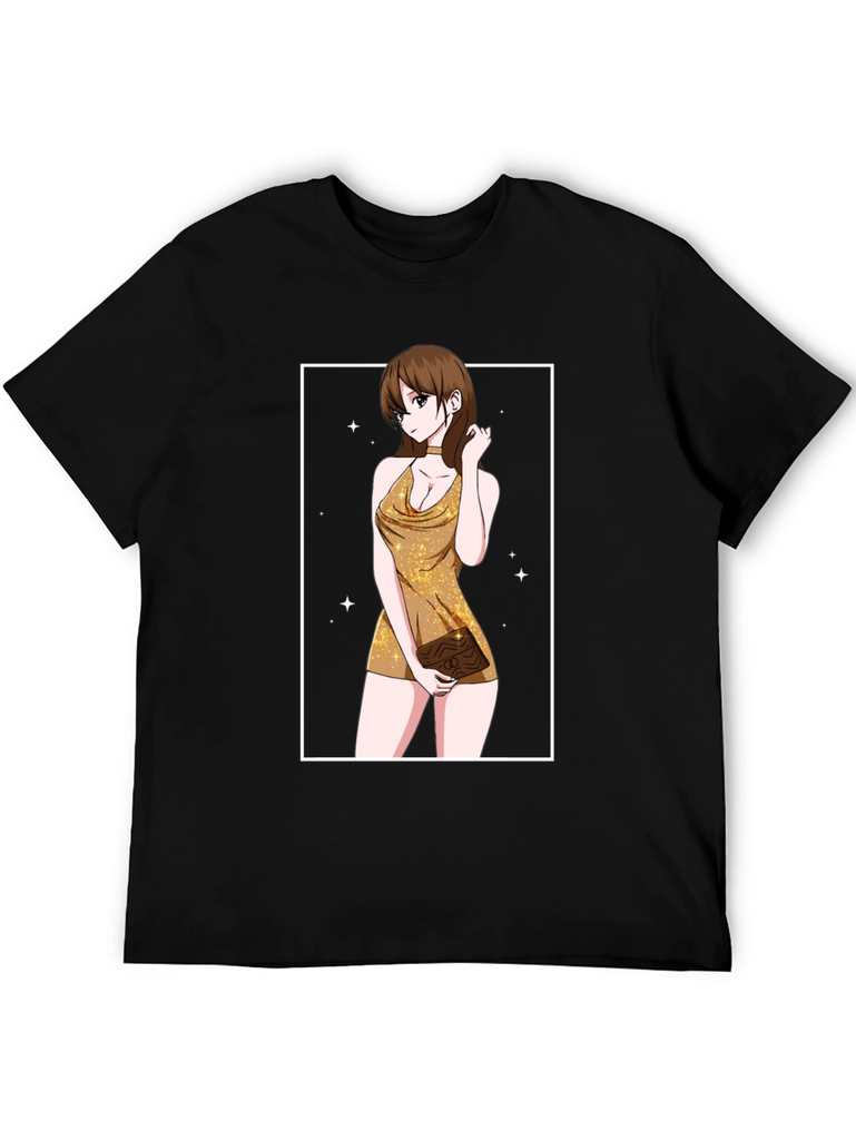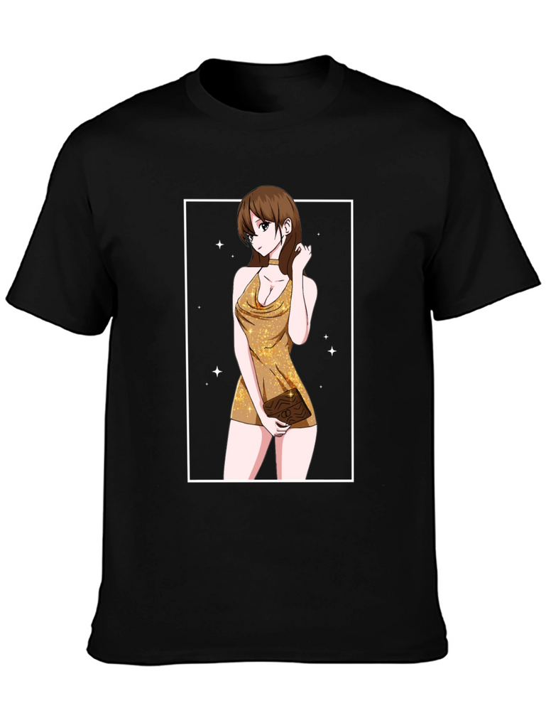 Elevate your style with this striking black t-shirt featuring a captivating anime girl graphic. The design showcases an anime-style female figure in a sparkly gold dress, set against a star-studded backdrop within a bold white frame. This unique tee is perfect for anime enthusiasts and anyone looking to add a touch of pop culture flair to their wardrobe. Made from comfortable, breathable fabric, this shirt offers a great fit and is ideal for casual outings, conventions, or simply expressing your individuality. Stand out from the crowd with this eye-catching and conversation-starting graphic tee!