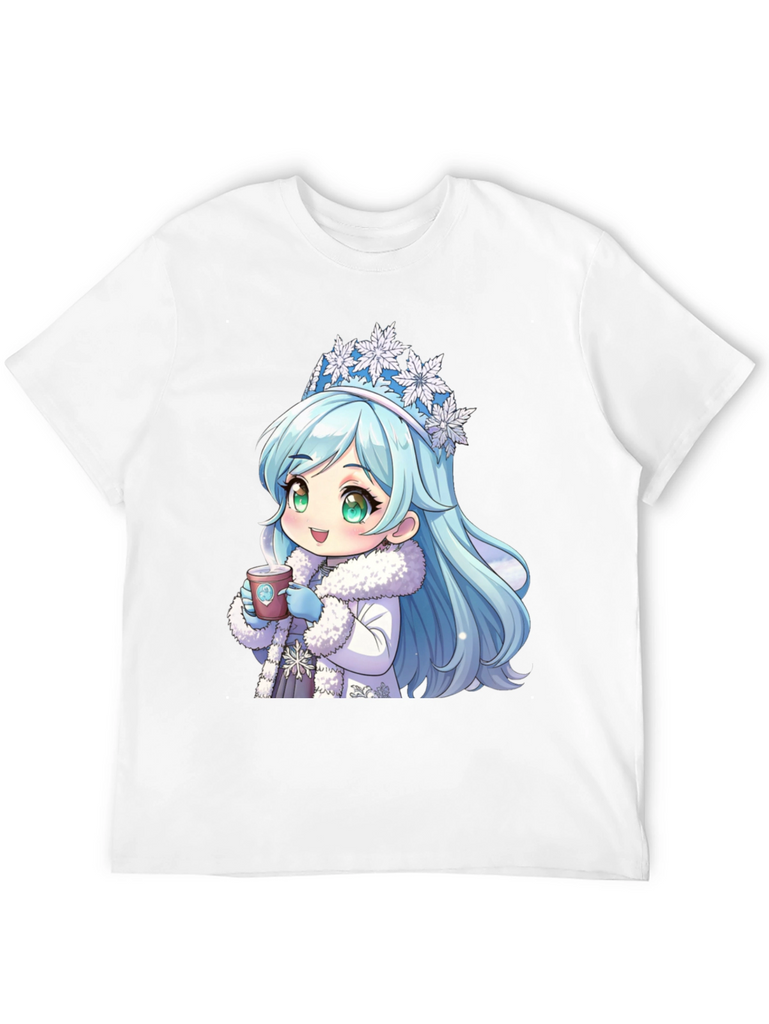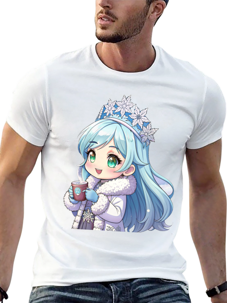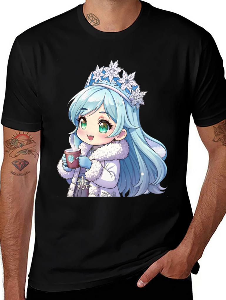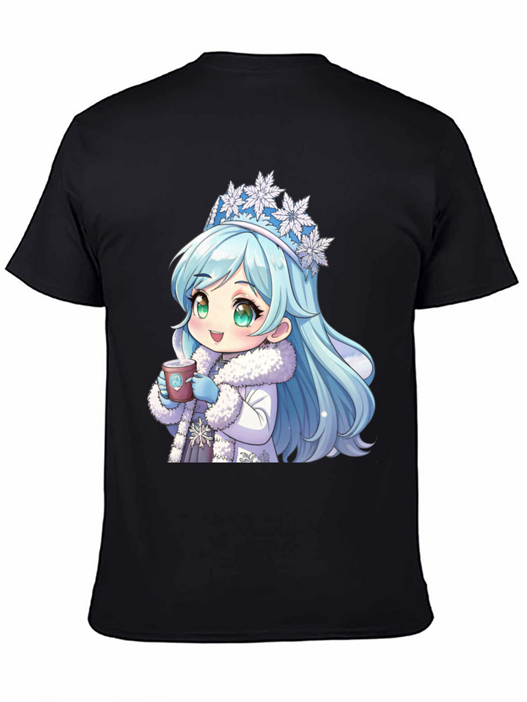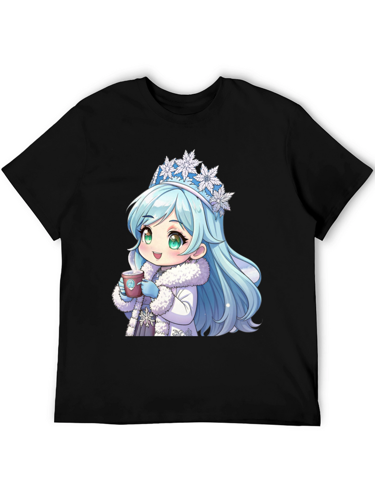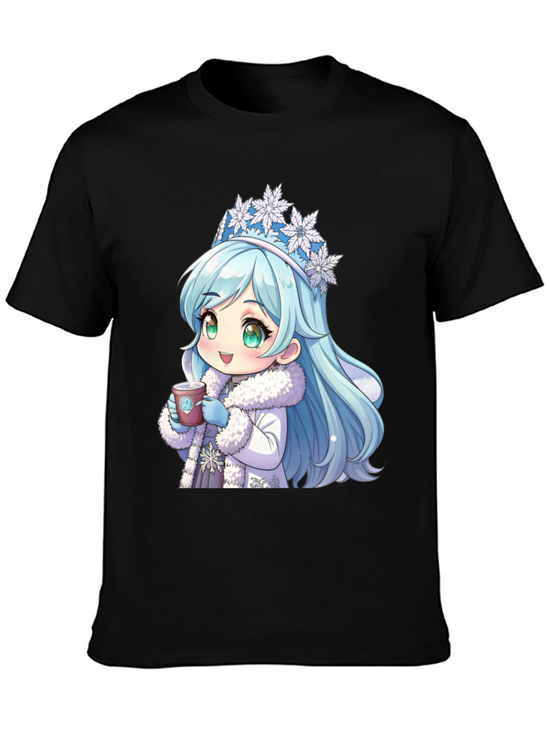 Stay cozy with this unique black t-shirt featuring an adorable anime-style winter princess. The design showcases a cute character with ice-blue hair, a snowflake crown, and a warm, furry coat, holding a hot cup of coffee. This stylish and eye-catching shirt is made from comfortable, breathable fabric, perfect for casual wear. Ideal for anime enthusiasts and coffee lovers alike, it's a great conversation starter and a fun addition to any wardrobe. Show off your playful side with this charming tee, whether you're out with friends or relaxing at home.