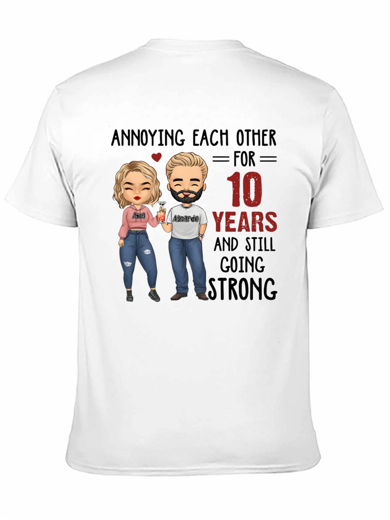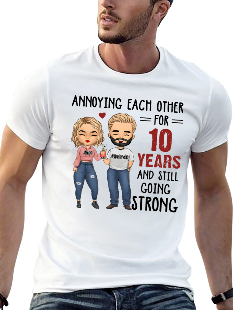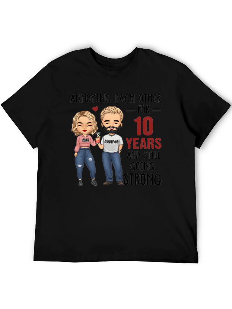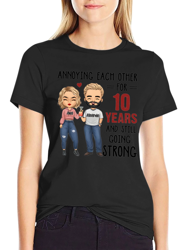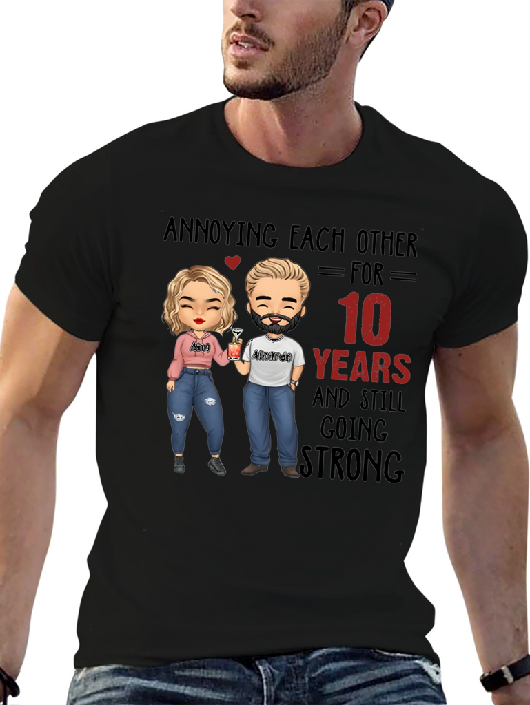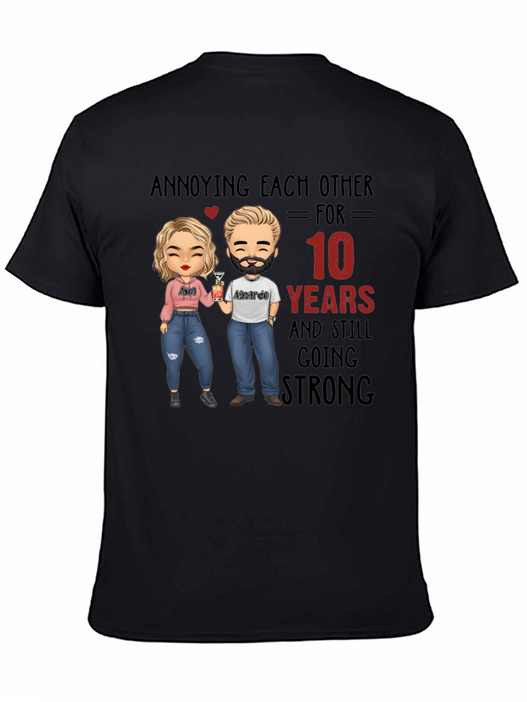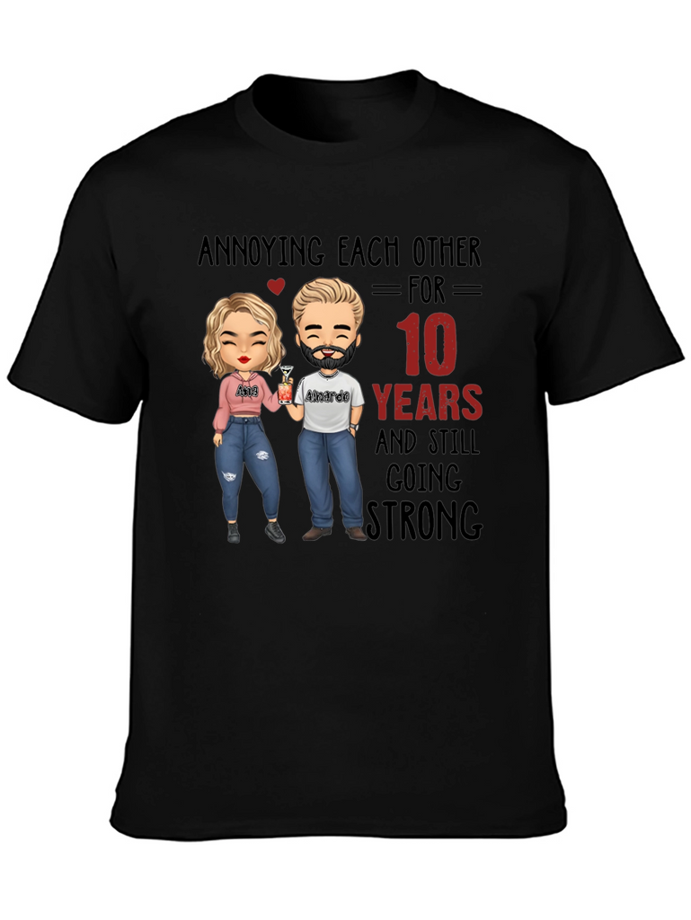 Celebrate a milestone with this charming black graphic tee! Featuring a delightful cartoon depiction of a couple toasting, this shirt humorously announces "Annoying Each Other = For = 10 Years and Still Going Strong." The fun design makes it a perfect gift for anniversaries, especially for couples who share a playful bond. Made from soft, breathable fabric, this tee ensures all-day comfort and lasting wear. It's a casual yet meaningful way to commemorate love and laughter. Wear it on date nights, anniversaries, or simply as a daily reminder of your enduring connection. Get yours today and wear your heart on your sleeve!