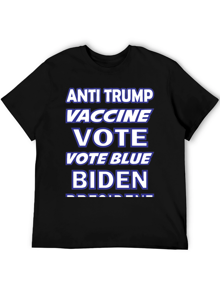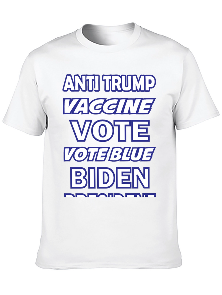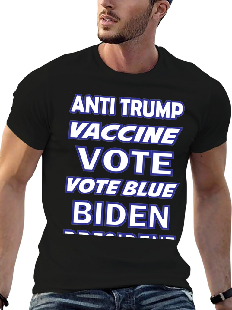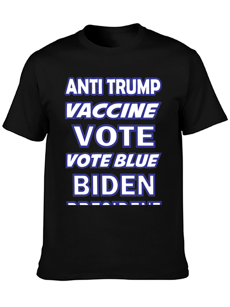 Show your support for the democratic party with this bold statement tee. This black t-shirt features the messages "Anti Trump", "Vaccine Vote", "Vote Blue" and "Biden", all in white text with a blue outline. Made of a soft, comfortable fabric, this political t-shirt is perfect for rallies, campaign events, or everyday wear. Let your voice be heard and make a statement with this eye-catching, must-have t-shirt. Whether you're expressing your political views or supporting your candidate, this tee will make an impact.