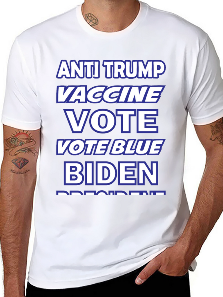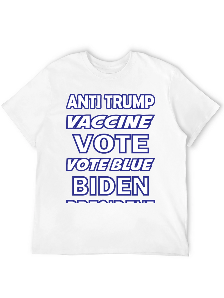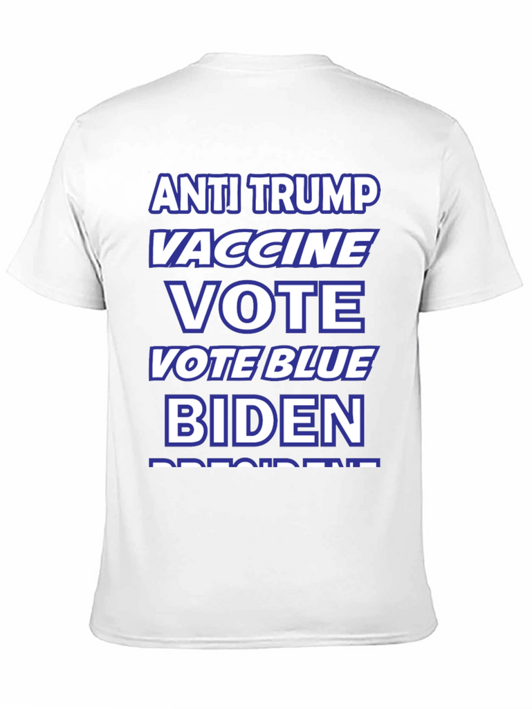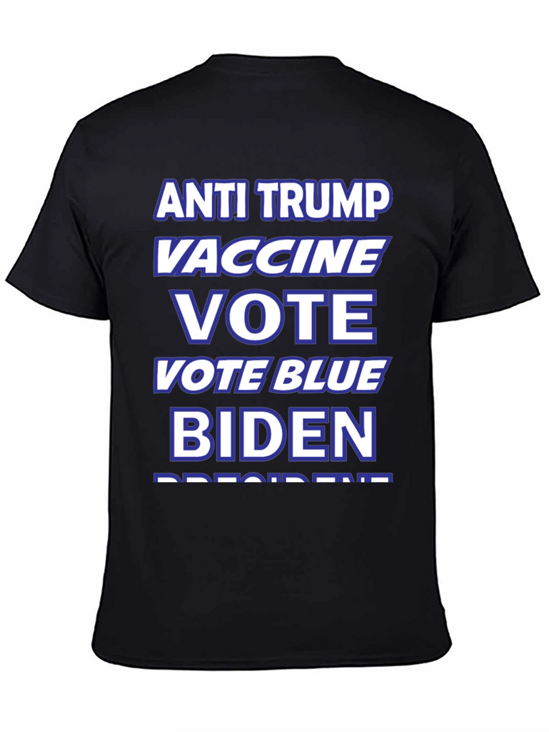 Show your support for the democratic party with this bold statement tee. This black t-shirt features the messages "Anti Trump", "Vaccine Vote", "Vote Blue" and "Biden", all in white text with a blue outline. Made of a soft, comfortable fabric, this political t-shirt is perfect for rallies, campaign events, or everyday wear. Let your voice be heard and make a statement with this eye-catching, must-have t-shirt. Whether you're expressing your political views or supporting your candidate, this tee will make an impact.
