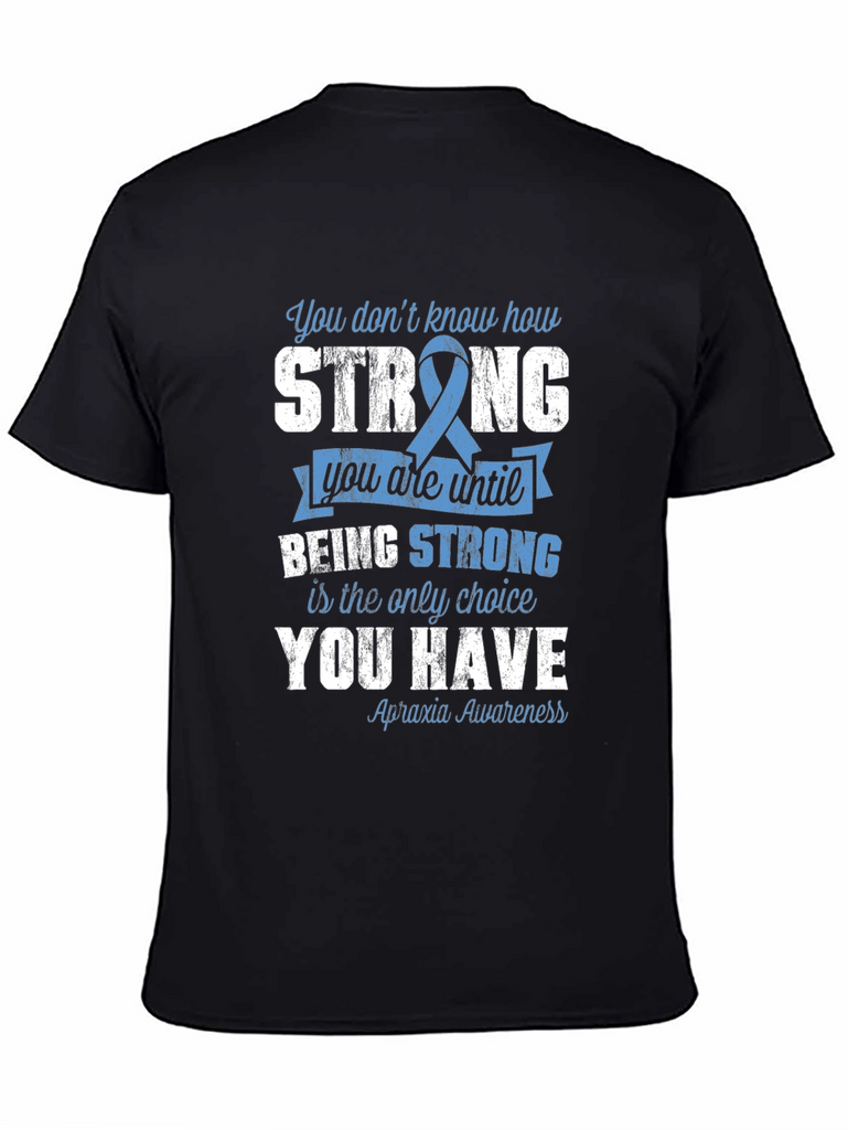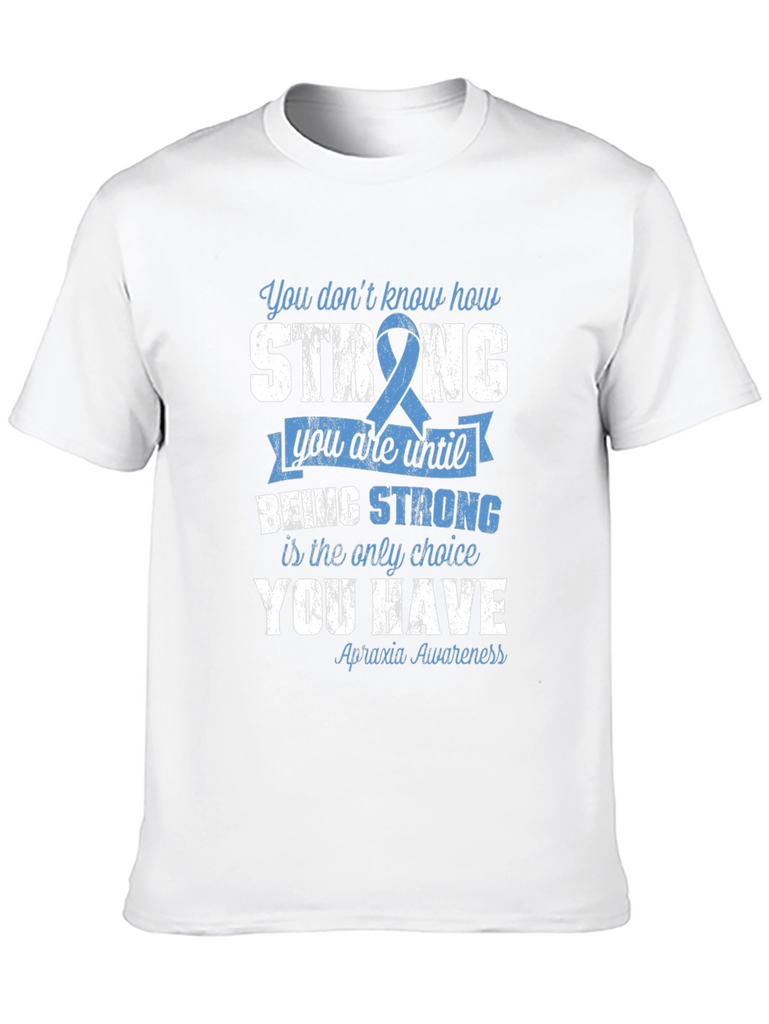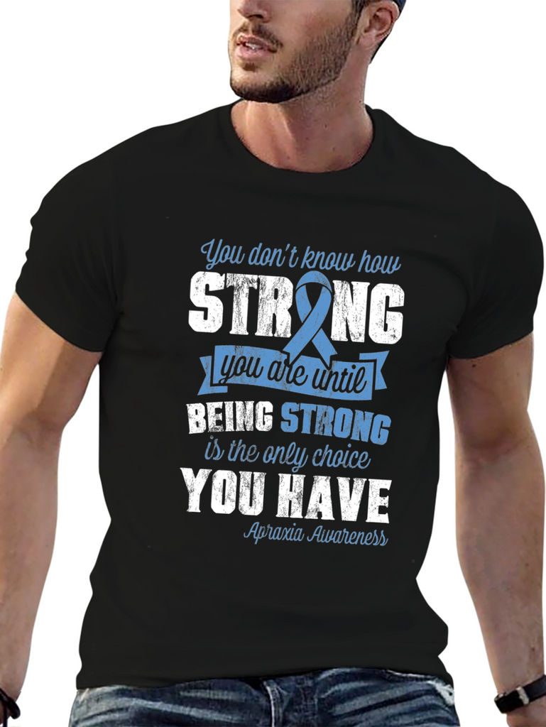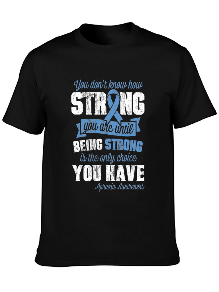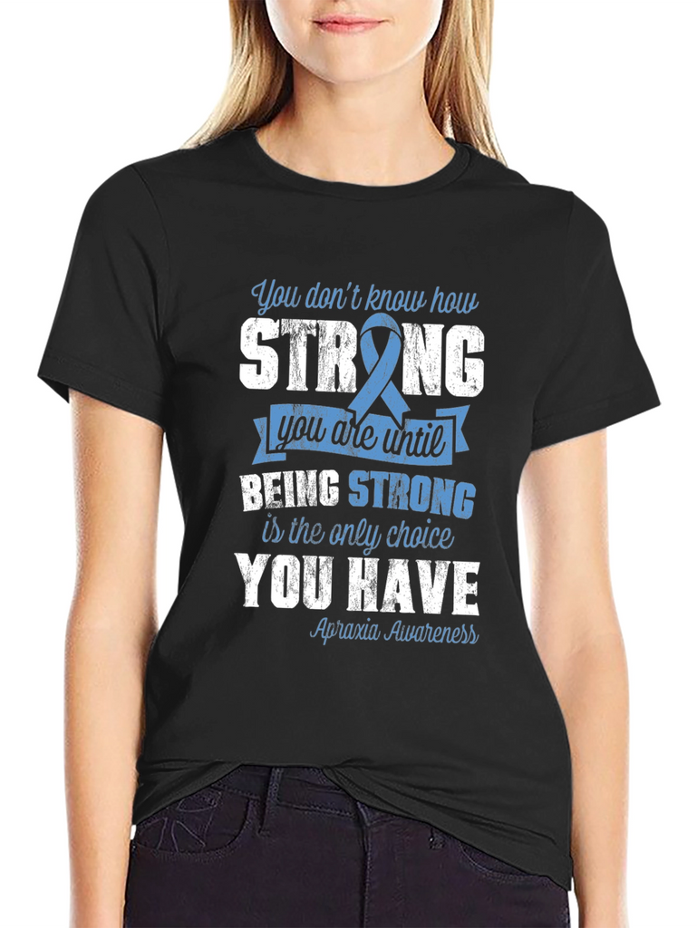 Show your support with this Apraxia Awareness t-shirt! The design features the words "You don't know how STRONG you are until BEING STRONG is the only choice YOU HAVE" in a distressed style font. An awareness ribbon accents the word STRONG. Perfect for raising awareness and showing solidarity for those affected by Apraxia. This stylish and meaningful t-shirt is a great way to start conversations and inspire hope. Wear it to walks, events, or as everyday wear. Get yours today and make a statement!