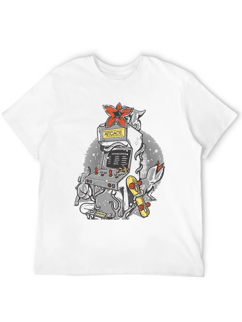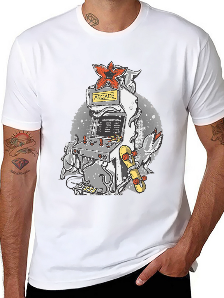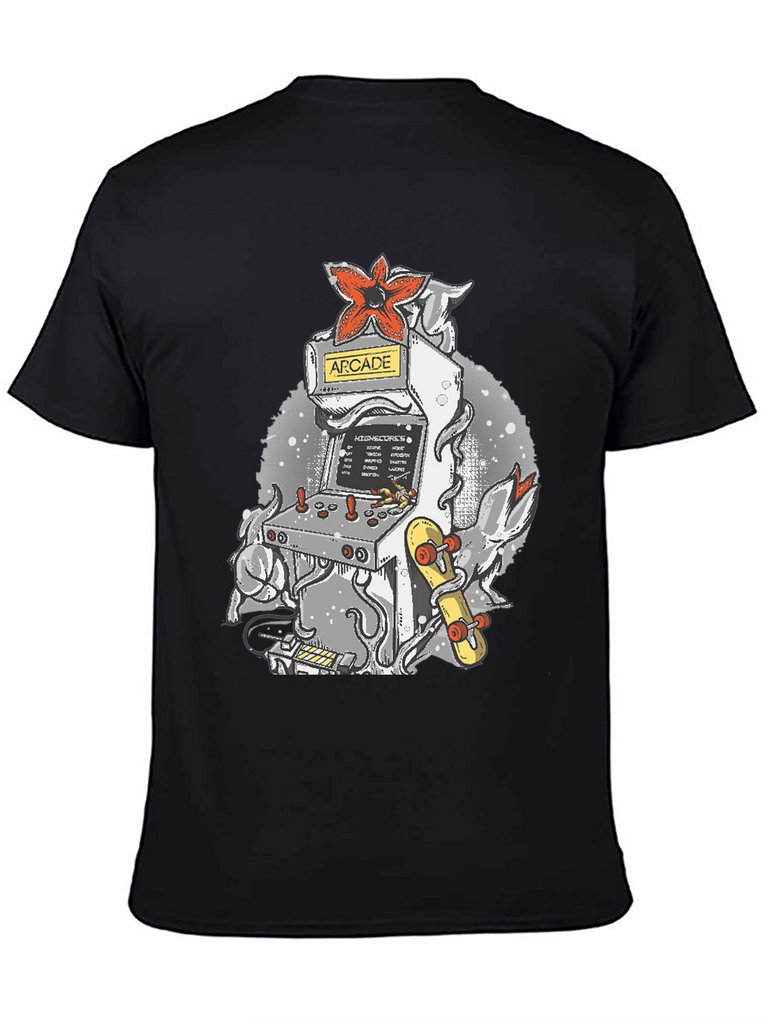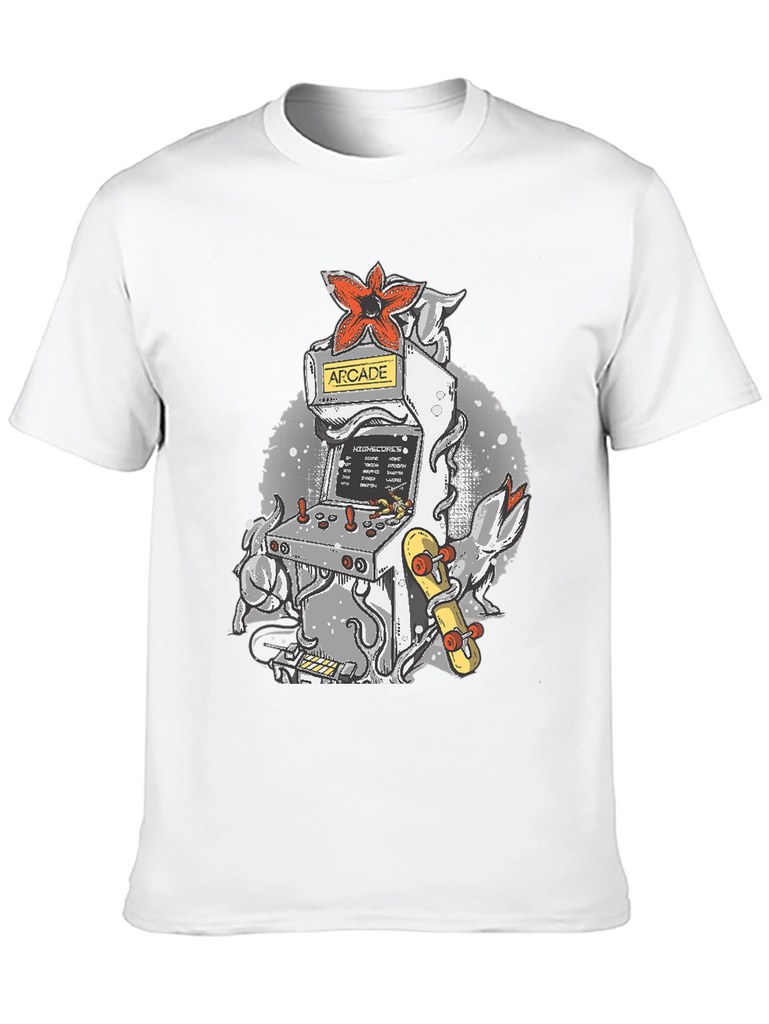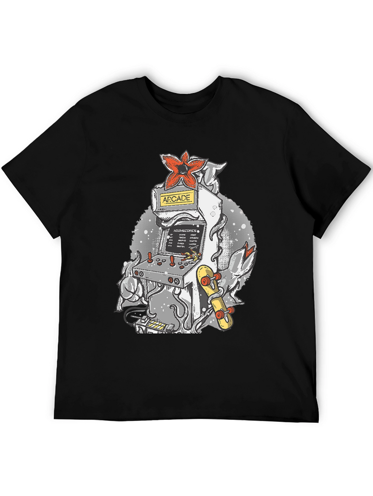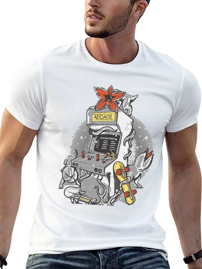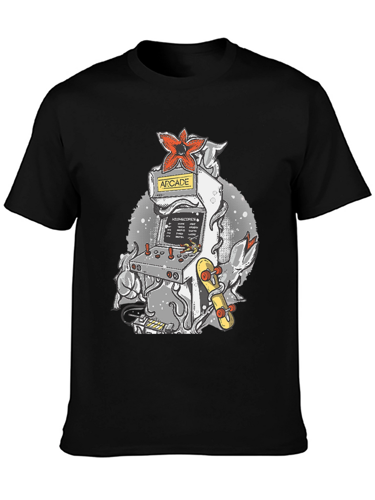 Level up your wardrobe with this unique t-shirt! Featuring a cool arcade game machine design, it's perfect for gamers and retro enthusiasts. The tee showcases a classic arcade cabinet adorned with a striking red Demogorgon flower and an eye-catching skateboard, all set against a stylish, speckled backdrop. Made from a comfortable, breathable fabric, this shirt is ideal for casual wear, gaming sessions, or showing off your love for vintage vibes. Stand out from the crowd and add a touch of nostalgia to your everyday look with this awesome tee!