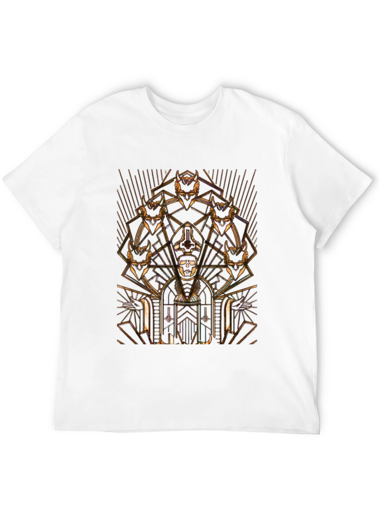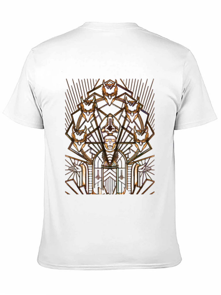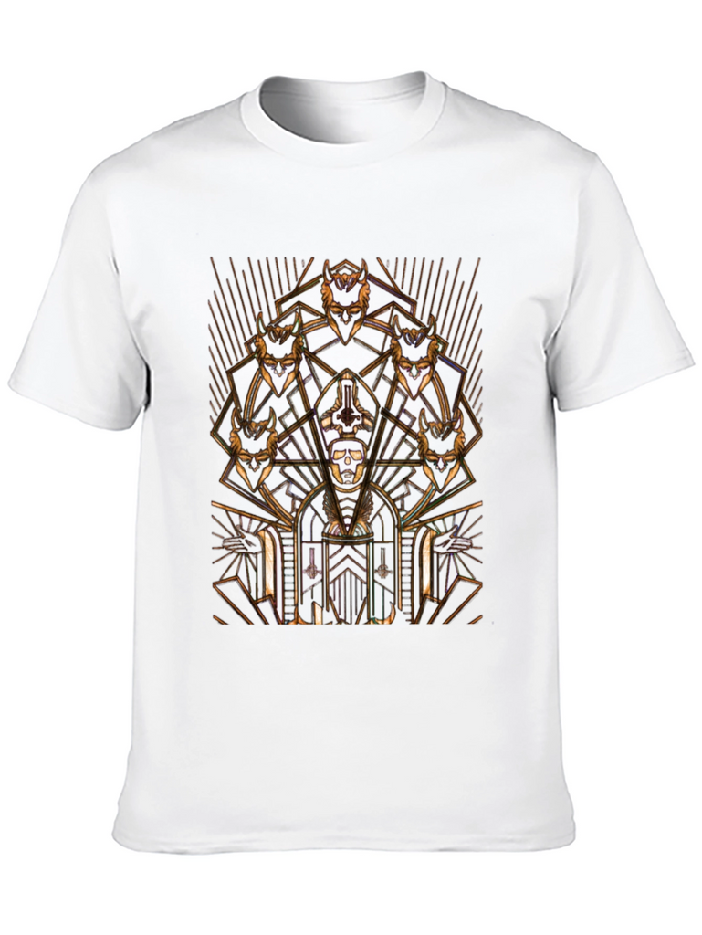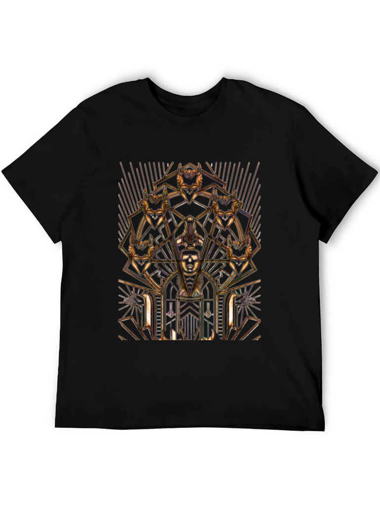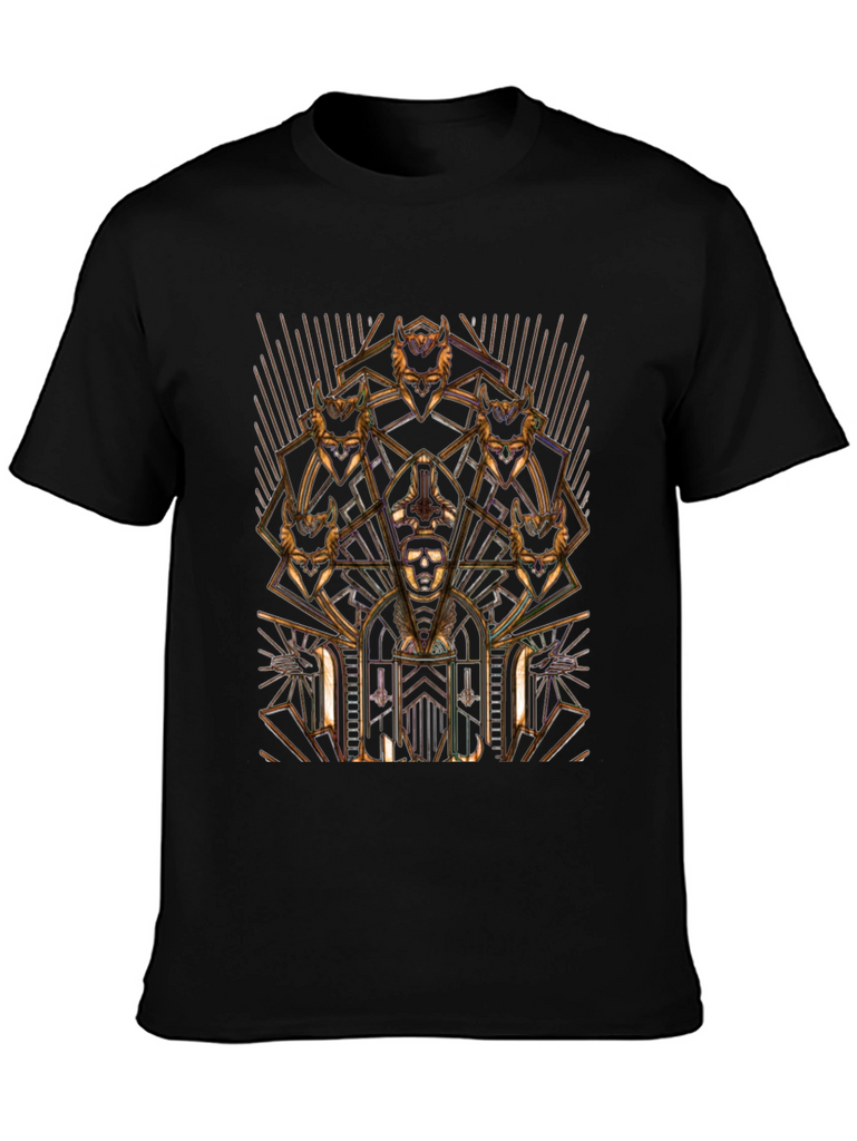 Embrace bold style with this striking black t-shirt featuring an elaborate art deco graphic. The design showcases a symmetrical pattern reminiscent of ancient Egyptian pharaohs, intertwined with geometric shapes and wolf-like figures. Metallic gold accents highlight the detailed linework, giving the shirt a touch of opulence. Crafted from a comfortable, breathable fabric, this tee is perfect for adding a unique edge to your casual wear. Ideal for pairing with jeans or dressing up with a blazer, it’s a versatile piece for any wardrobe. Make a statement and showcase your individual style with this standout graphic tee.