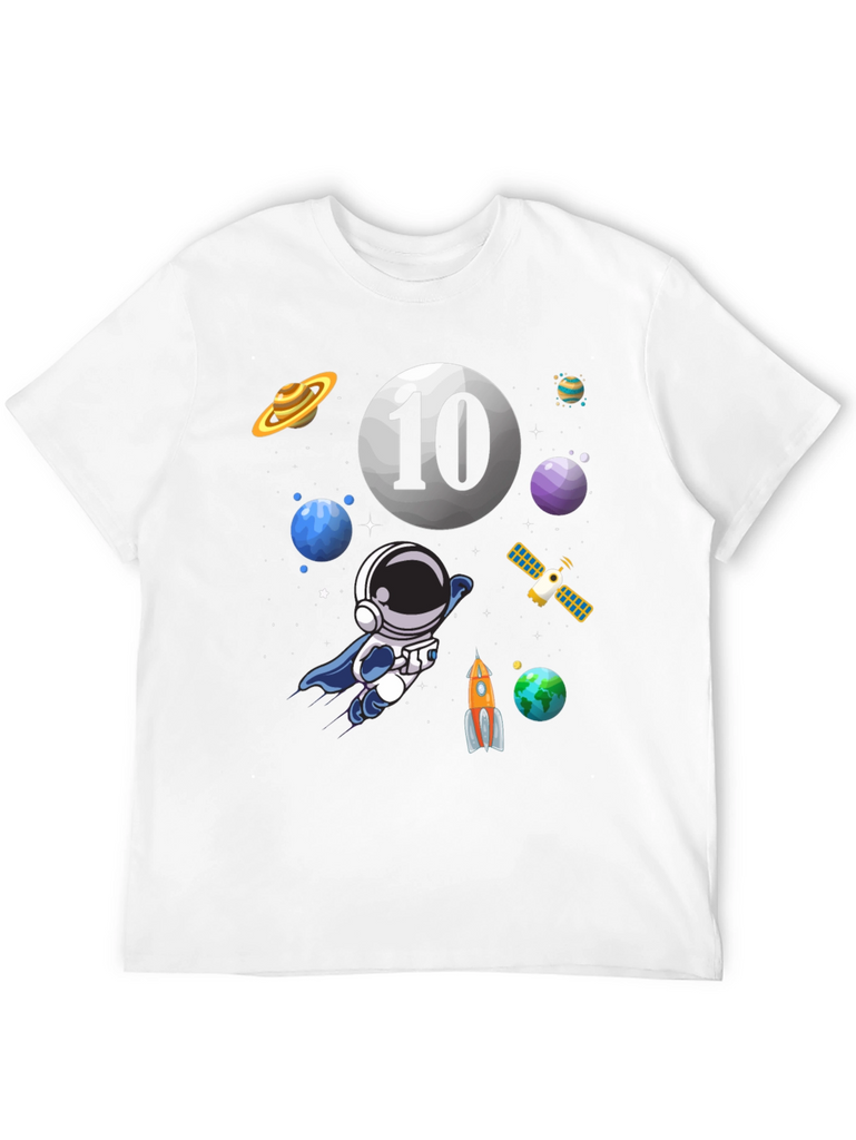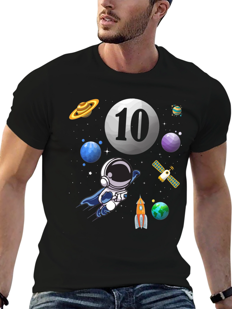 Celebrate a milestone birthday with this fun astronaut-themed t-shirt. The black tee features a vibrant, cartoon-style graphic with an astronaut soaring through space. Planets, a satellite, and a rocket ship surround him, along with the number "10" prominently displayed in a space-themed design. Perfect for a 10-year-old's birthday party or everyday wear. This shirt combines comfort and style, making it a fantastic gift. The graphic print is bold and eye-catching, ensuring the birthday boy stands out. Get ready for an out-of-this-world celebration!
