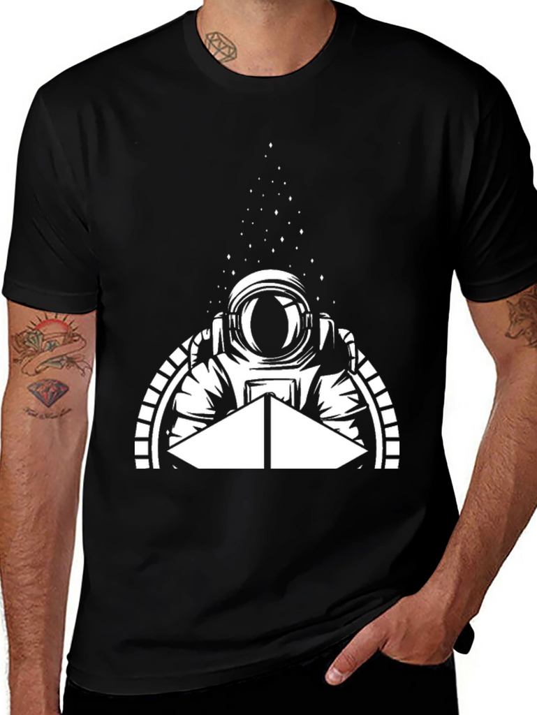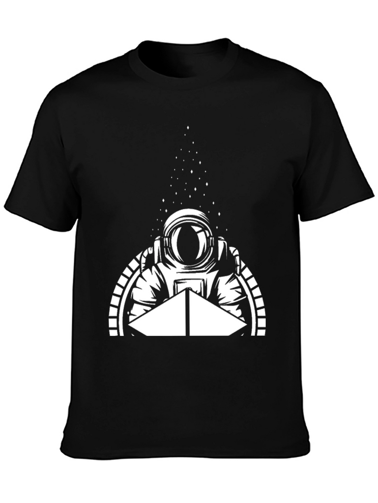Explore the cosmos in style with this eye-catching graphic tee. Featuring a bold astronaut design against a sleek black backdrop, this t-shirt is perfect for space enthusiasts and fashion-forward individuals alike. The clean, white illustration pops, showcasing an astronaut surrounded by a star-filled sky. Made from a comfortable, breathable fabric, this tee is ideal for everyday wear. Whether you're heading to a casual outing, a space-themed event, or simply lounging at home, this shirt will keep you looking and feeling great. A unique and stylish statement piece that's sure to turn heads.