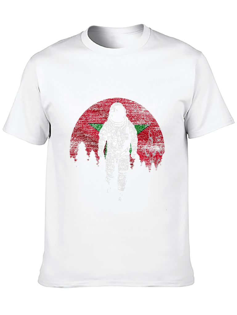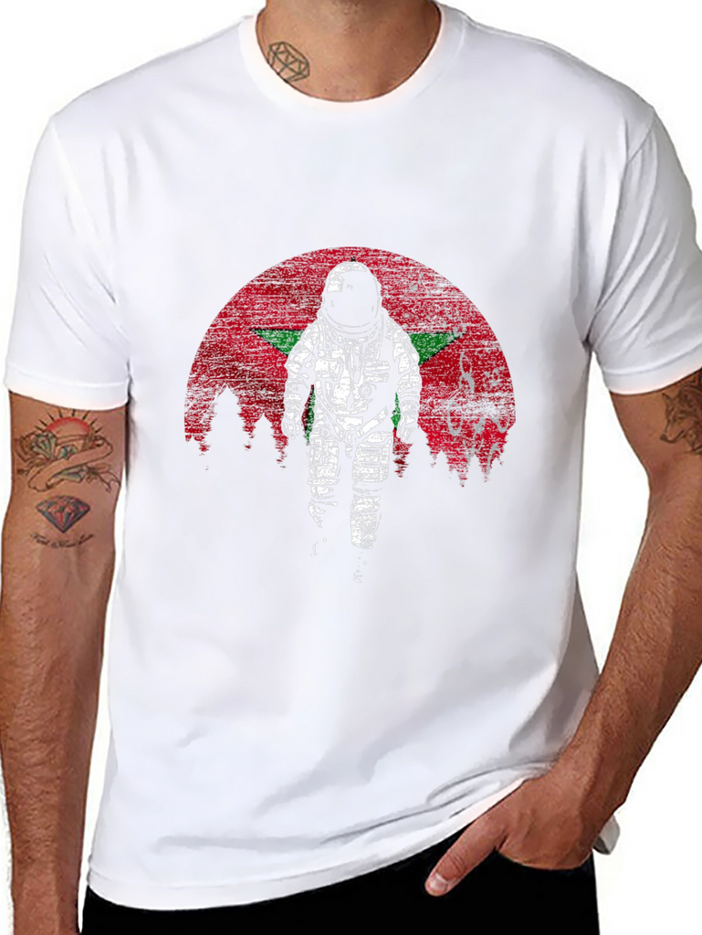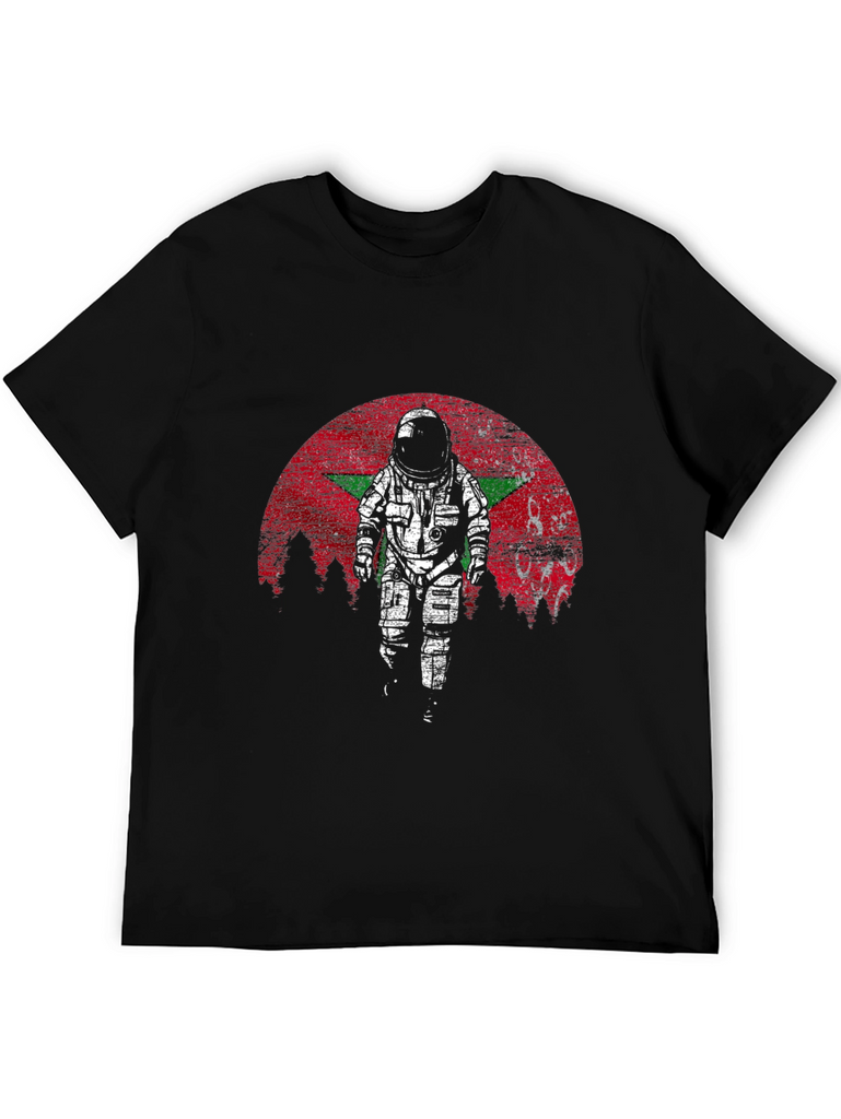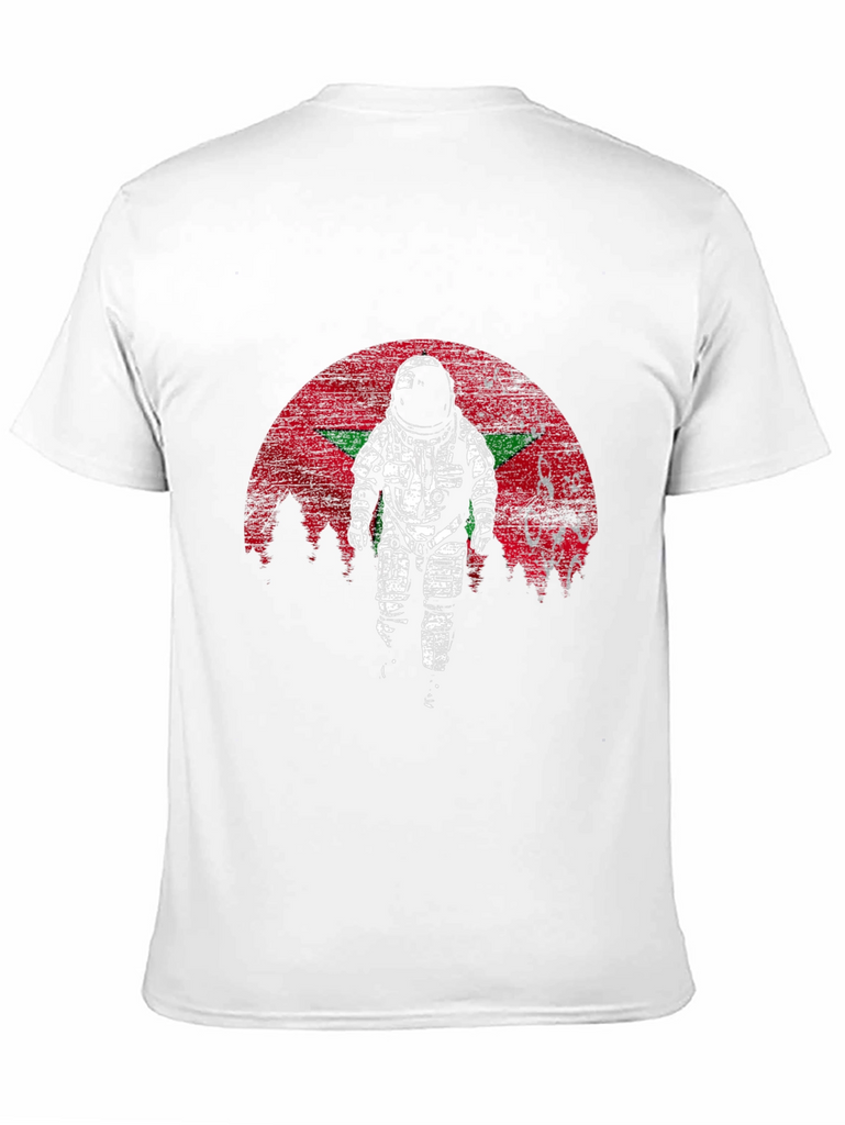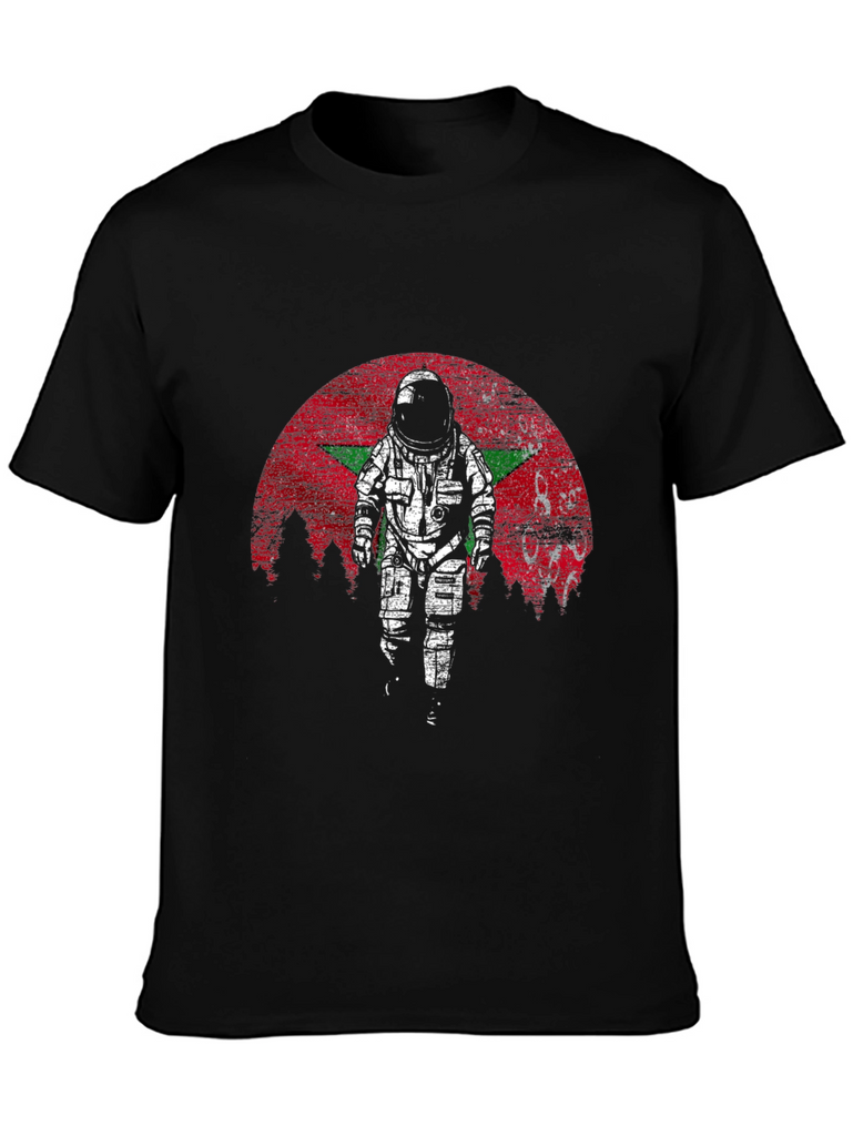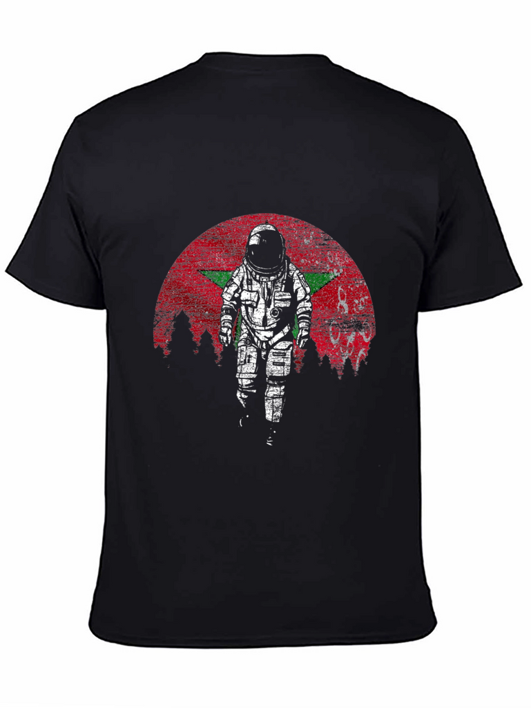 Show your love for space and Morocco with this unique t-shirt. It features a striking graphic of an astronaut in front of a distressed-style Moroccan flag. The design is printed on a comfortable, black cotton blend tee. The bold graphic makes a statement while providing a casual, stylish look. Perfect for everyday wear, space enthusiasts, or anyone proud of their Moroccan heritage. It's a great conversation starter and a way to showcase your personality. A standout piece for any wardrobe!