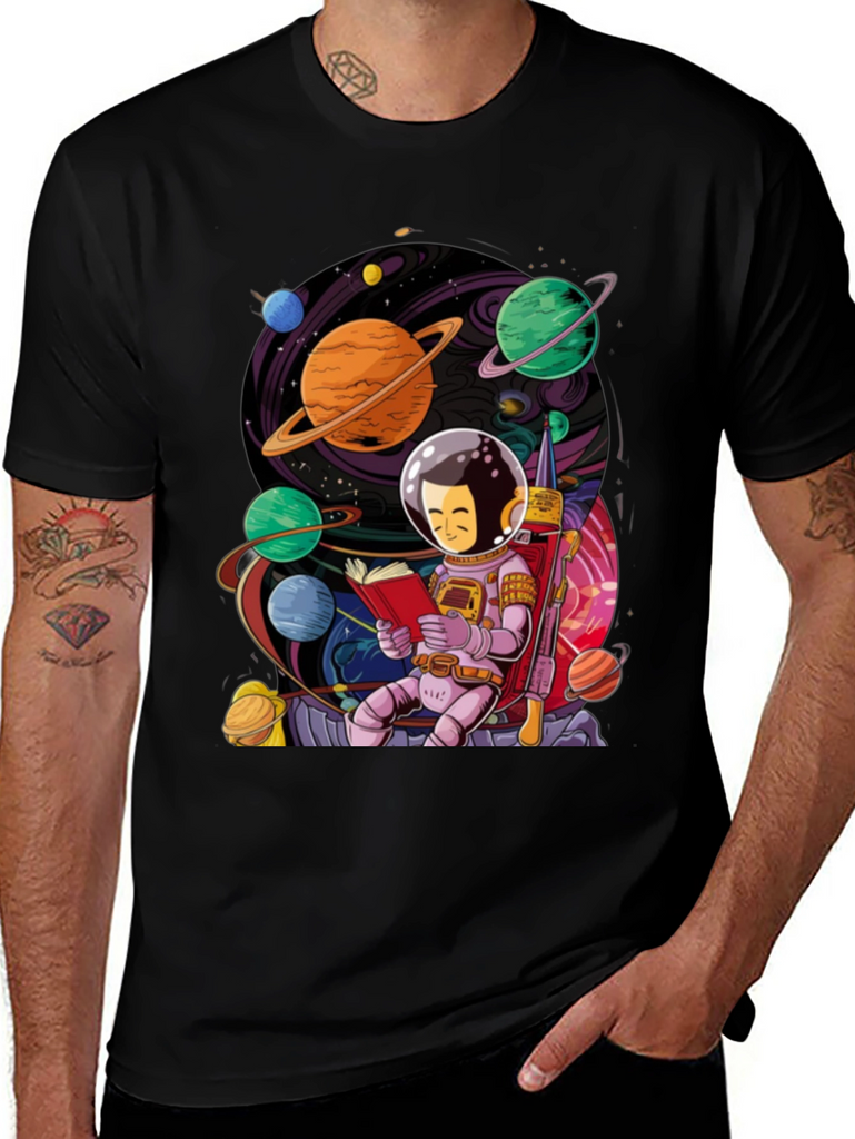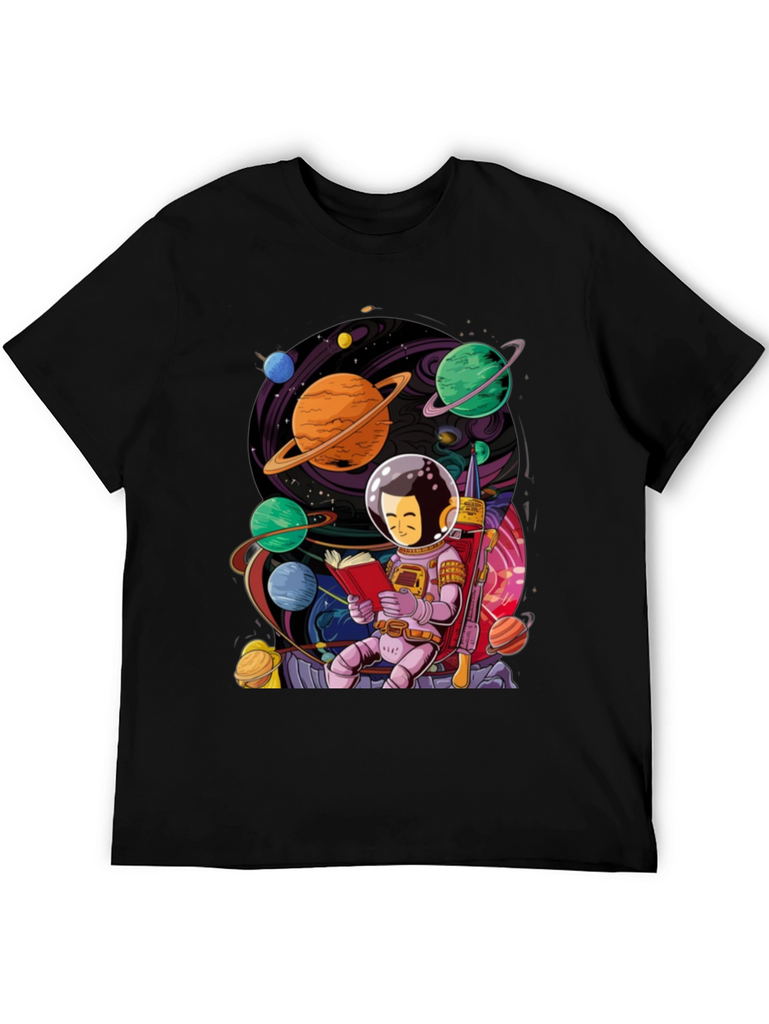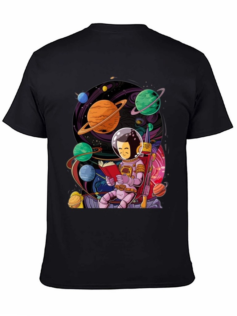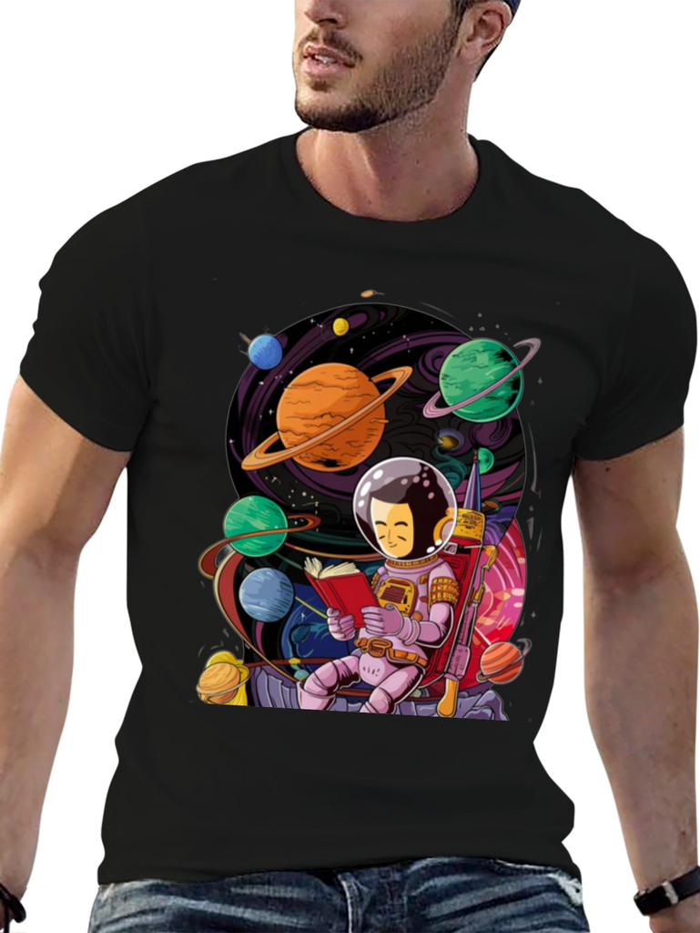 Show off your love for space and reading with this unique graphic t-shirt. The design features a charming astronaut character engrossed in a book amidst a vibrant, colorful planetary scene. Planets with rings, moons, and nebulas surround the central figure, creating an eye-catching and whimsical image. This shirt is perfect for book lovers, science enthusiasts, or anyone who appreciates a touch of cosmic art. The black background makes the graphic pop, ensuring you'll stand out in any crowd. Made from soft, breathable fabric for all-day comfort.