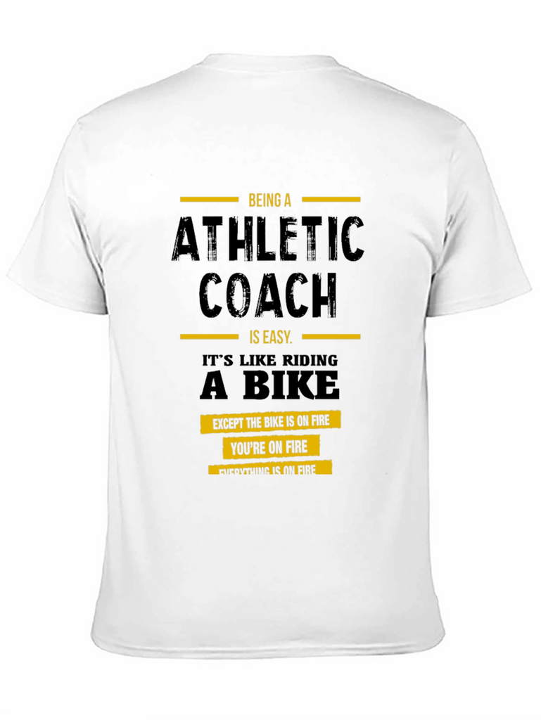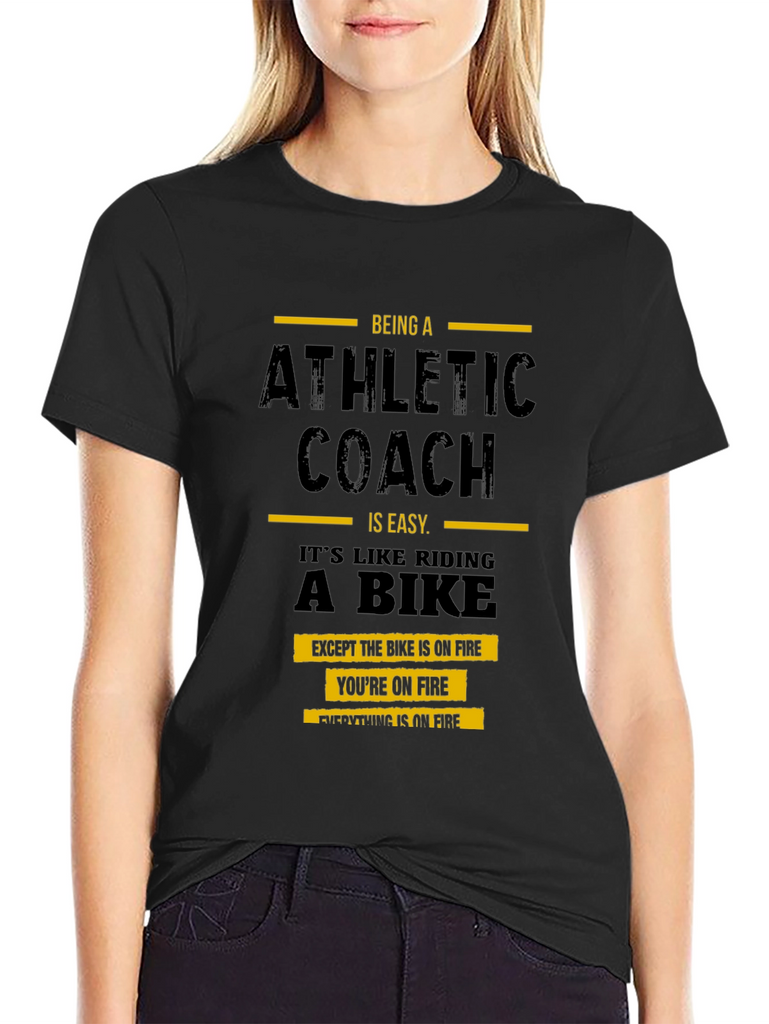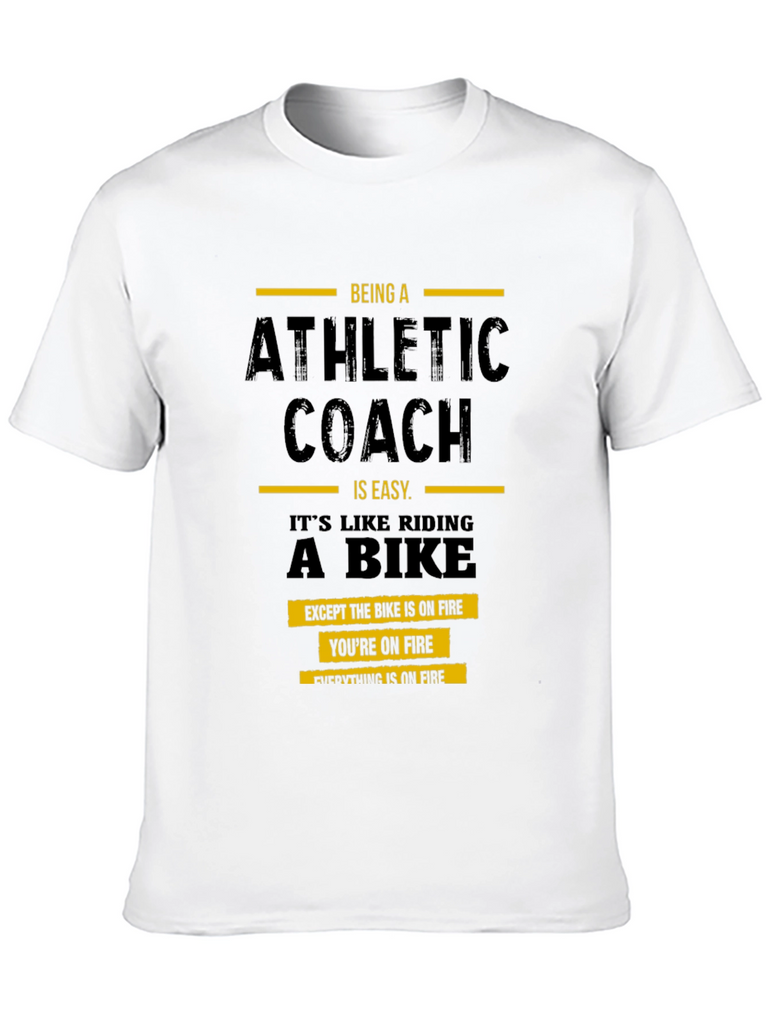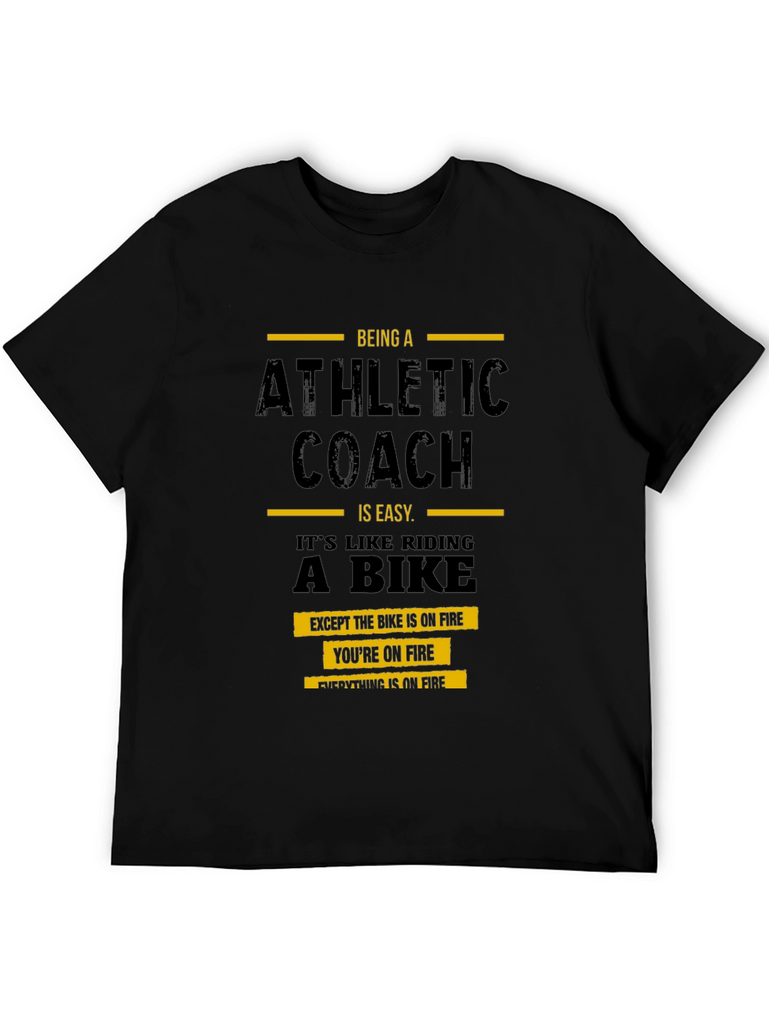 This black t-shirt features a humorous design perfect for athletic coaches with a sense of humor. The shirt boldly states "BEING A ATHLETIC COACH IS EASY. IT'S LIKE RIDING A BIKE EXCEPT THE BIKE IS ON FIRE YOU'RE ON FIRE EVERYTHING IS ON FIRE" in a mix of black and yellow lettering. Made from what appears to be a comfortable cotton blend, this tee is ideal for casual wear, coaching sessions, or as a fun gift for your favorite coach. Show off your passion and a bit of self-deprecating humor with this unique t-shirt. A great conversation starter and a comfortable addition to any wardrobe.