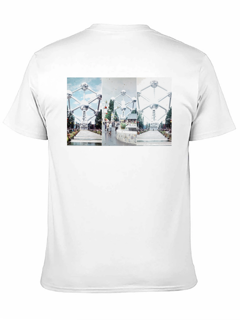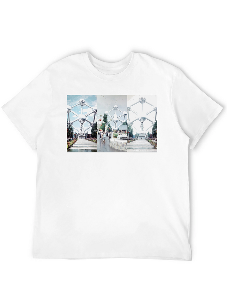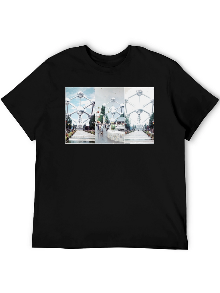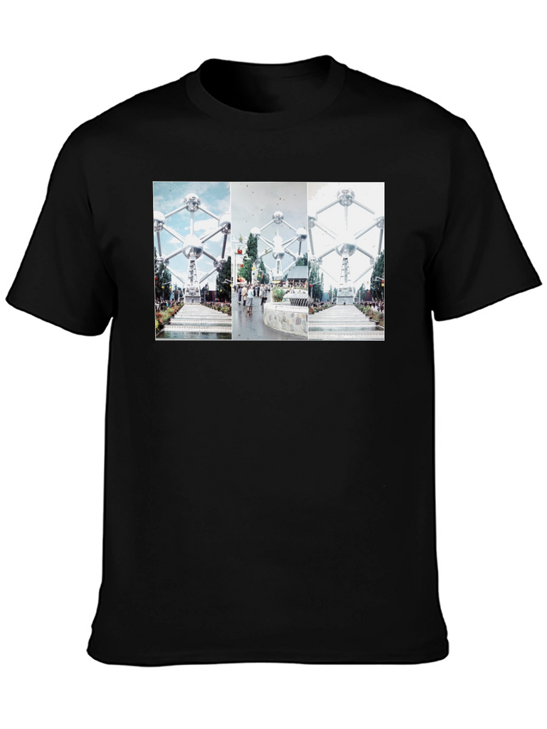 Showcase your love for iconic architecture with this eye-catching black graphic tee. The shirt features a unique triptych image of the Atomium in Brussels, a striking steel structure. This tee is crafted from a comfortable fabric blend, ensuring a soft feel and lasting wear. The clean black backdrop makes the architectural print pop, making it an excellent statement piece for casual outings, travel, or simply expressing your appreciation for design and travel. This stylish and comfortable T-shirt is perfect for casual wear. Available in multiple sizes.