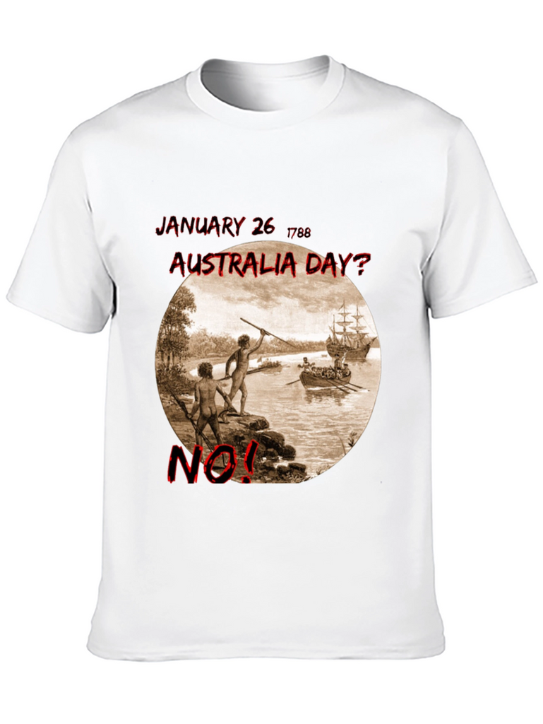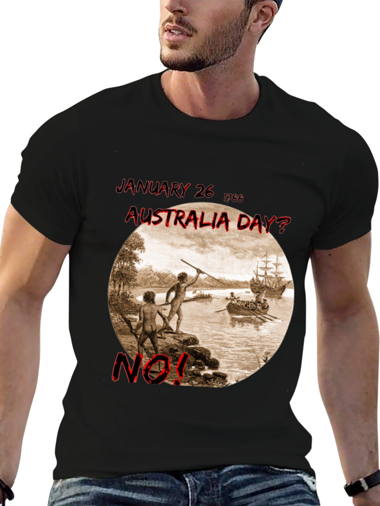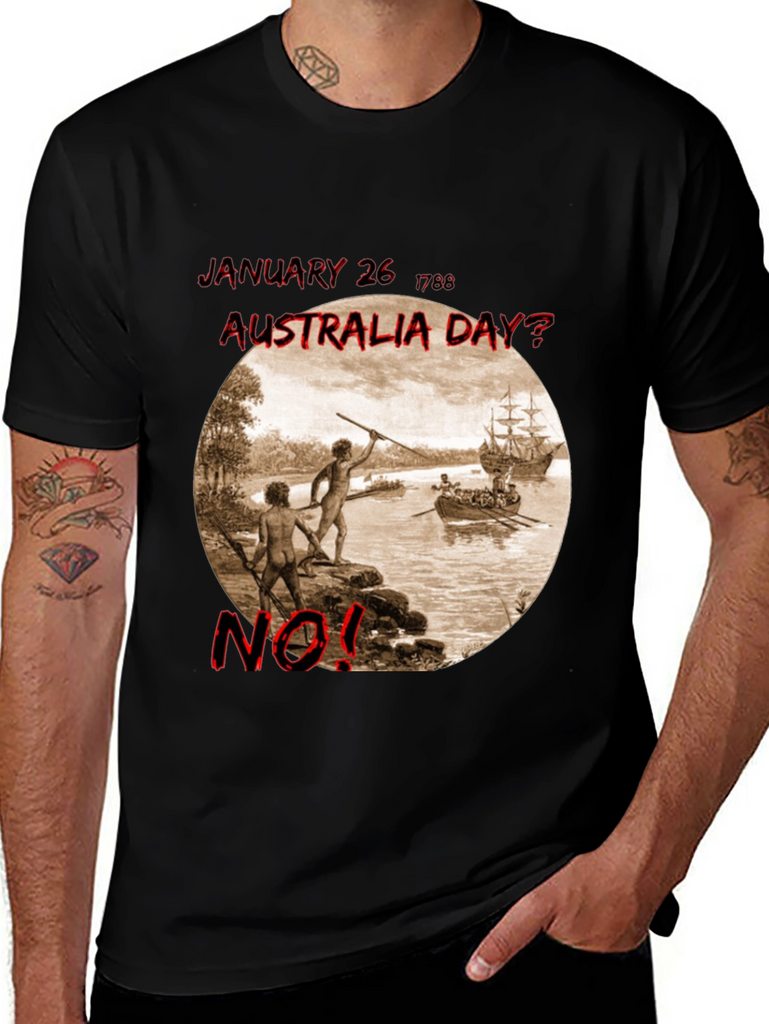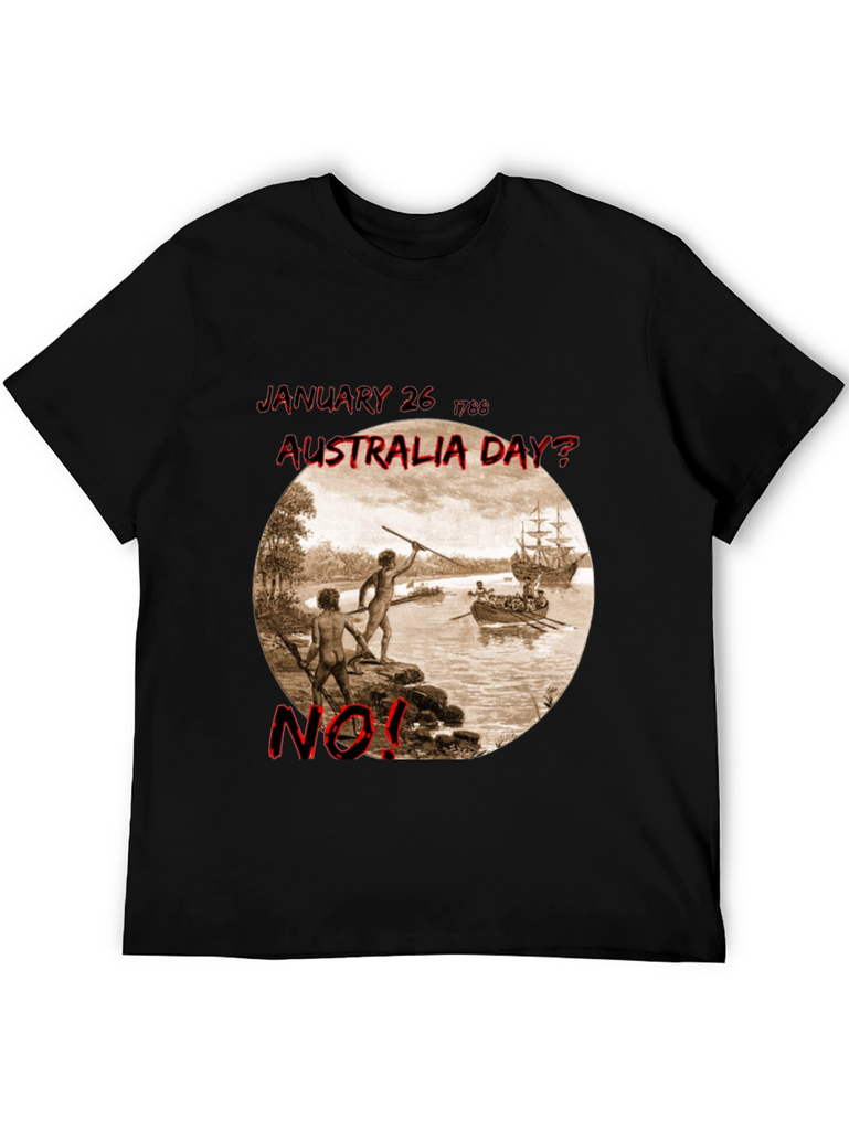 This striking black t-shirt features a bold and thought-provoking graphic. The design includes a sepia-toned illustration depicting Indigenous Australians observing European arrival by ship, overlaid with the words "JANUARY 26 1788 AUSTRALIA DAY? NO!" in a distressed, blood-red font. This shirt is perfect for individuals looking to make a statement and express their views on a sensitive historical topic. Made from a comfortable-looking fabric, this tee is ideal for casual wear and social gatherings. It’s sure to spark conversations and turn heads. Get yours today!