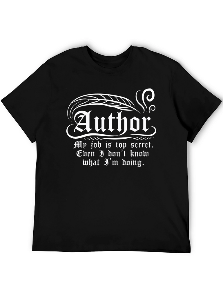 Show off your love for writing with this unique black T-shirt. It features the word "Author" in an elegant white font, decorated with feather and swirl details. Below, the humorous text "My job is top secret. Even I don't know what I'm doing" is printed, adding a touch of wit to the design. This comfortable tee is perfect for writers, book lovers, or anyone with a great sense of humor. Wear it casually or while working on your next masterpiece. Makes a great gift!