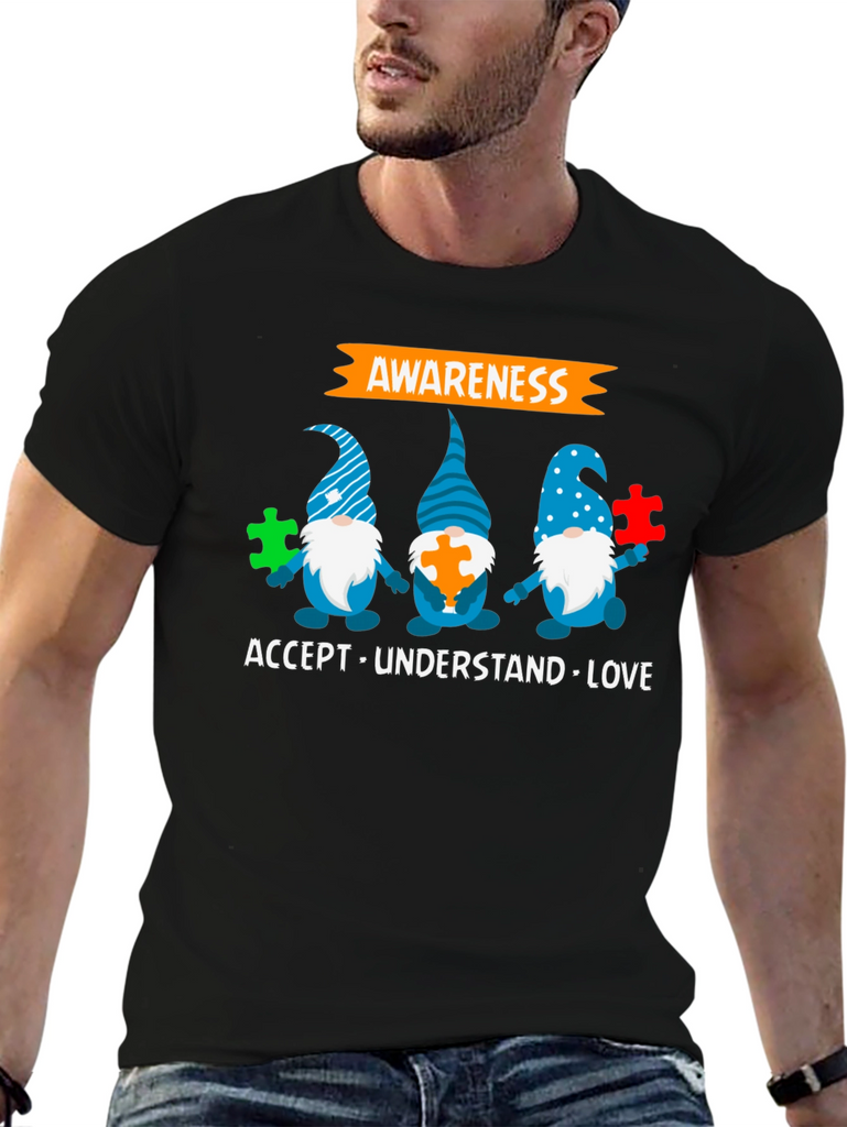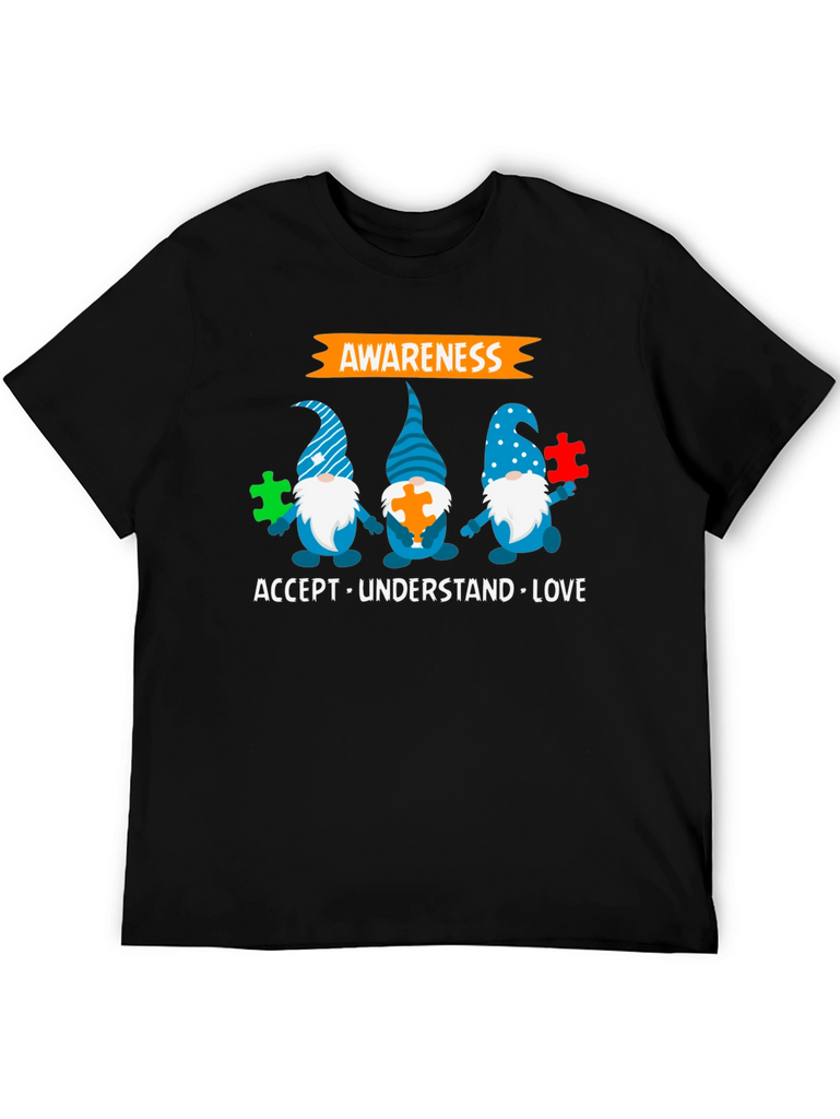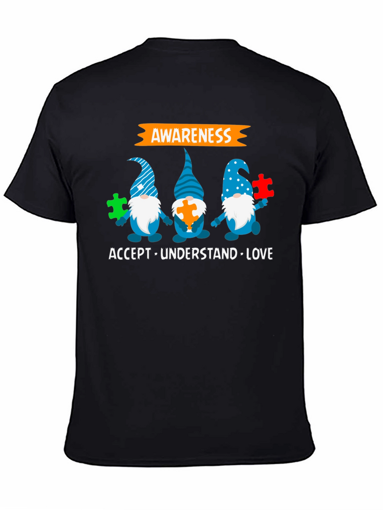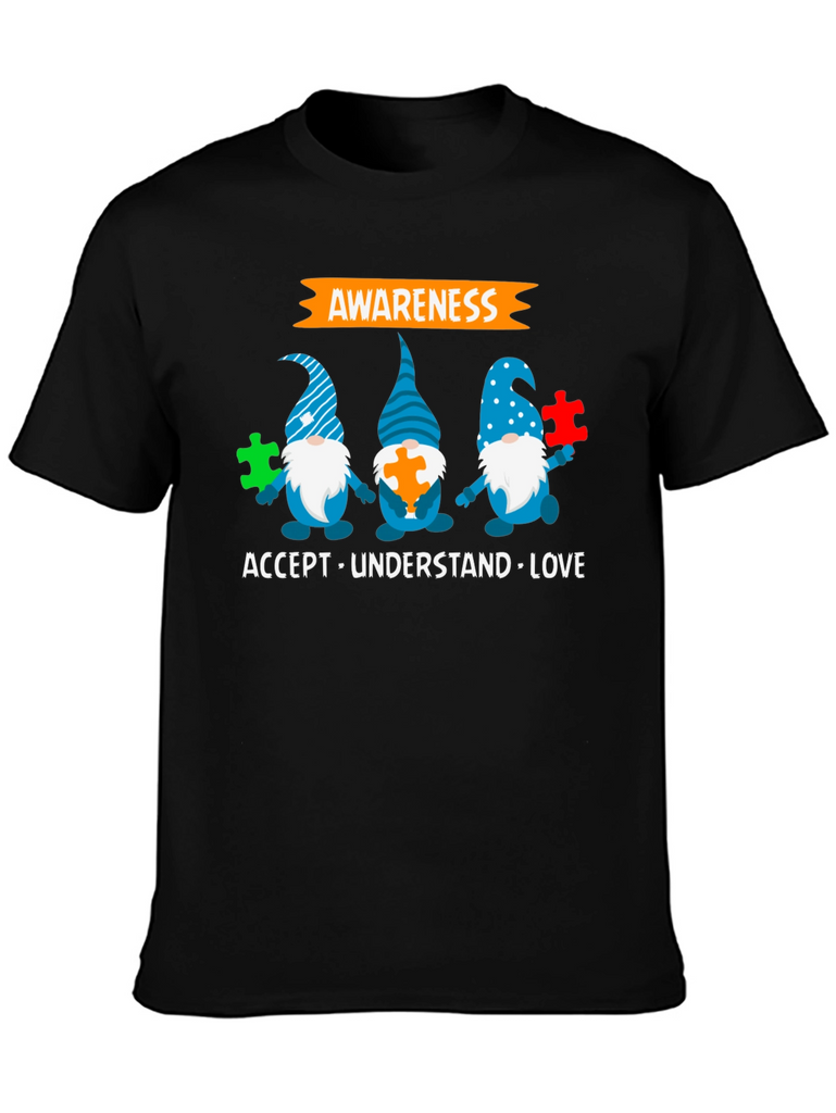 Show your support with this Autism Awareness t-shirt. The black tee features adorable gnome characters holding puzzle pieces, symbolizing autism awareness. Above the gnomes it reads "AWARENESS". The print also includes the message "ACCEPT - UNDERSTAND - LOVE." Ideal for raising awareness, participating in autism walks, or everyday wear. Crafted for comfort and designed to spread a message of acceptance and understanding. A meaningful addition to any wardrobe.