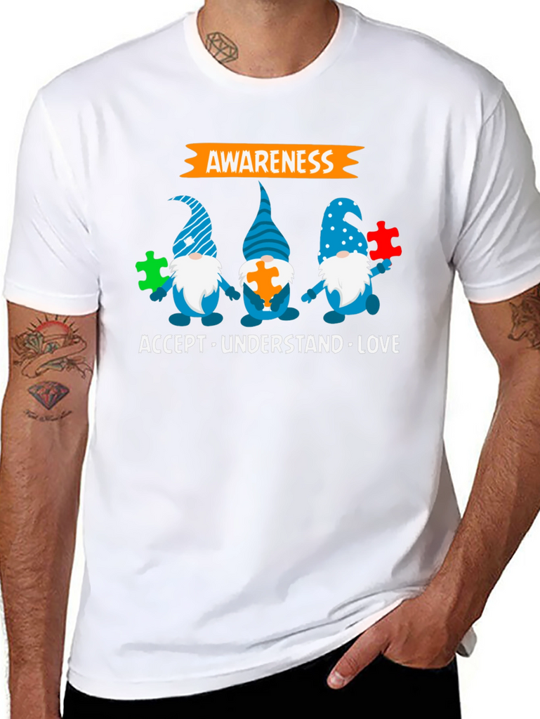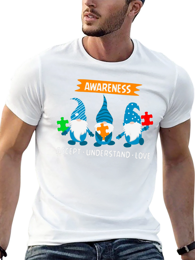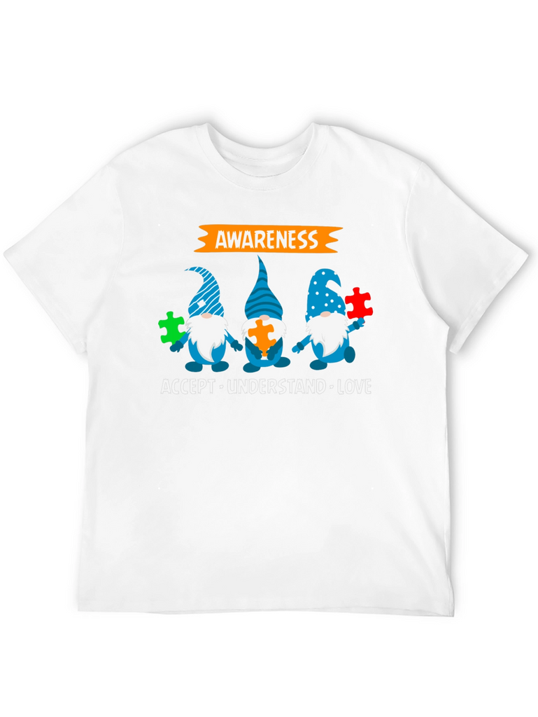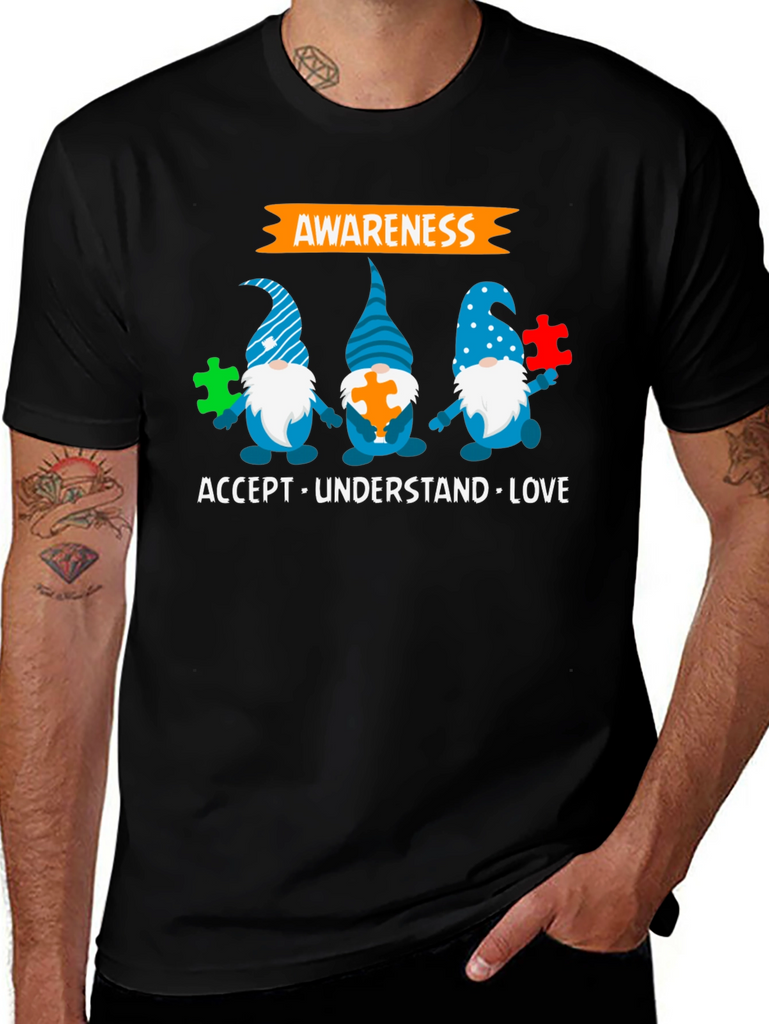 Show your support with this Autism Awareness t-shirt. The black tee features adorable gnome characters holding puzzle pieces, symbolizing autism awareness. Above the gnomes it reads "AWARENESS". The print also includes the message "ACCEPT - UNDERSTAND - LOVE." Ideal for raising awareness, participating in autism walks, or everyday wear. Crafted for comfort and designed to spread a message of acceptance and understanding. A meaningful addition to any wardrobe.
