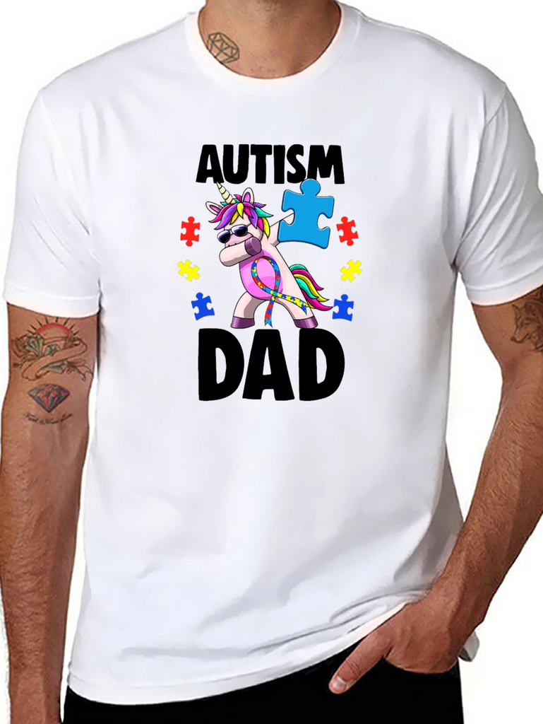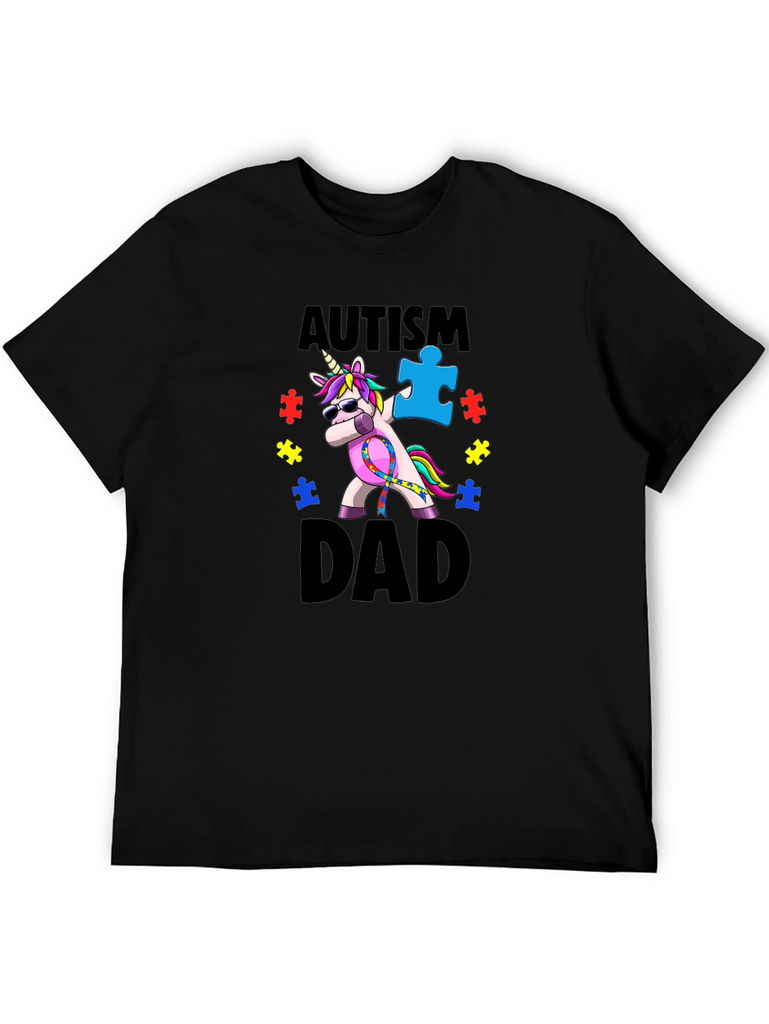 Show your support with this unique Autism Dad T-shirt. Featuring a colorful unicorn graphic wearing sunglasses and dabbing with an autism awareness puzzle piece, this tee is both fun and meaningful. The bold "Autism Dad" text makes a statement of pride and support. Perfect for autism awareness events, family gatherings, or everyday wear, this T-shirt is a comfortable and stylish way to raise awareness. Made from a soft, durable fabric, it’s designed for lasting wear and comfort. Ideal for dads who champion autism awareness.