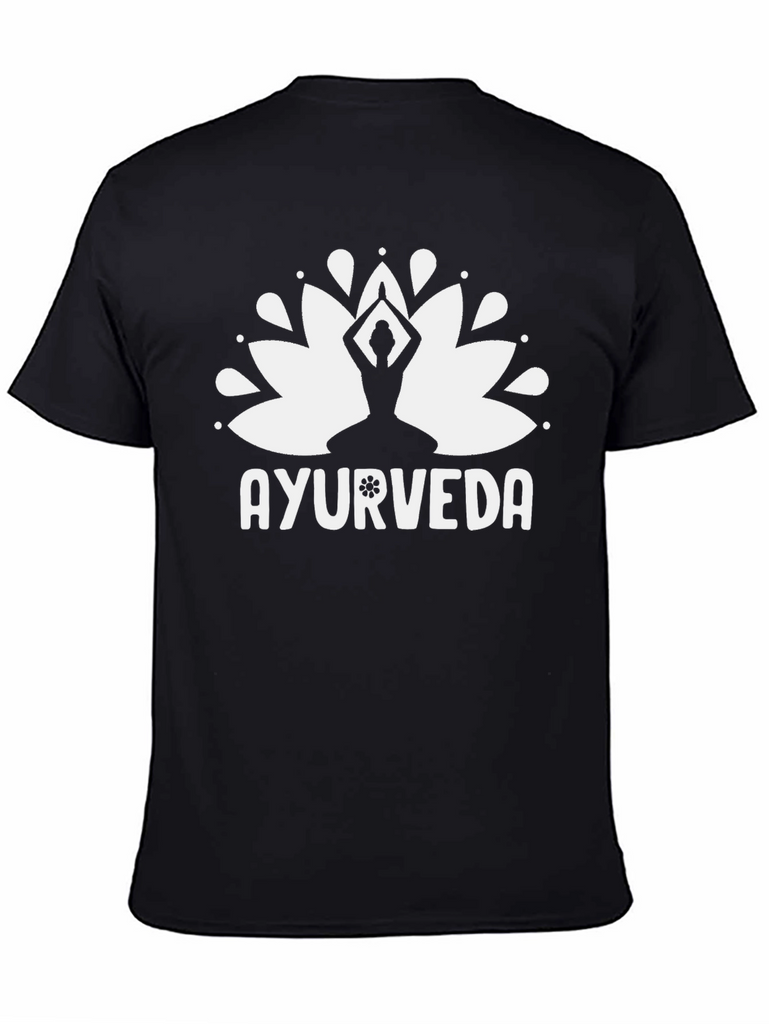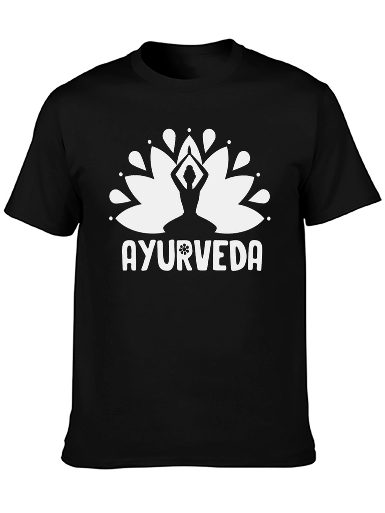 Embrace wellness with this stylish Ayurveda T-shirt. Featuring a striking lotus design with a yoga silhouette, this shirt promotes balance and inner peace. The word "Ayurveda" is boldly displayed, complete with a small flower symbol. Made from a comfortable, likely cotton-blend fabric, its classic fit makes it ideal for everyday wear, yoga sessions, or casual outings. Show your love for holistic health and mindful living with this unique and comfortable tee. A perfect gift for yoga enthusiasts, wellness advocates, or anyone seeking a touch of serenity in their wardrobe. Add a touch of mindful style to your everyday.