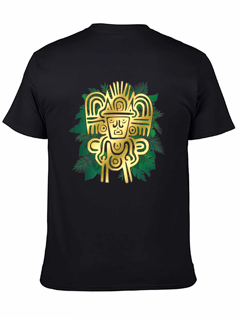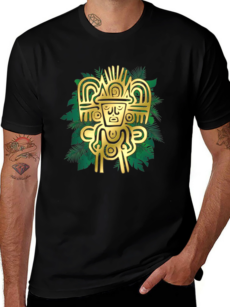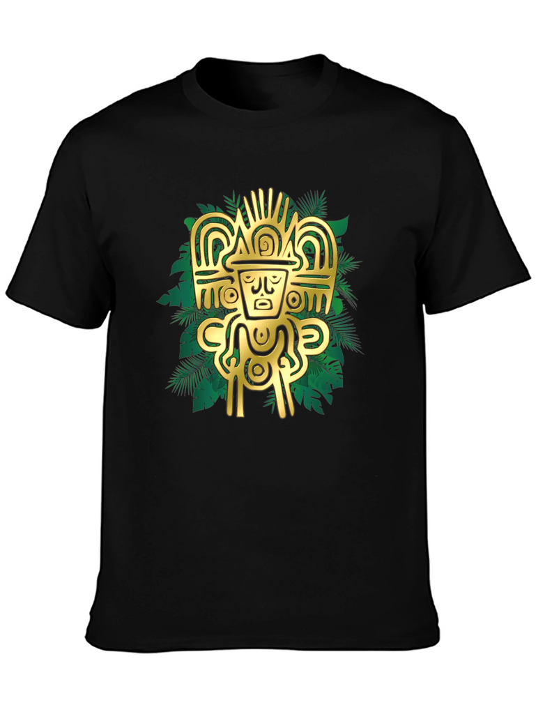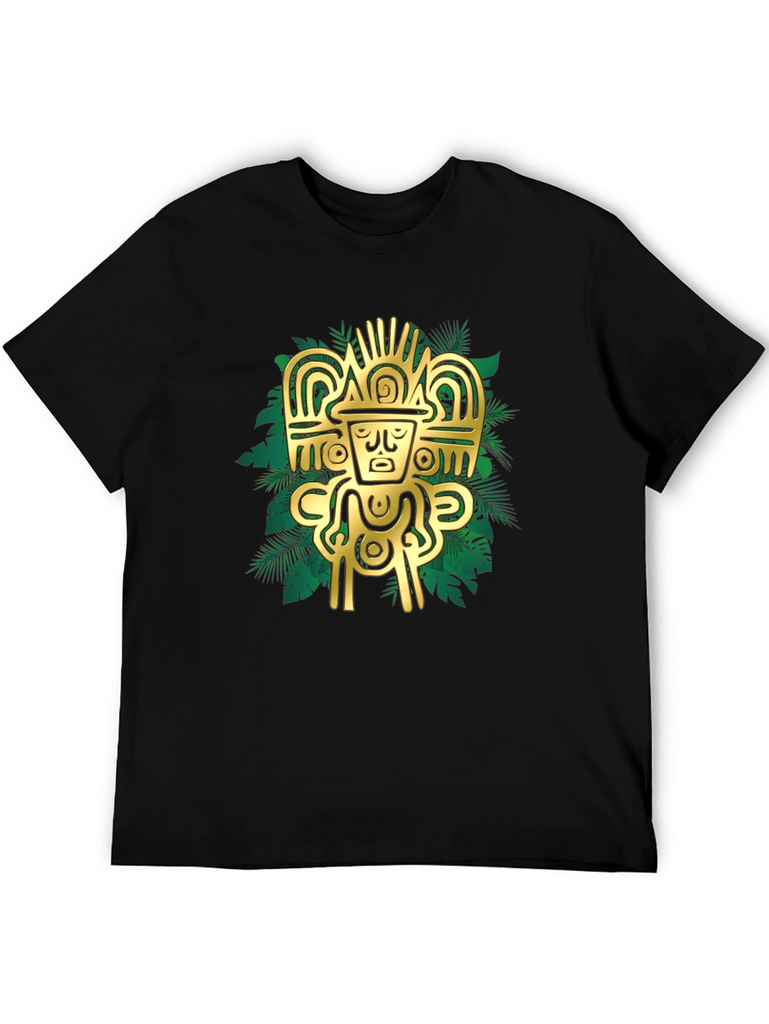 Elevate your style with this striking black t-shirt featuring a bold, golden Aztec-inspired graphic. The intricate design, set against a backdrop of stylized tropical leaves, creates a visually appealing contrast. Crafted from a comfortable, breathable fabric, this tee is perfect for casual wear or making a statement. Pair it with jeans or shorts for an effortlessly cool look. The design is sure to catch the eye and add a touch of mystique to any outfit. Experience the fusion of ancient art and modern fashion with this unique t-shirt.