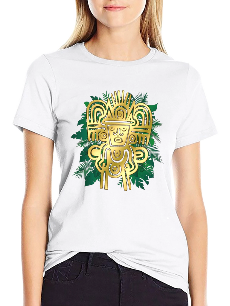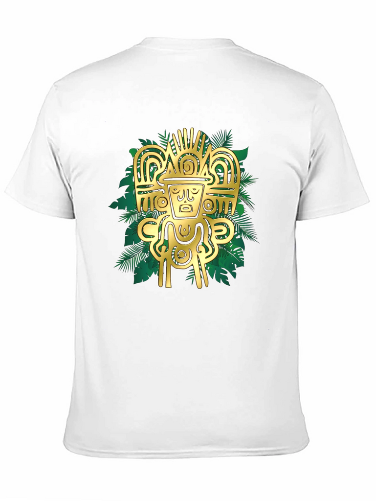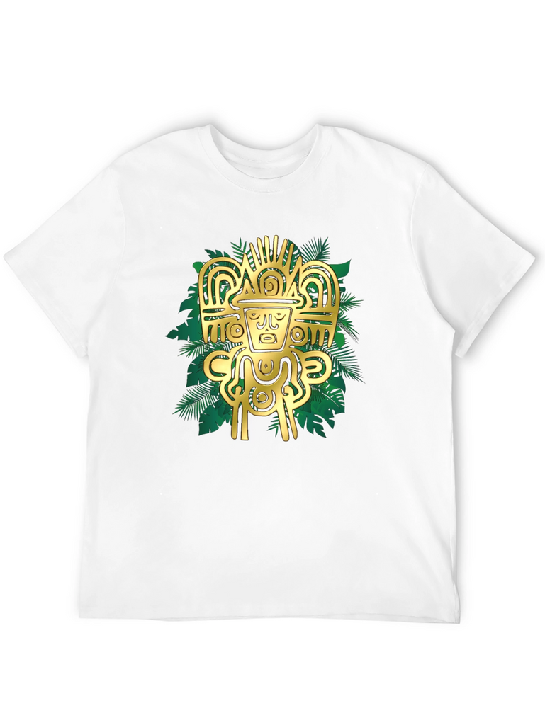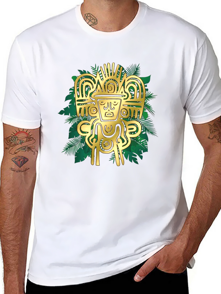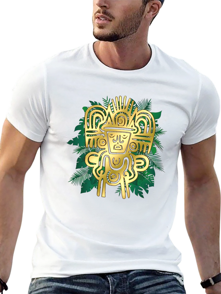 Elevate your style with this striking black t-shirt featuring a bold, golden Aztec-inspired graphic. The intricate design, set against a backdrop of stylized tropical leaves, creates a visually appealing contrast. Crafted from a comfortable, breathable fabric, this tee is perfect for casual wear or making a statement. Pair it with jeans or shorts for an effortlessly cool look. The design is sure to catch the eye and add a touch of mystique to any outfit. Experience the fusion of ancient art and modern fashion with this unique t-shirt.