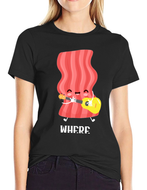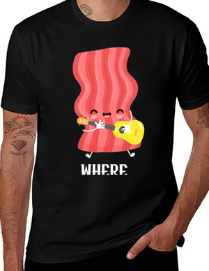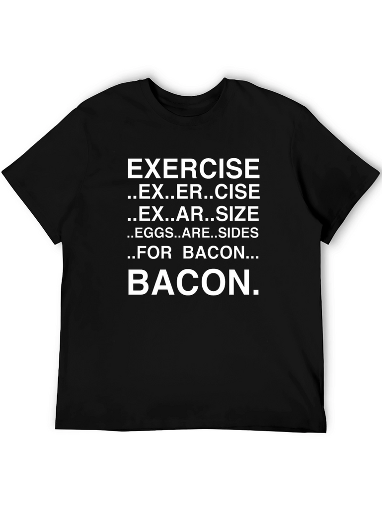 Show off your priorities with this humorous black t-shirt! Featuring a witty design in bold white text that reads "EXERCISE...EX..ER..CISE...EX..AR..SIZE...EGGS..ARE..SIDES..FOR BACON...BACON", this shirt is perfect for anyone who loves bacon more than hitting the gym. Made from a comfortable and breathable fabric, this tee is ideal for casual wear, weekend outings, or a fun statement piece. Grab yours and let everyone know where you stand on the exercise-bacon debate!