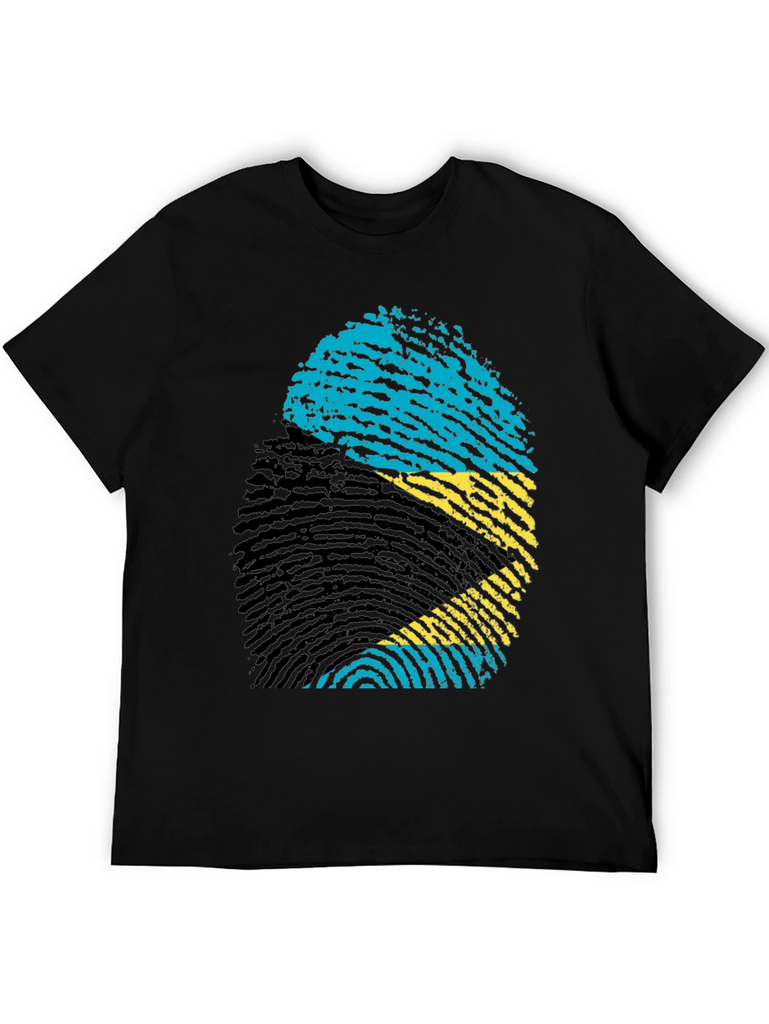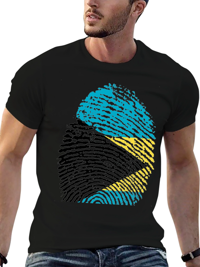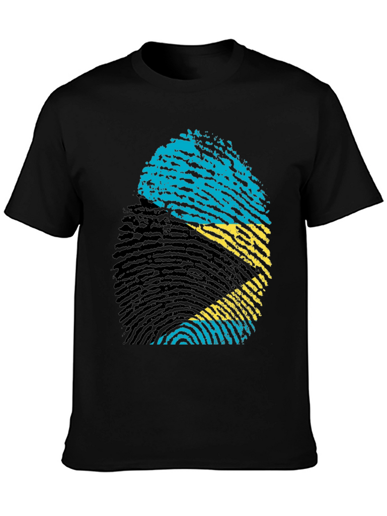 Show off your Bahamian pride with this unique black t-shirt! Featuring a bold fingerprint design in the colors of the Bahamas flag, this shirt is a stylish way to express your heritage. The eye-catching blue, yellow, and black print is sure to turn heads. Perfect for casual wear, sporting events, or simply representing your love for the Bahamas, this tee is a comfortable and conversation-starting addition to any wardrobe. Grab yours today and wear your Bahamian spirit with pride!