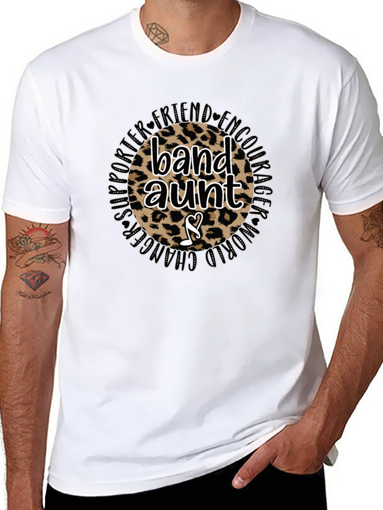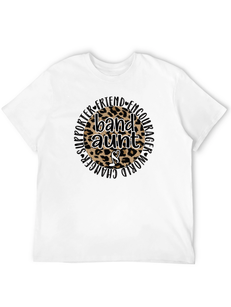 Show your support with this stylish "Band Aunt" graphic tee! This black t-shirt features a unique leopard print design with the words "Band Aunt" prominently displayed in the center. The design is surrounded by encouraging words like "Friend," "Supporter," and "World Changer," making it a perfect gift for a dedicated band aunt. Made from a comfortable fabric, this tee is ideal for casual wear, band events, or showing your pride at concerts and rehearsals. This shirt is a must-have for any proud band aunt who wants to stand out in style!