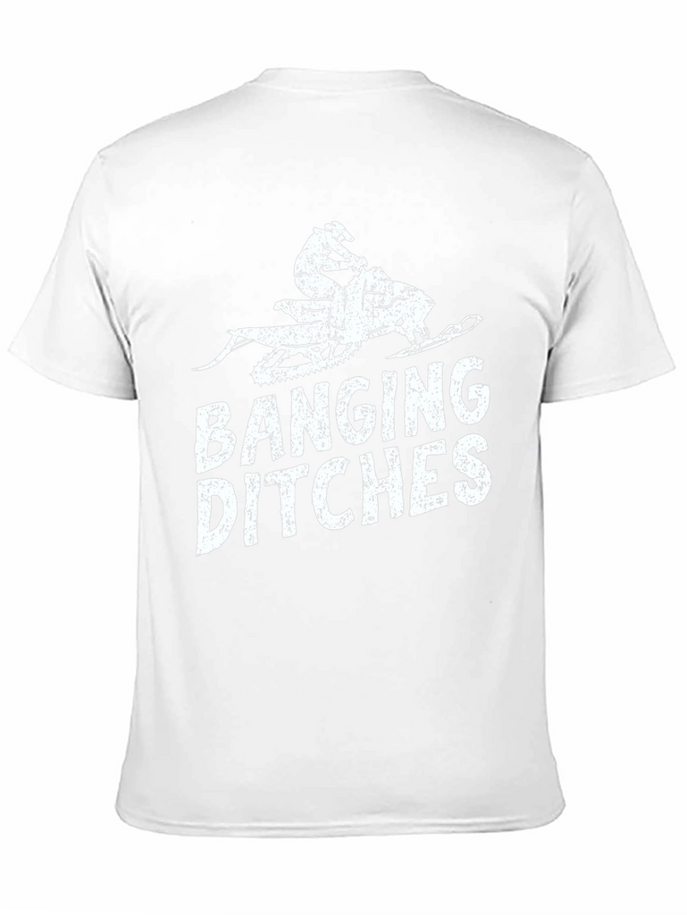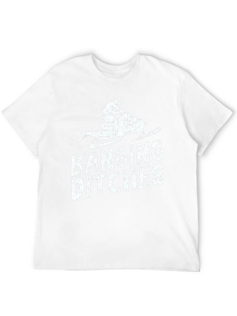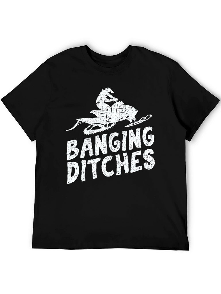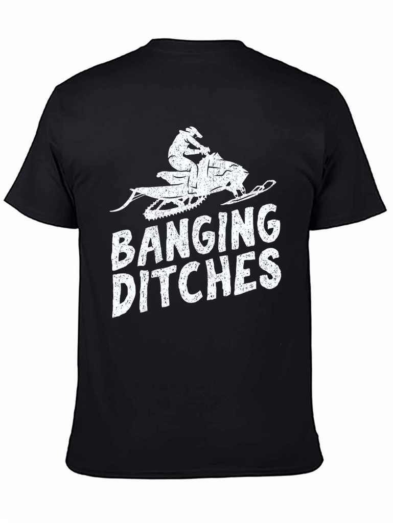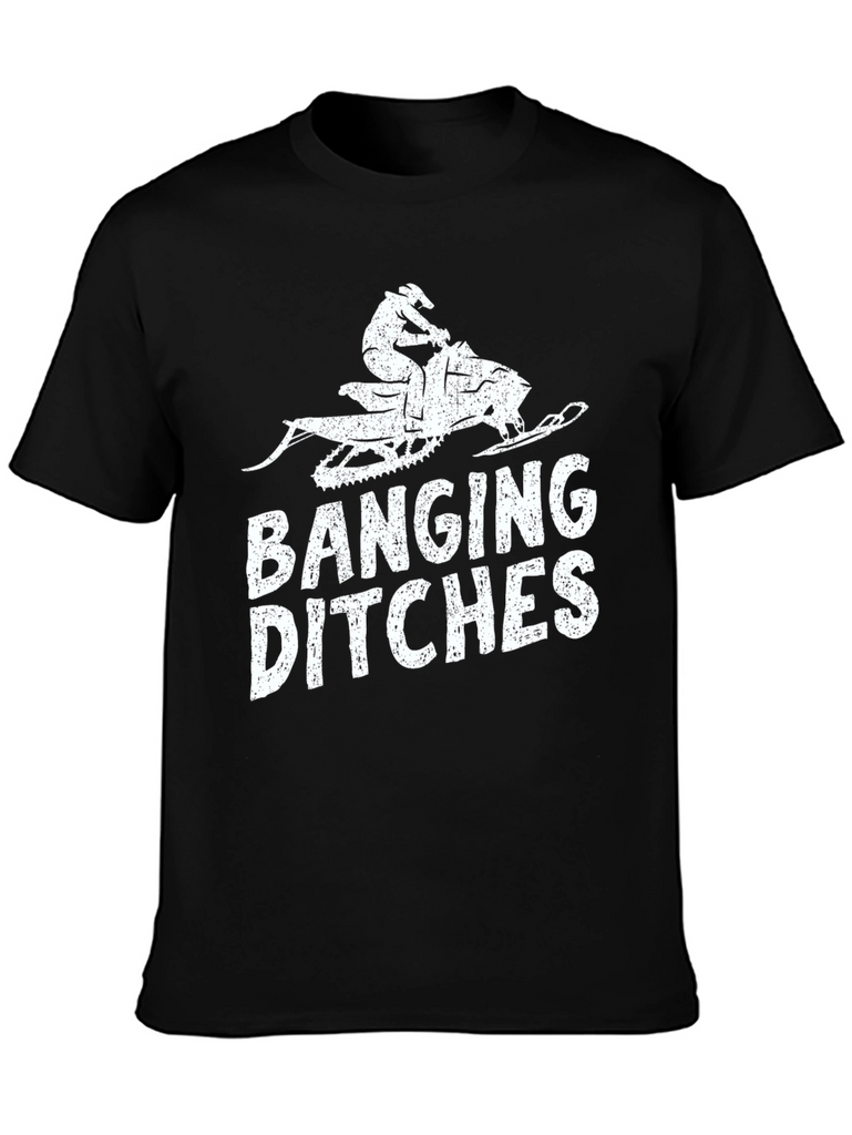 Hit the trails in style with this "Banging Ditches" graphic tee. The black t-shirt features a distressed-style print of a snowmobile and rider, paired with bold lettering. Made from what appears to be a comfortable cotton blend, this short-sleeve shirt offers casual comfort for everyday wear. Perfect for snowmobiling enthusiasts, winter sports lovers, or anyone with a sense of humor, this tee is sure to turn heads. Wear it while out on the snowmobile, at the lodge, or just hanging out with friends. A cool gift for the snowmobiler in your life.